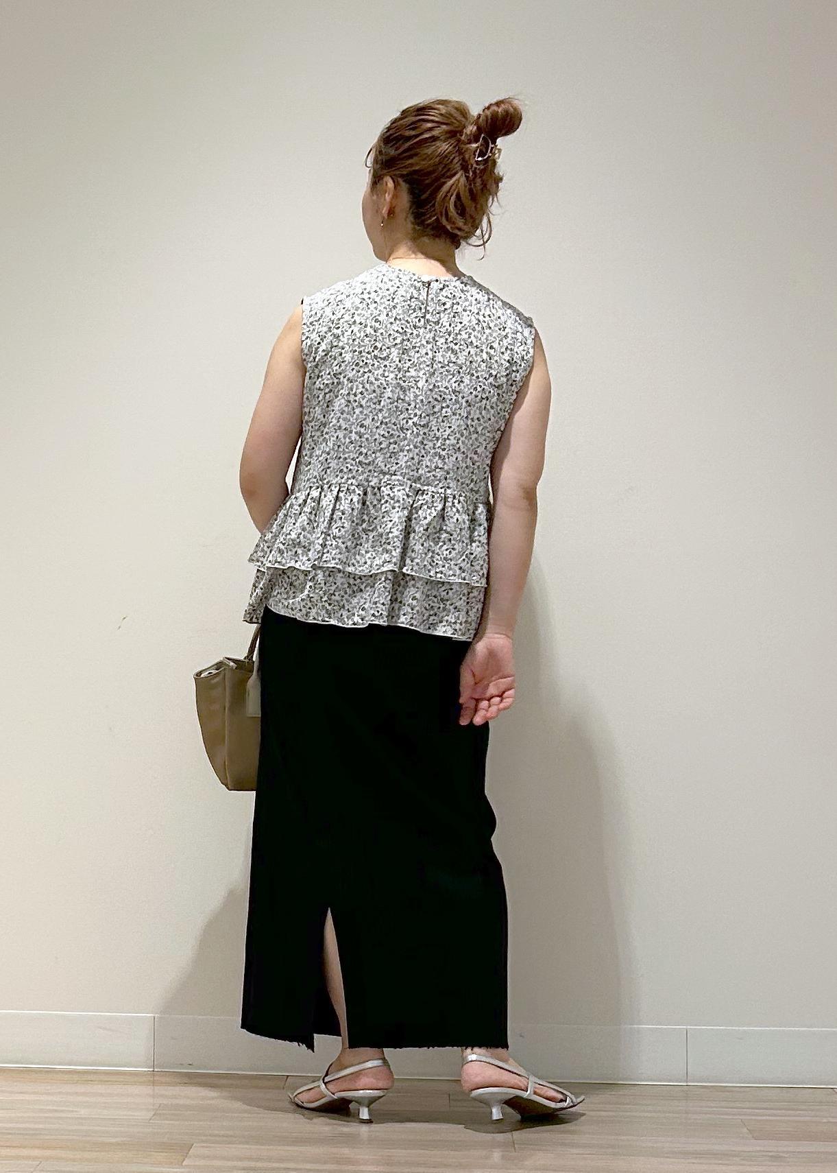 甘めな小花柄ブラウスには、ブラックのアイラインスカートで合わせ、大人っぽく落ち着いた印象のコーディネートにしてみました。