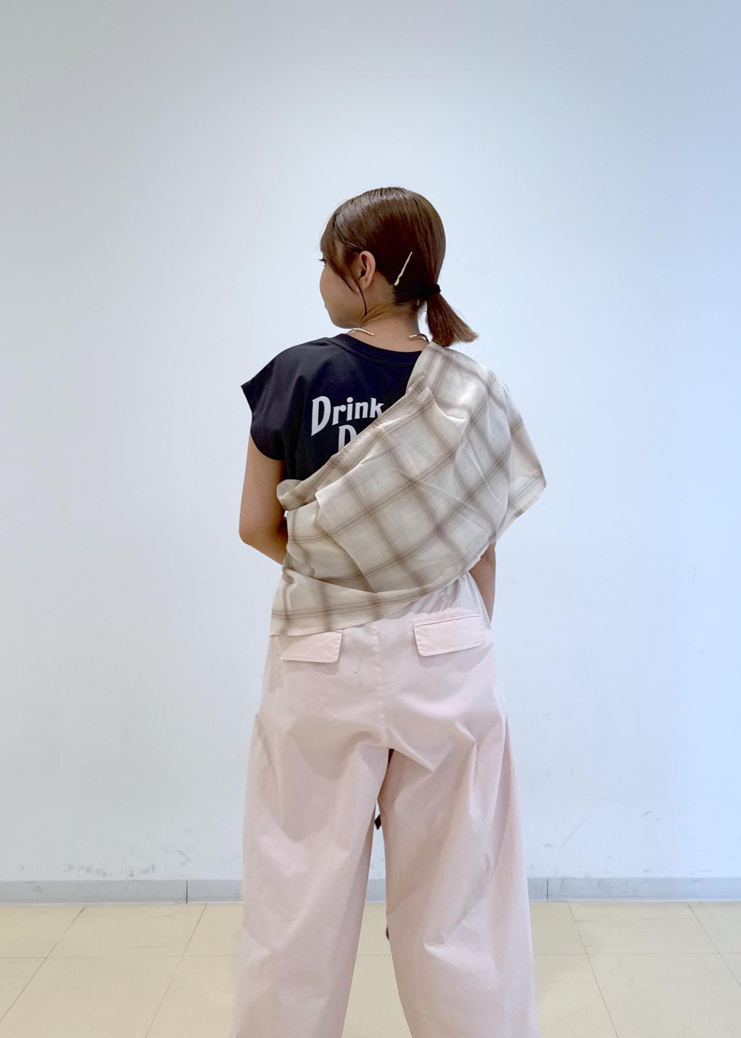 チェック柄のシアーシャツを襷掛けし、より秋らしさをプラスしました♪