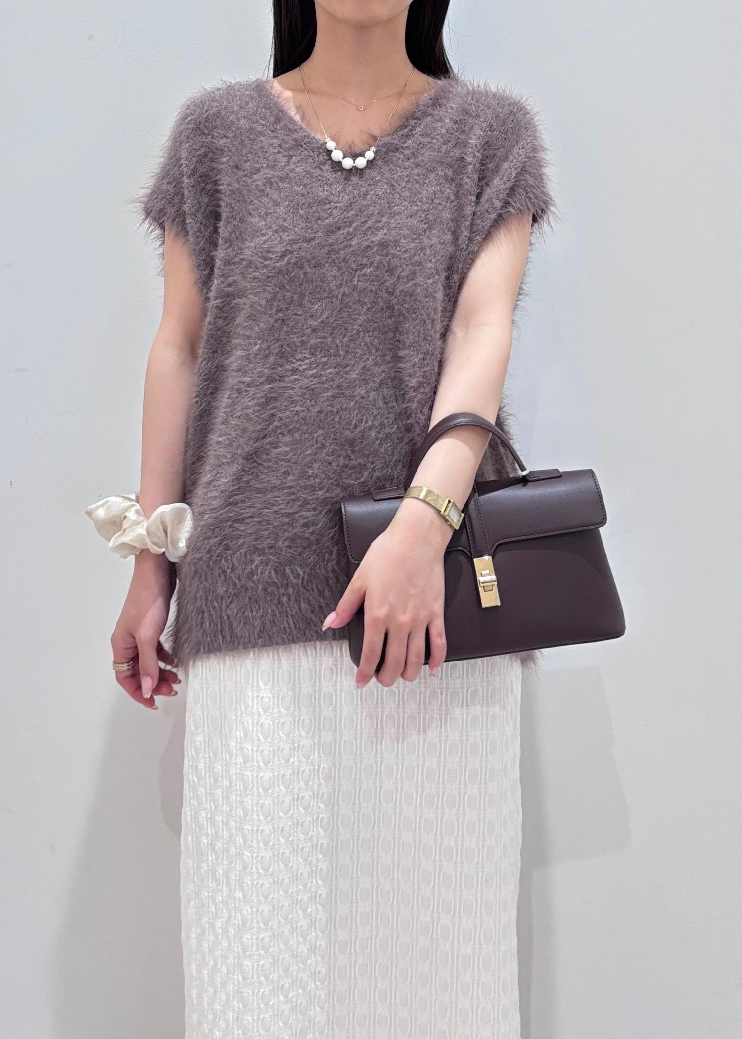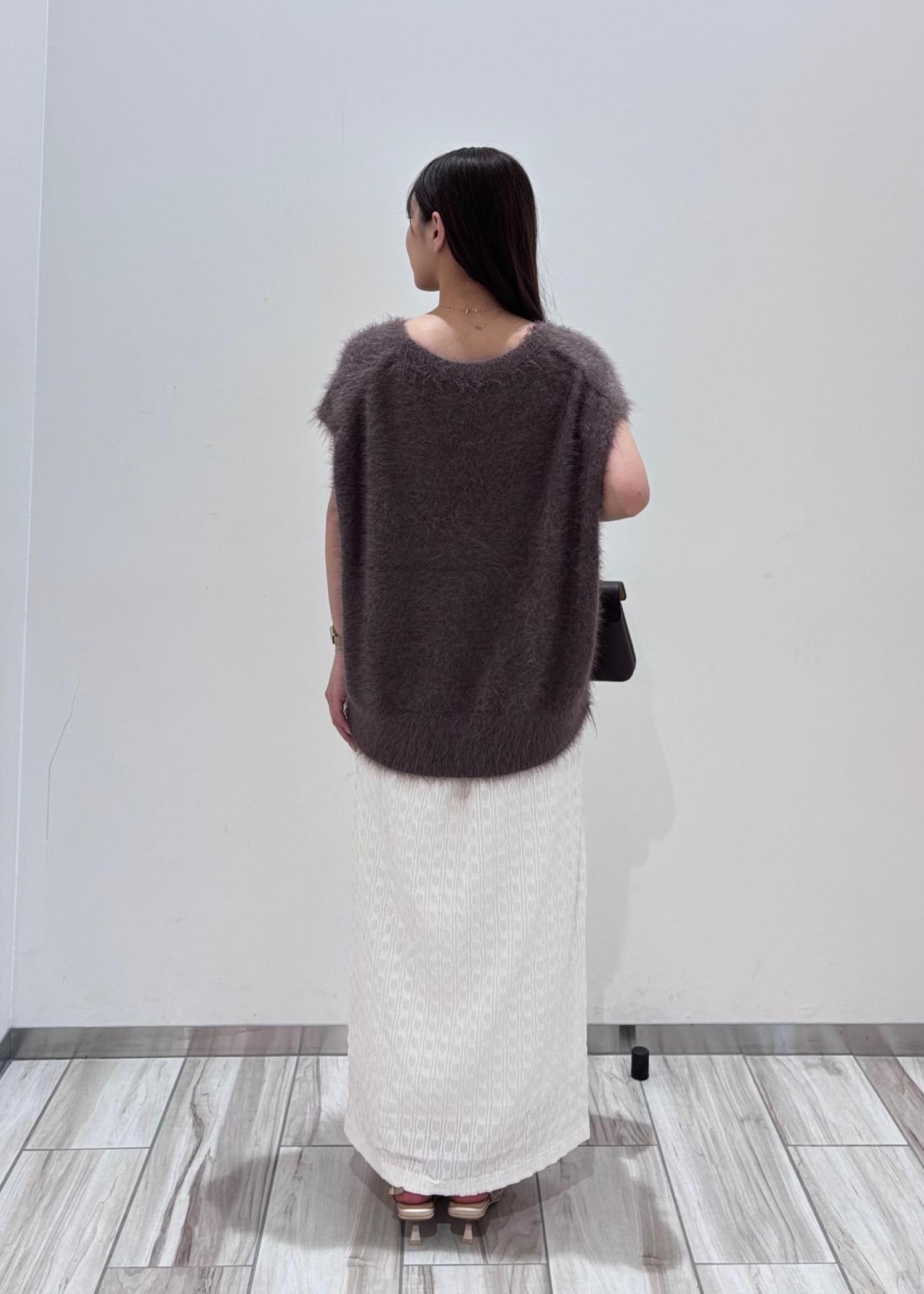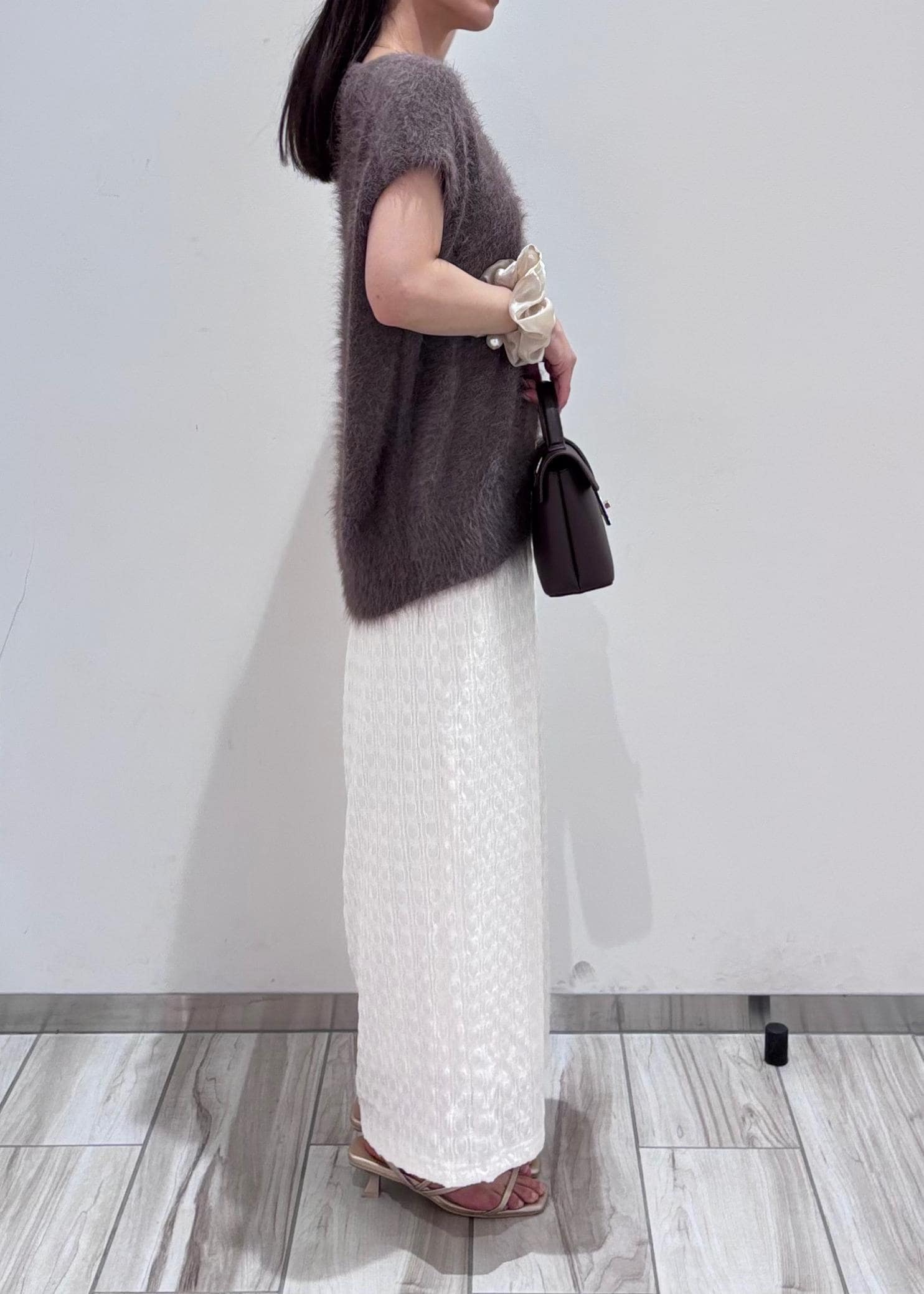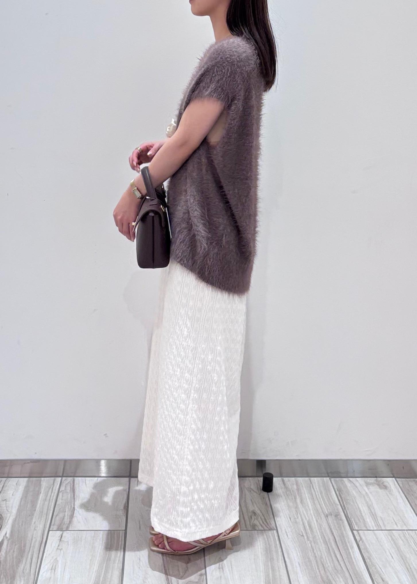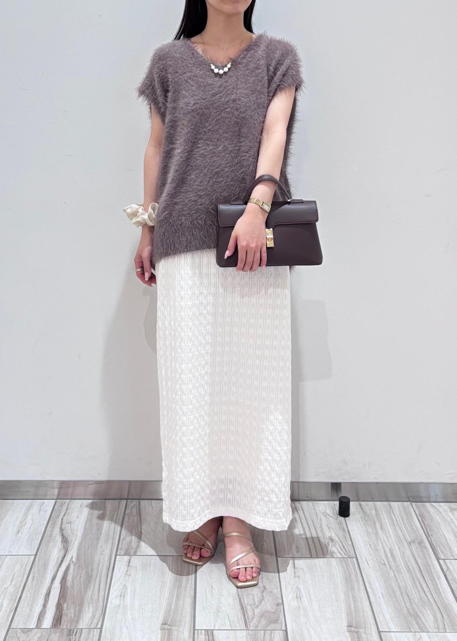 ロング丈のフェザーベストと白スカートでゆったりとした大人の余裕感のある女性らしいコーデにしてみました。足元はヒールのサンダルで抜け感を出し、毛足の長いフェザー生地でも重たくない印象に♪