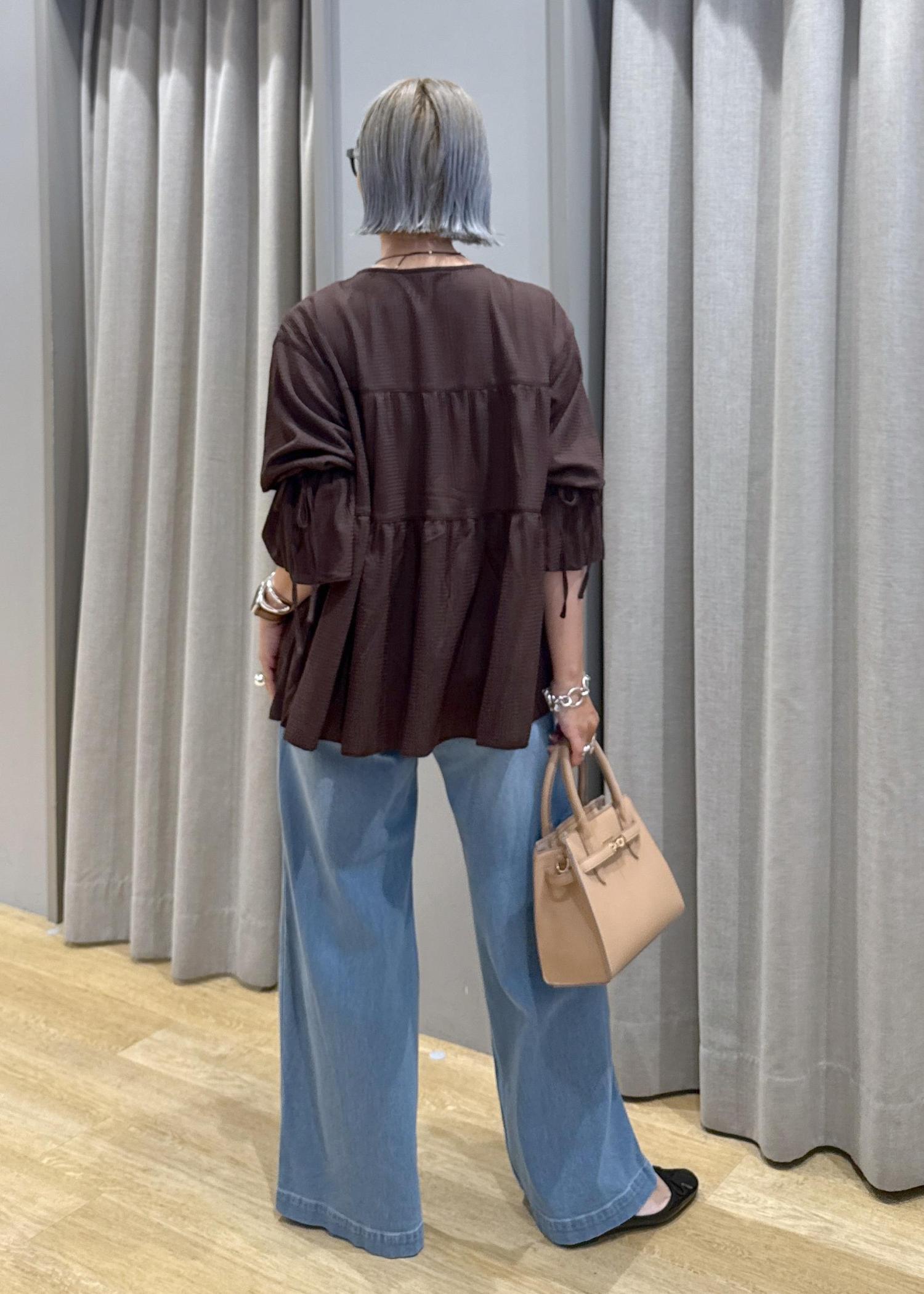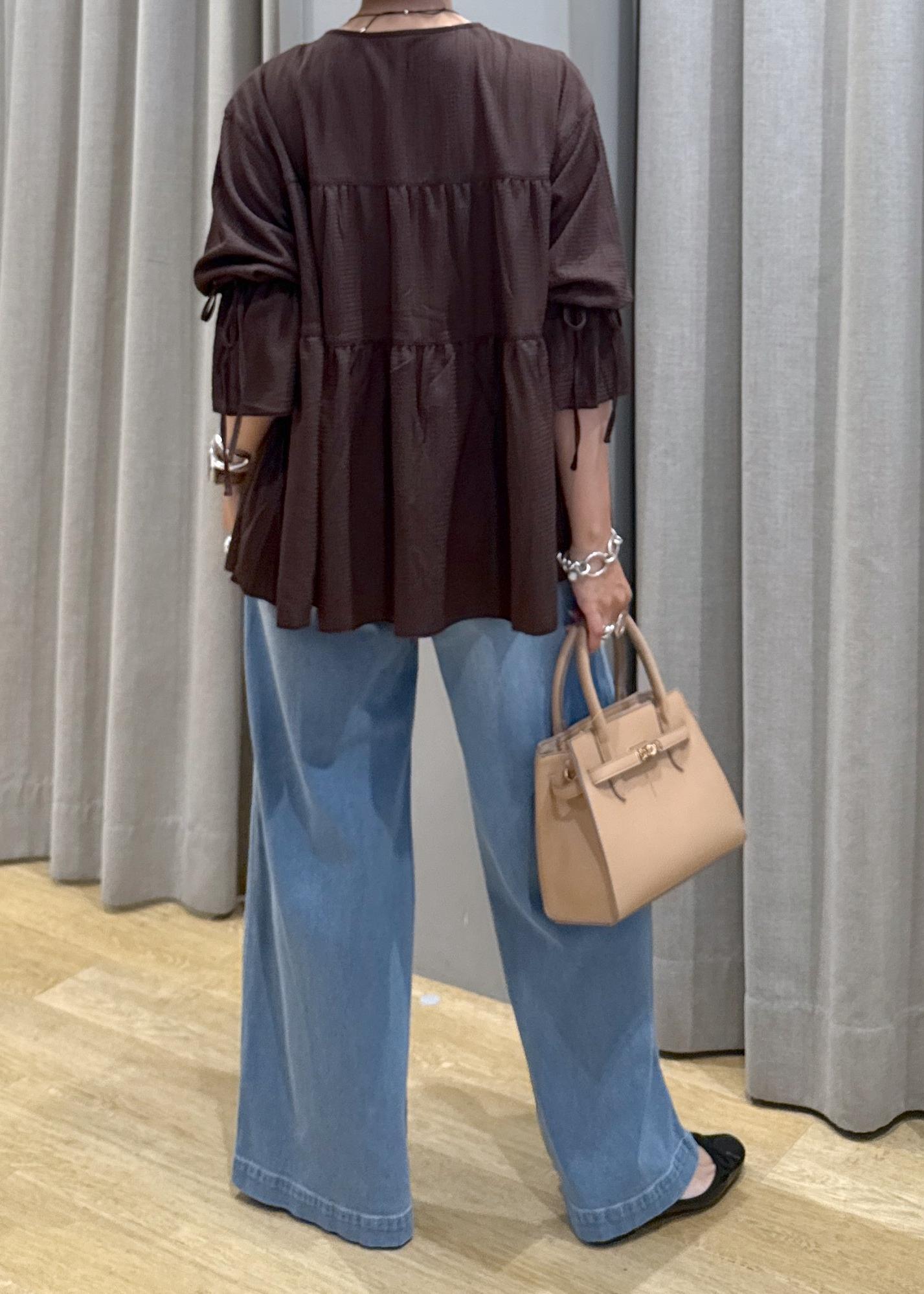 ボリュームスリーブとペプラムラインがフェミニンで可愛い