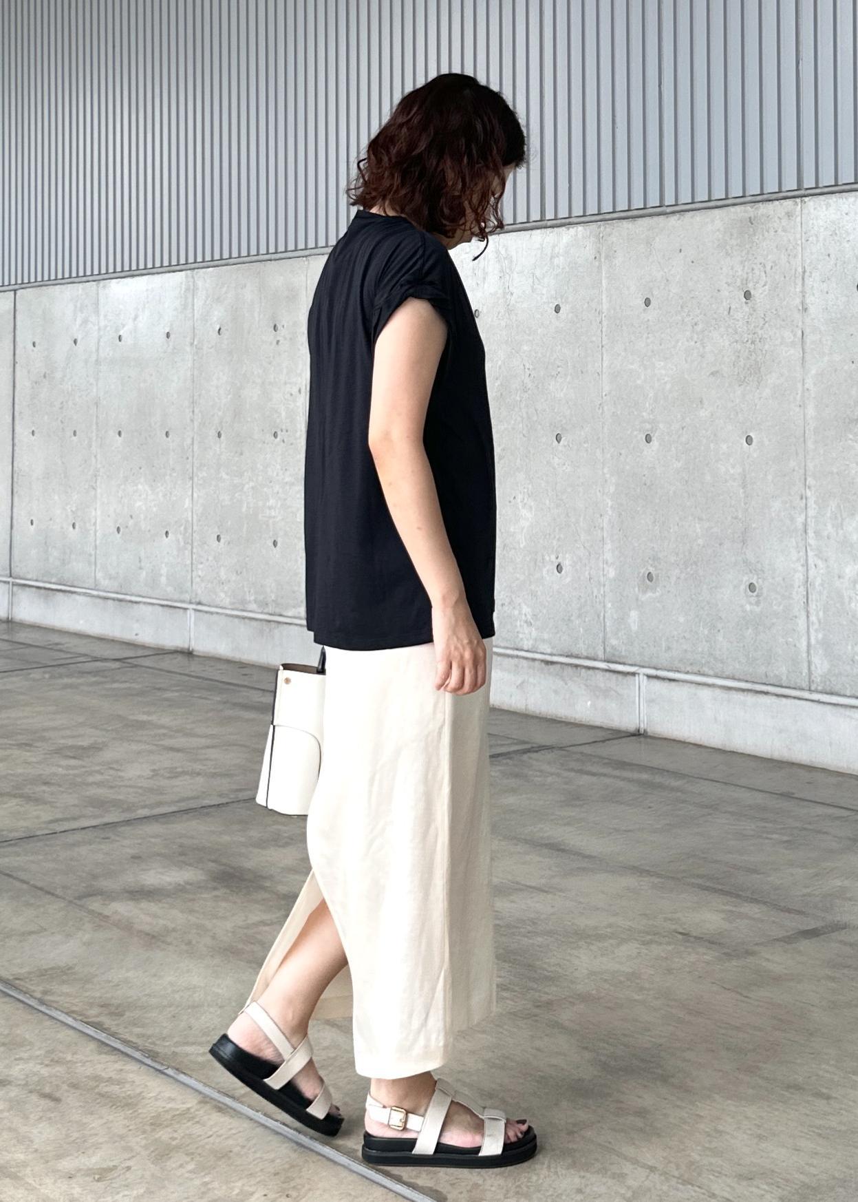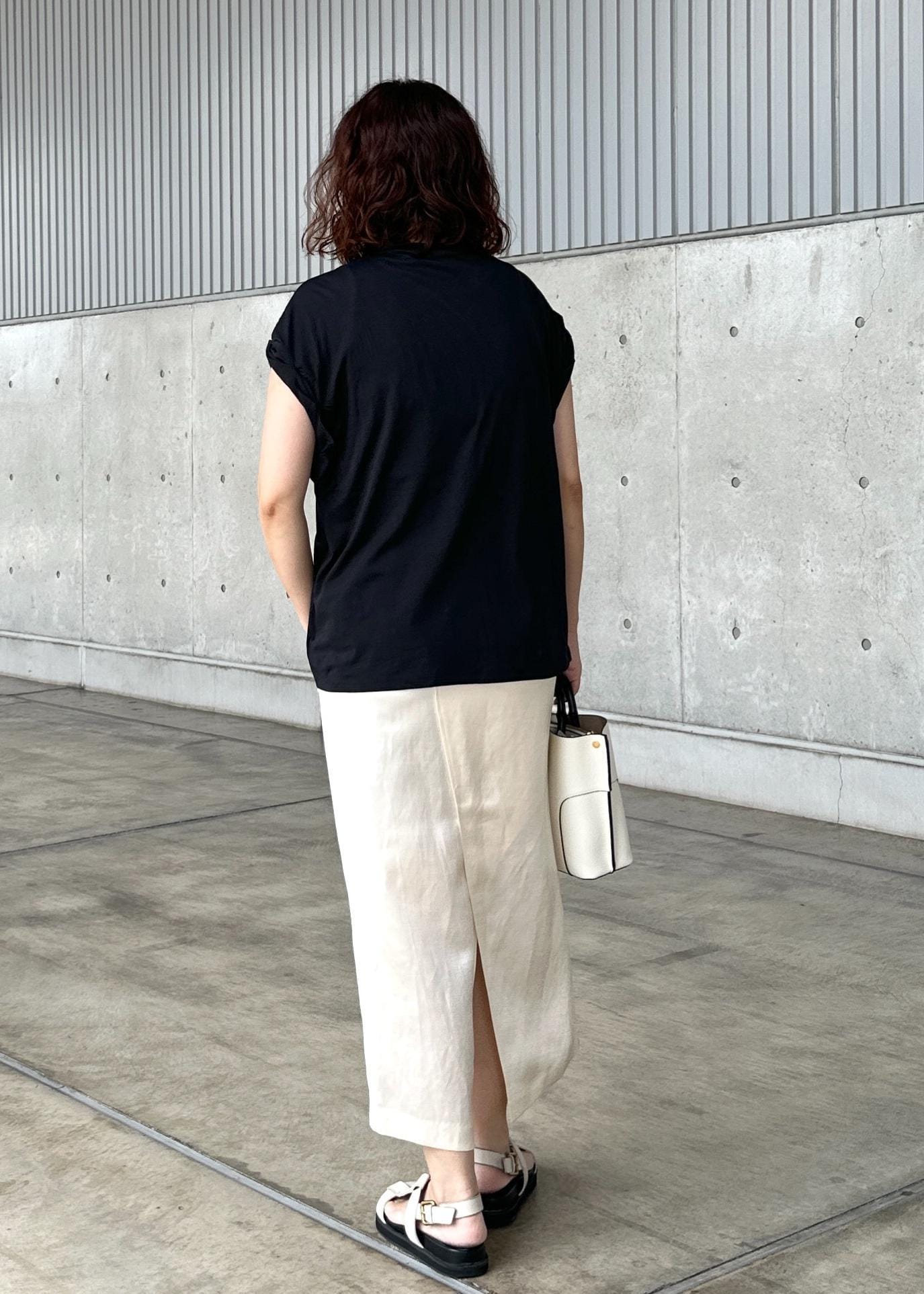 丈が長めのタイトスカートですがスリットがしっかり入っているので歩きにくさは特に感じません。光沢のある素材でシンプルながら華やかさもあるのでお出かけにも使いやすいアイテムです。 -