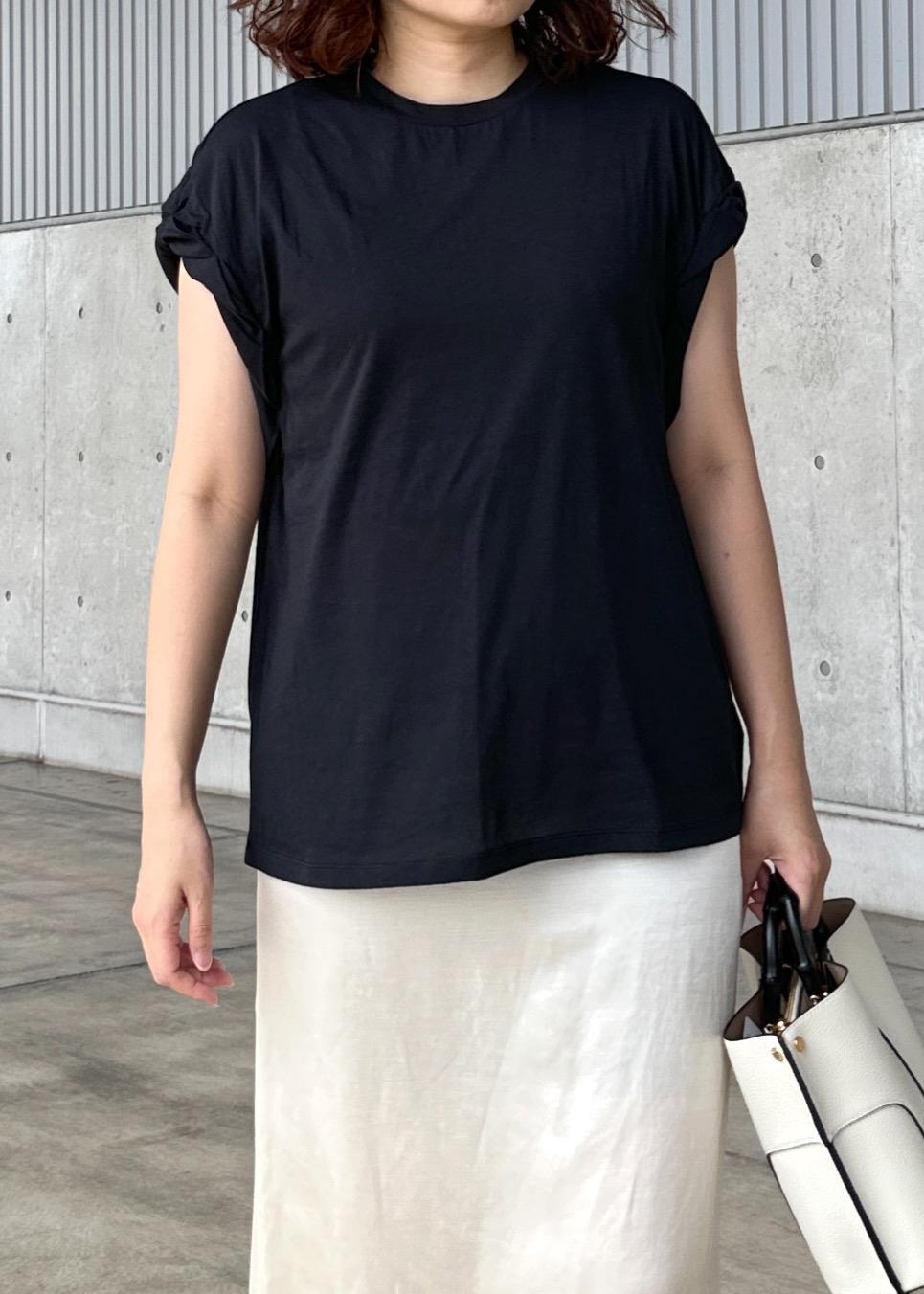 1枚でサクッと着やすい袖口にひねりを加えた夏のデザインTシャツです。