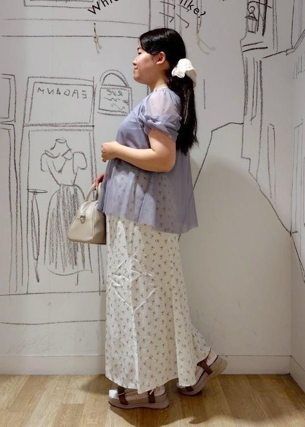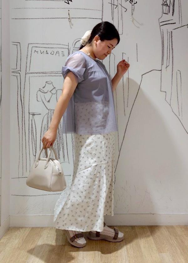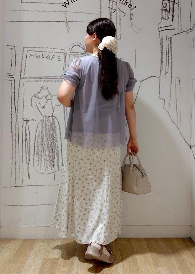 シアー素材と花柄スカートを合わせたフェミニンコーデ