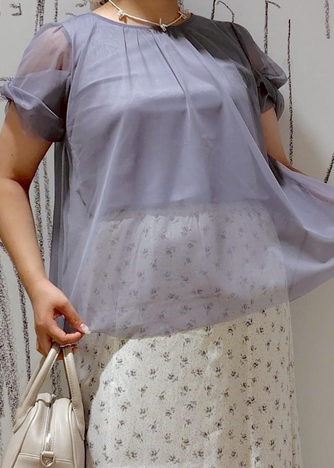 透けないしっかりとした生地の上にシアー素材が重なっている涼しげなトップスです。