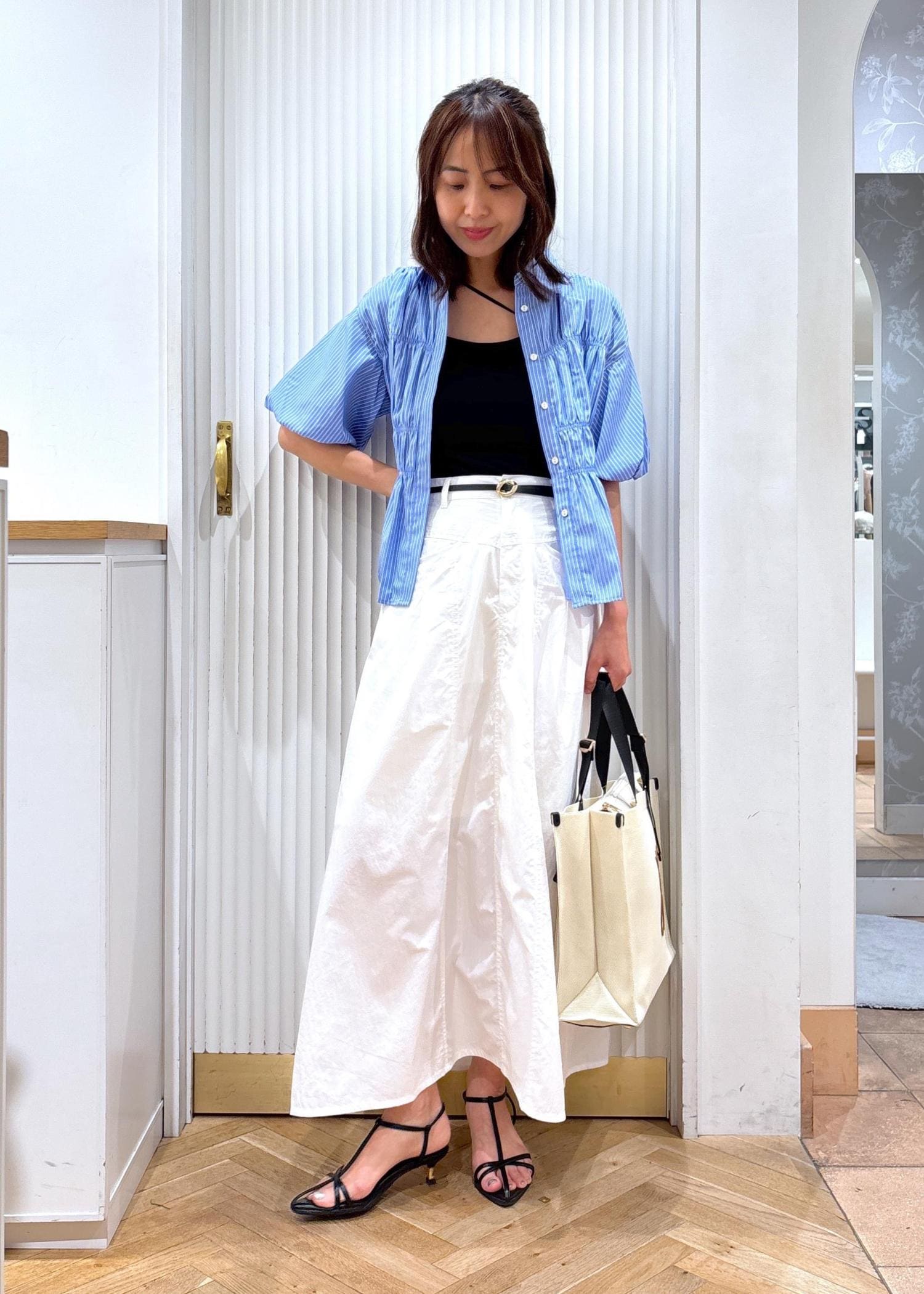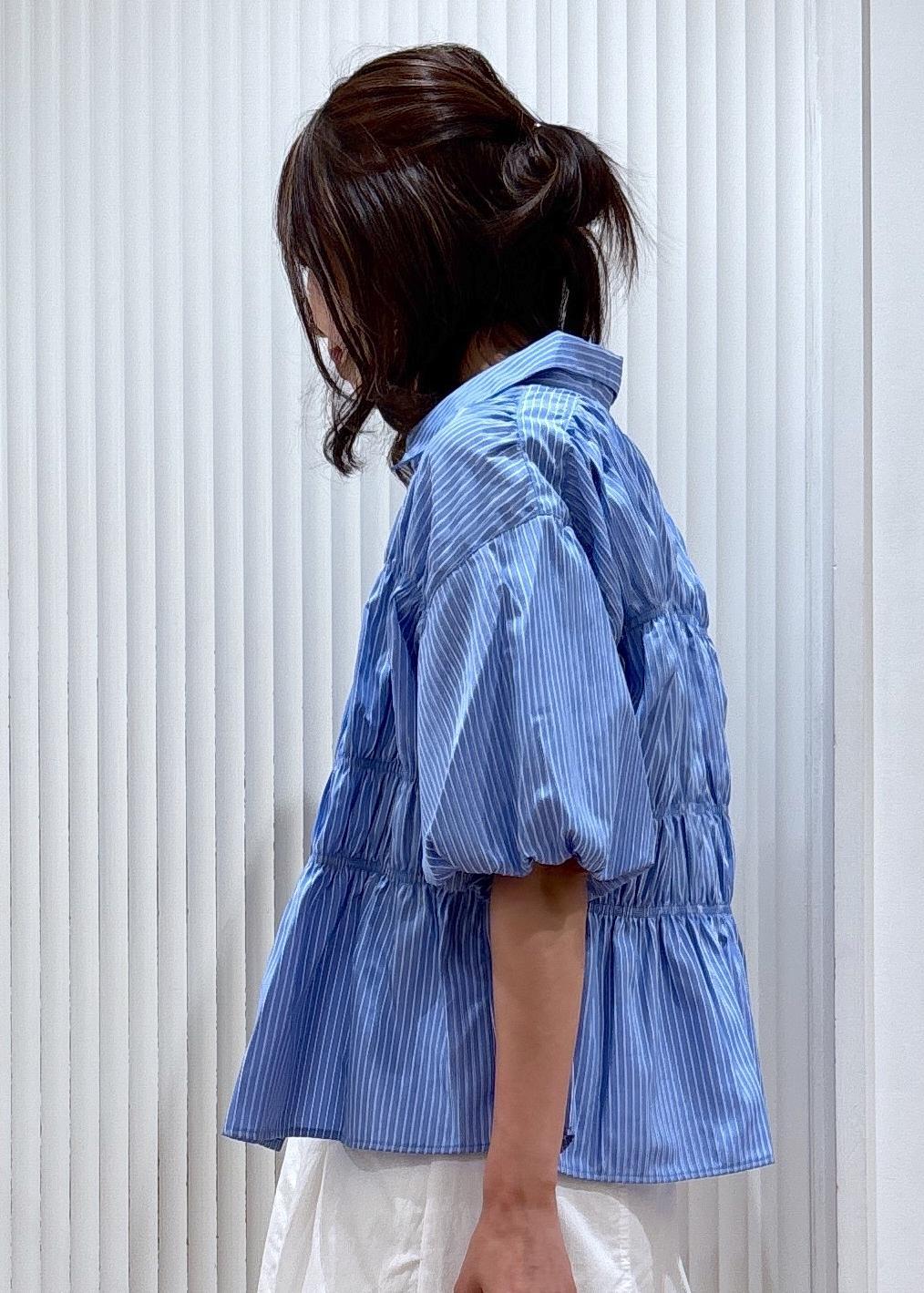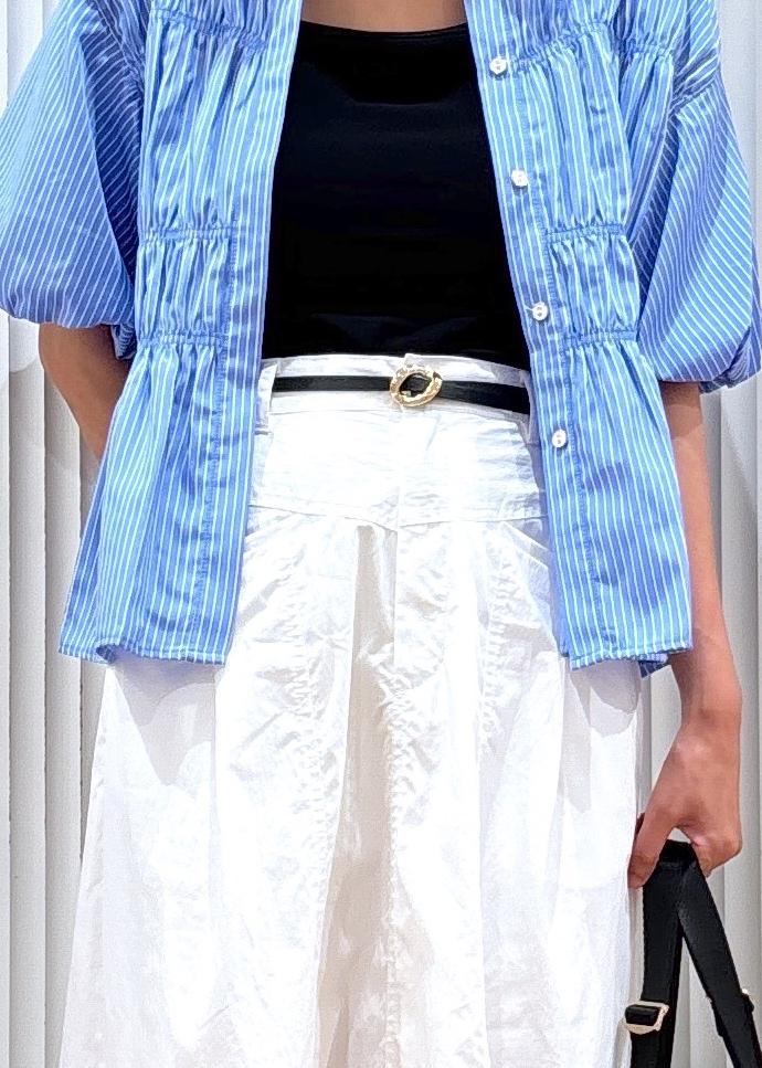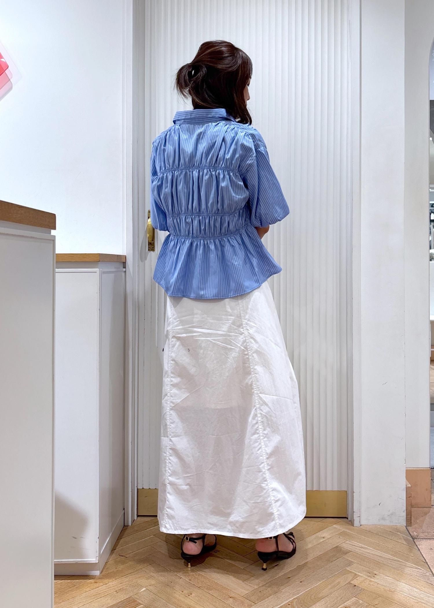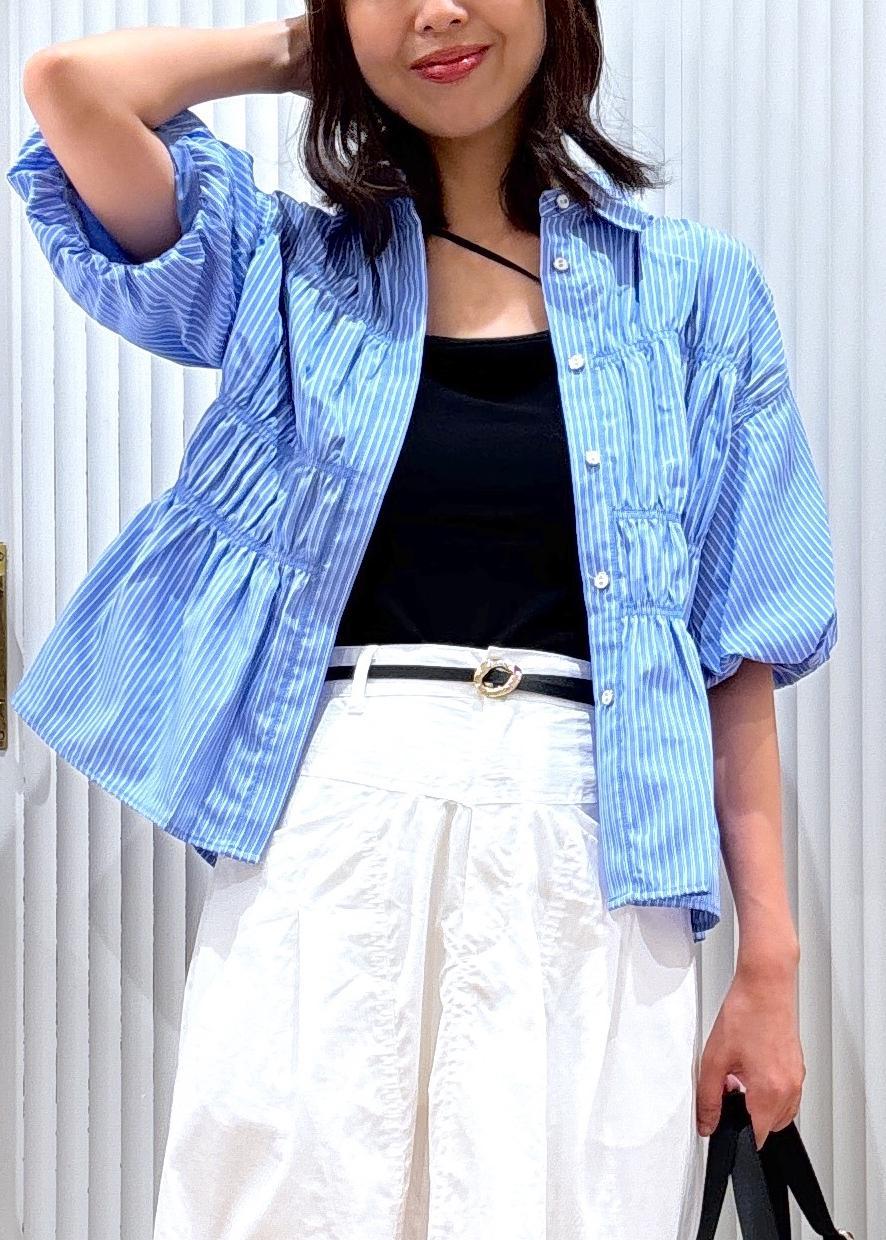 シャーリングシャツは前開きにして、すっきりまとめました。