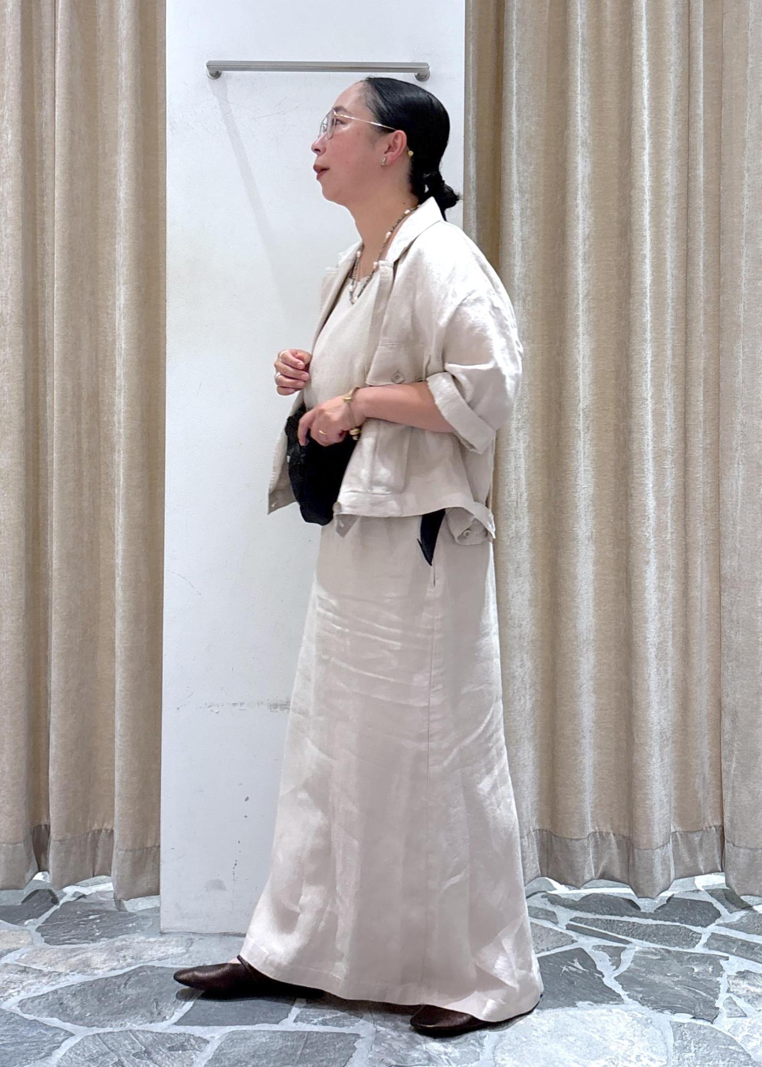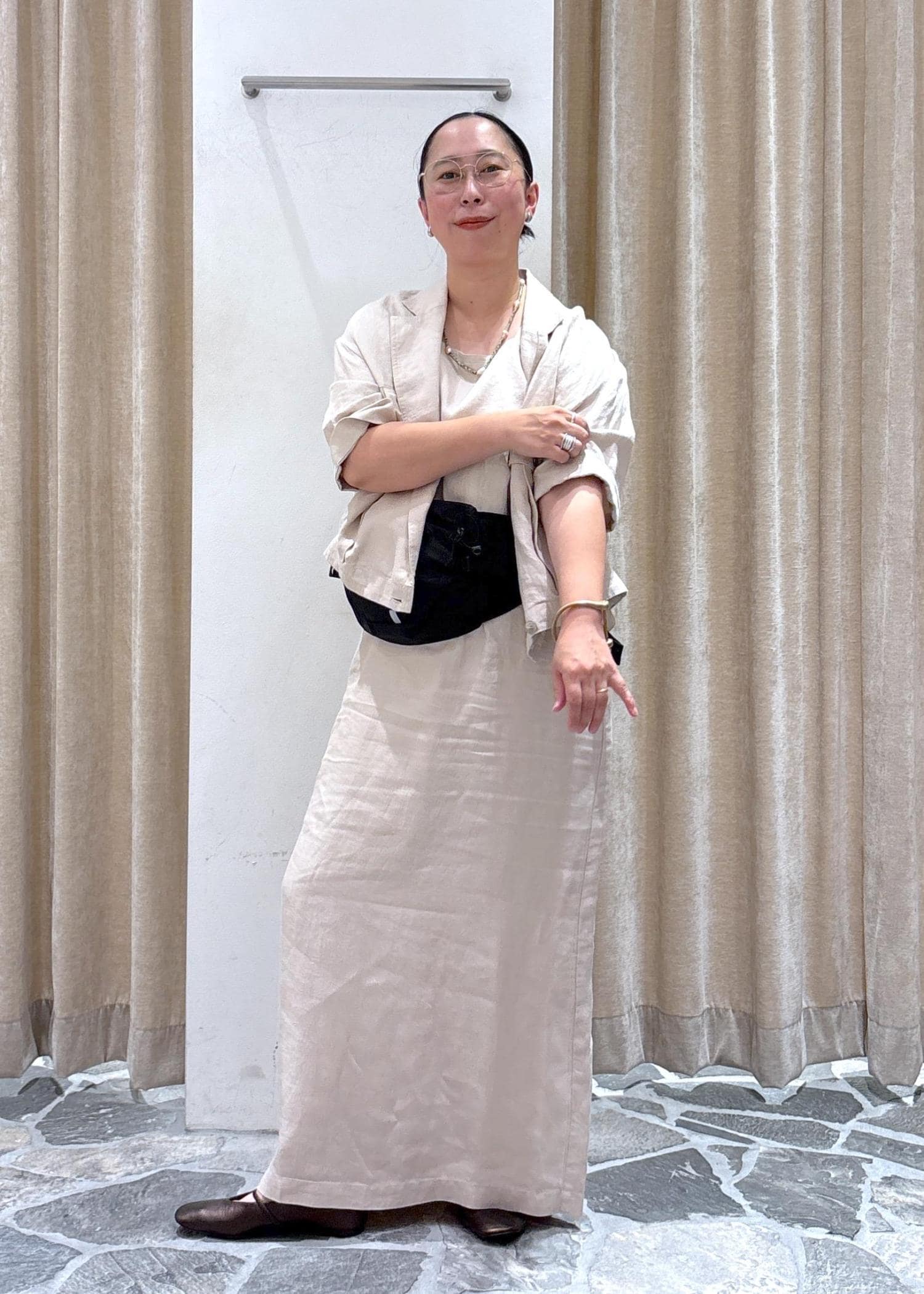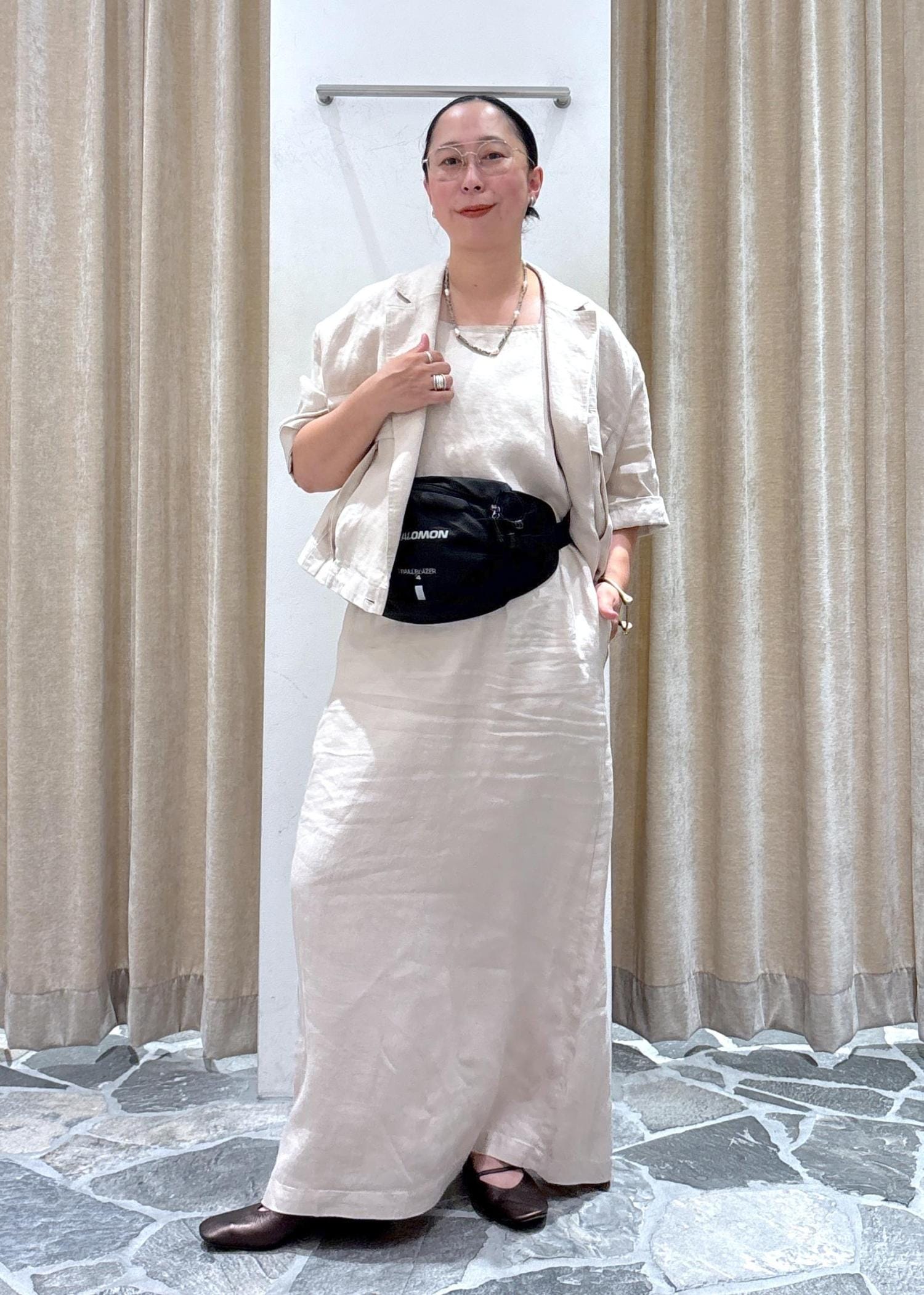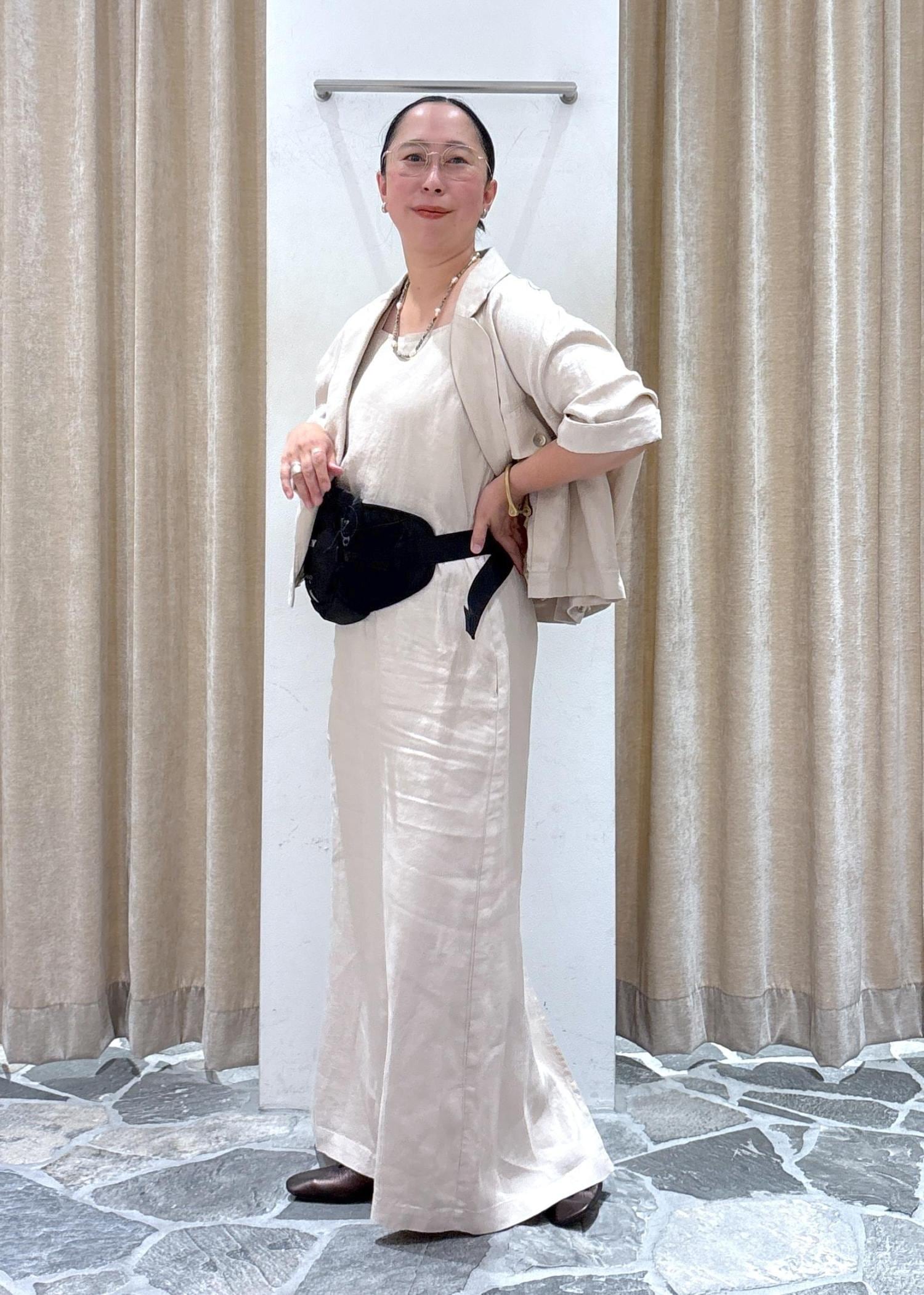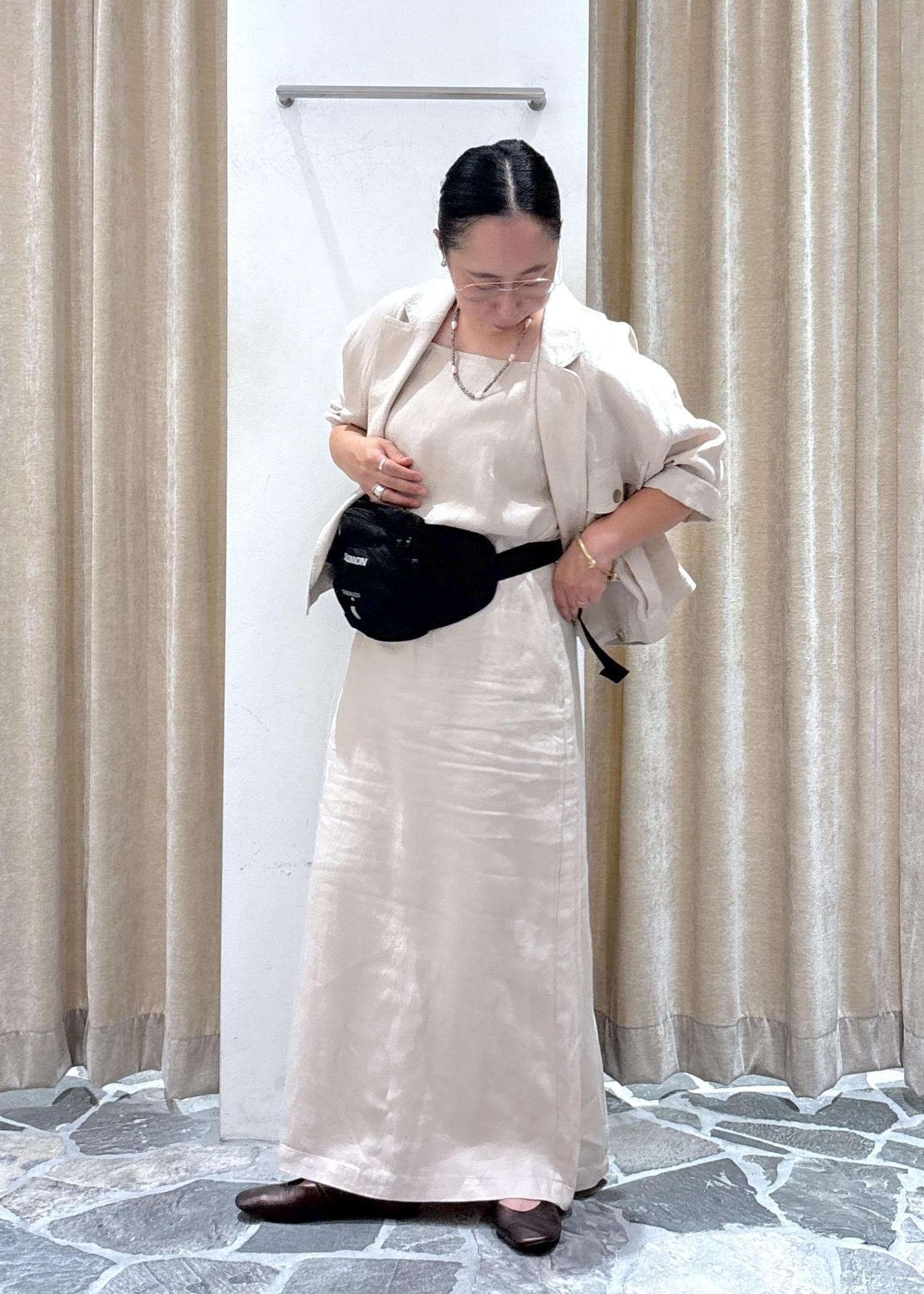 リネンツイルのセットアップに、スポーティーなバッグで抜け感をプラスしてみました。