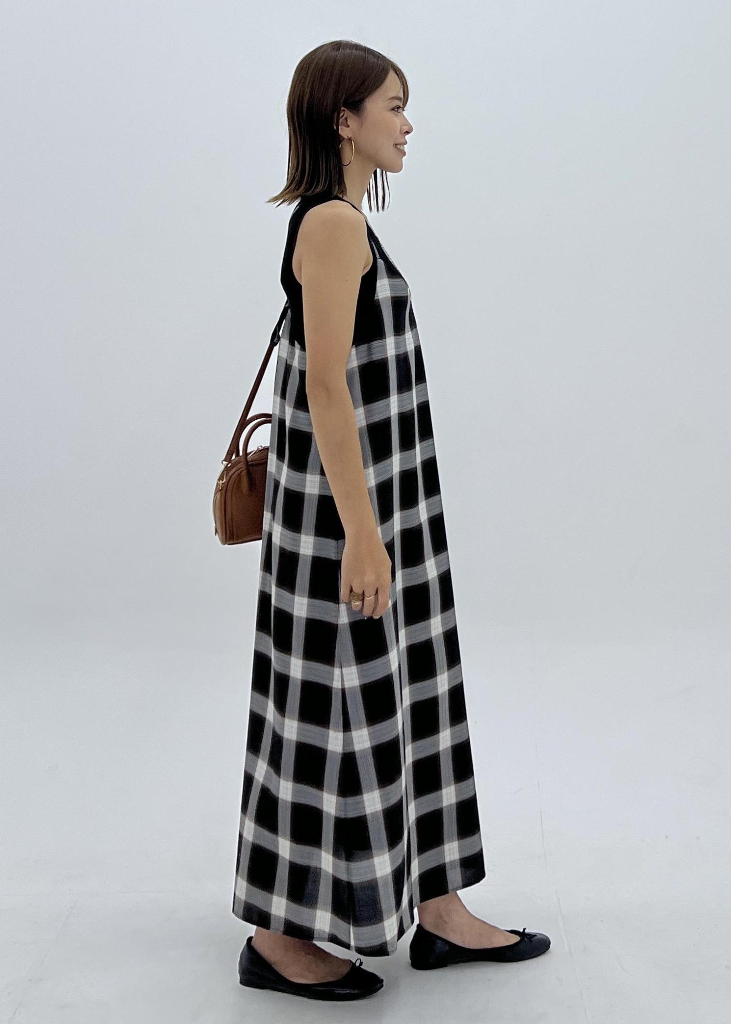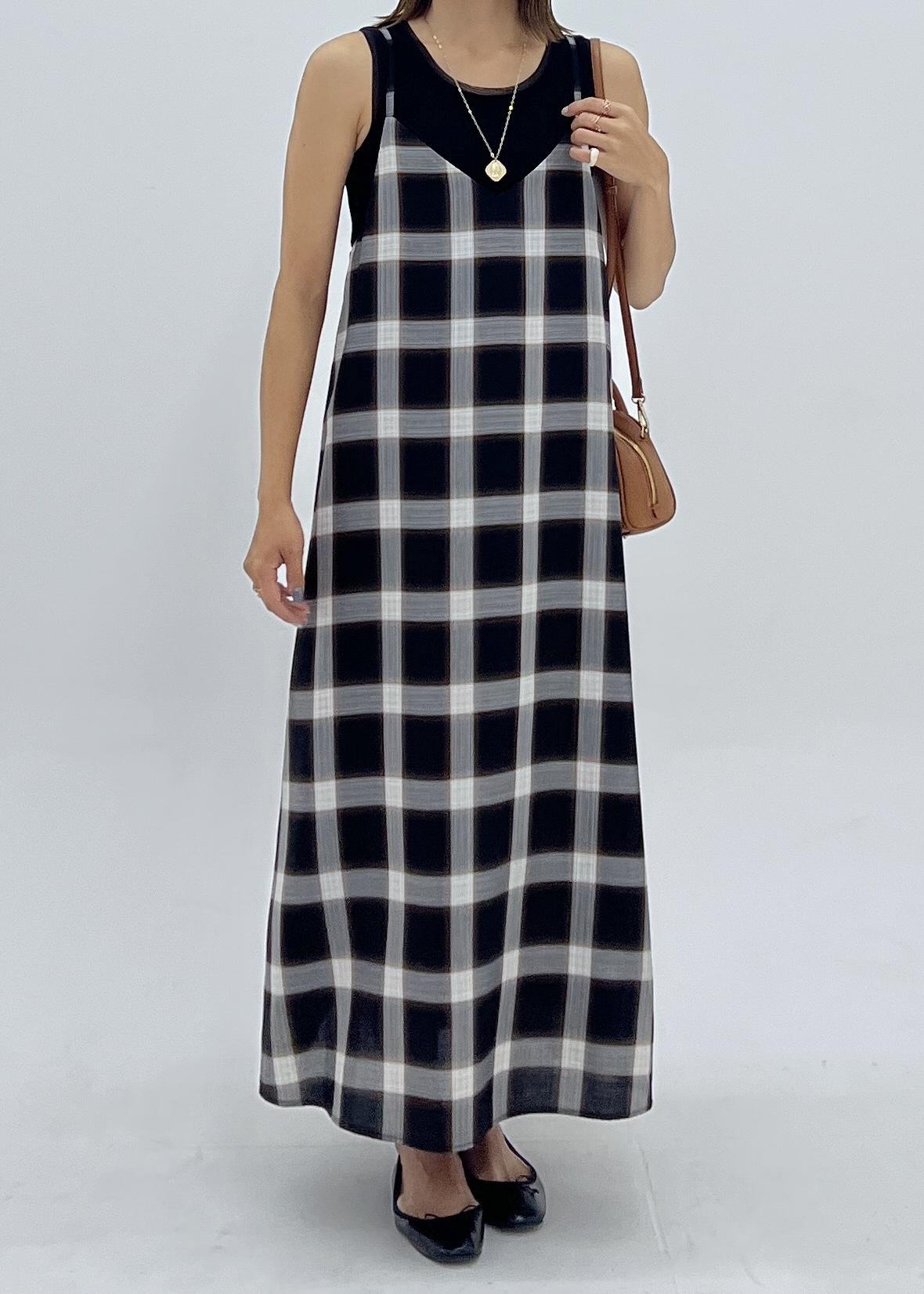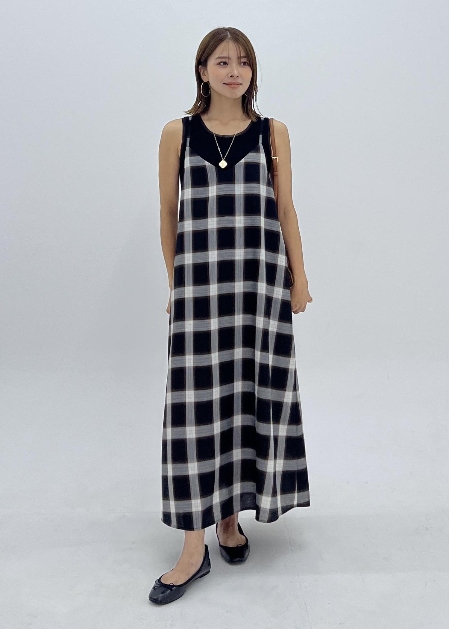秋も着回しできるチェック柄のキャミワンピースは、夏のブラックコーデにも。