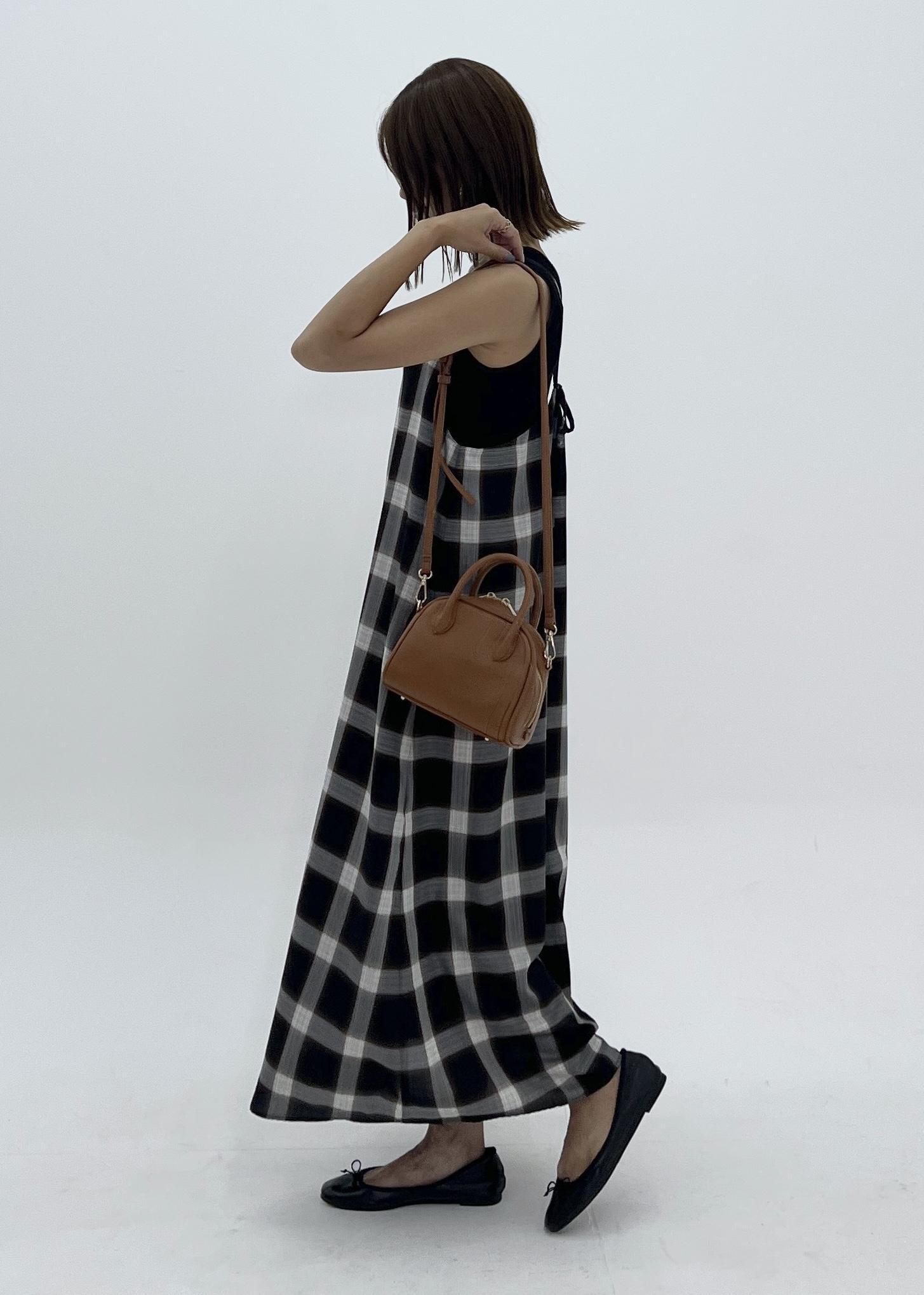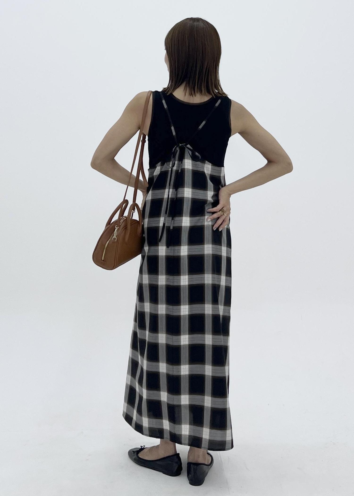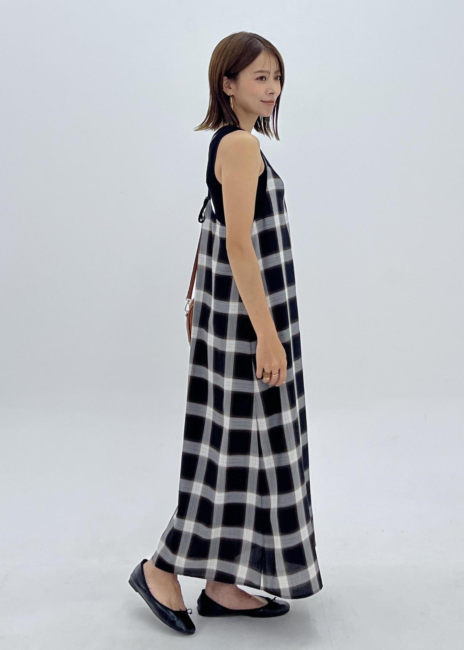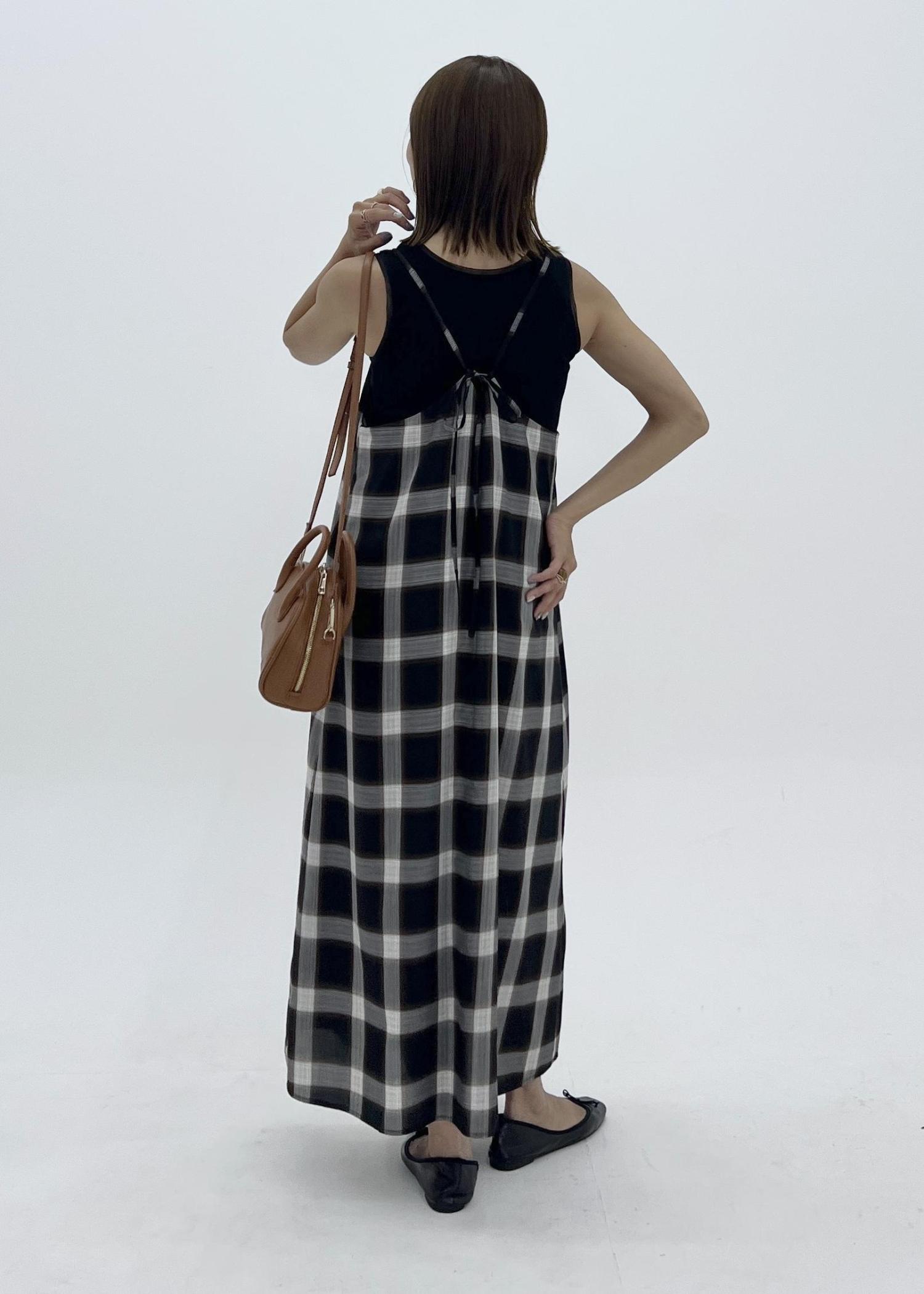 秋も着回しできるチェック柄のキャミワンピースは、夏のブラックコーデにも。