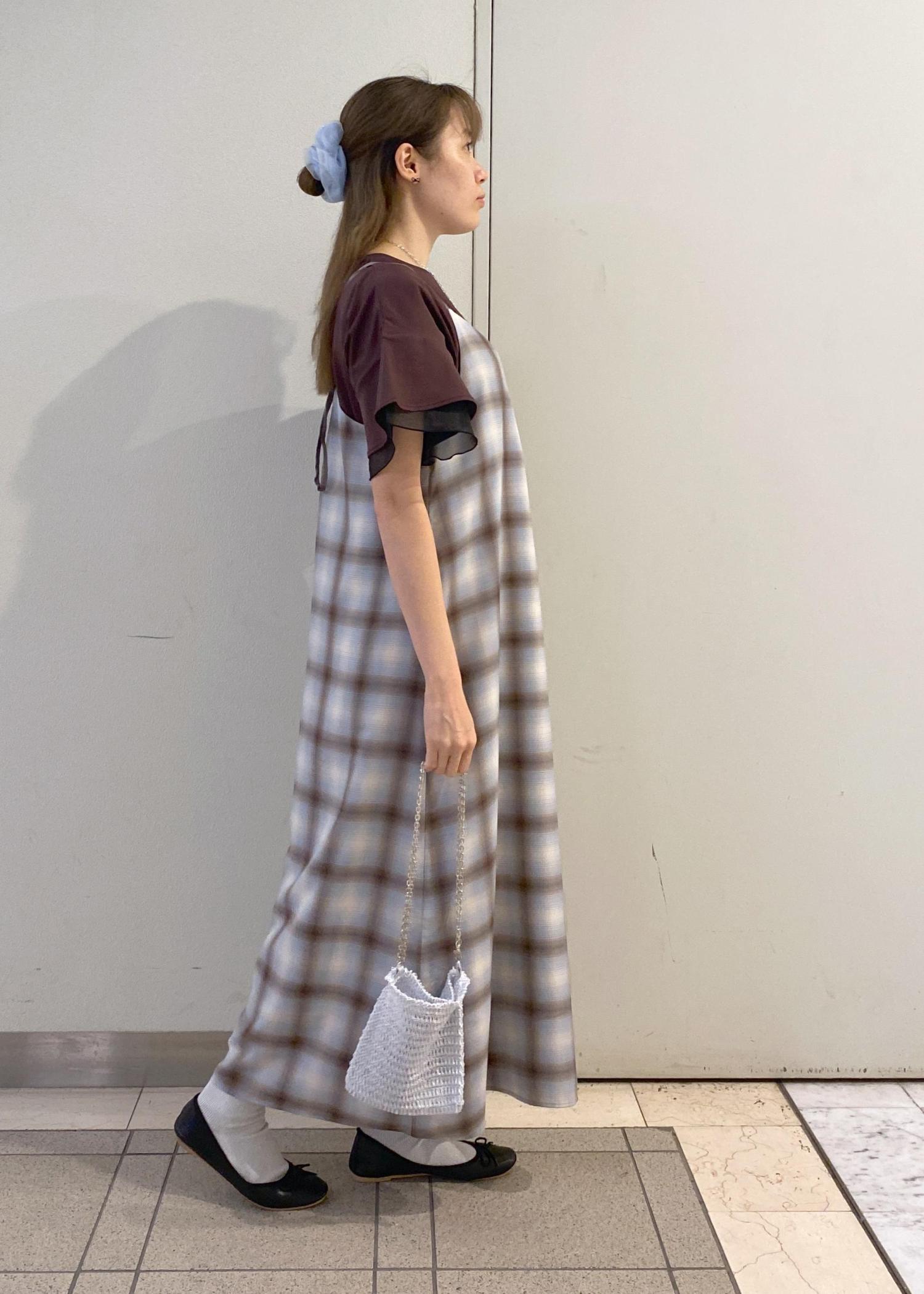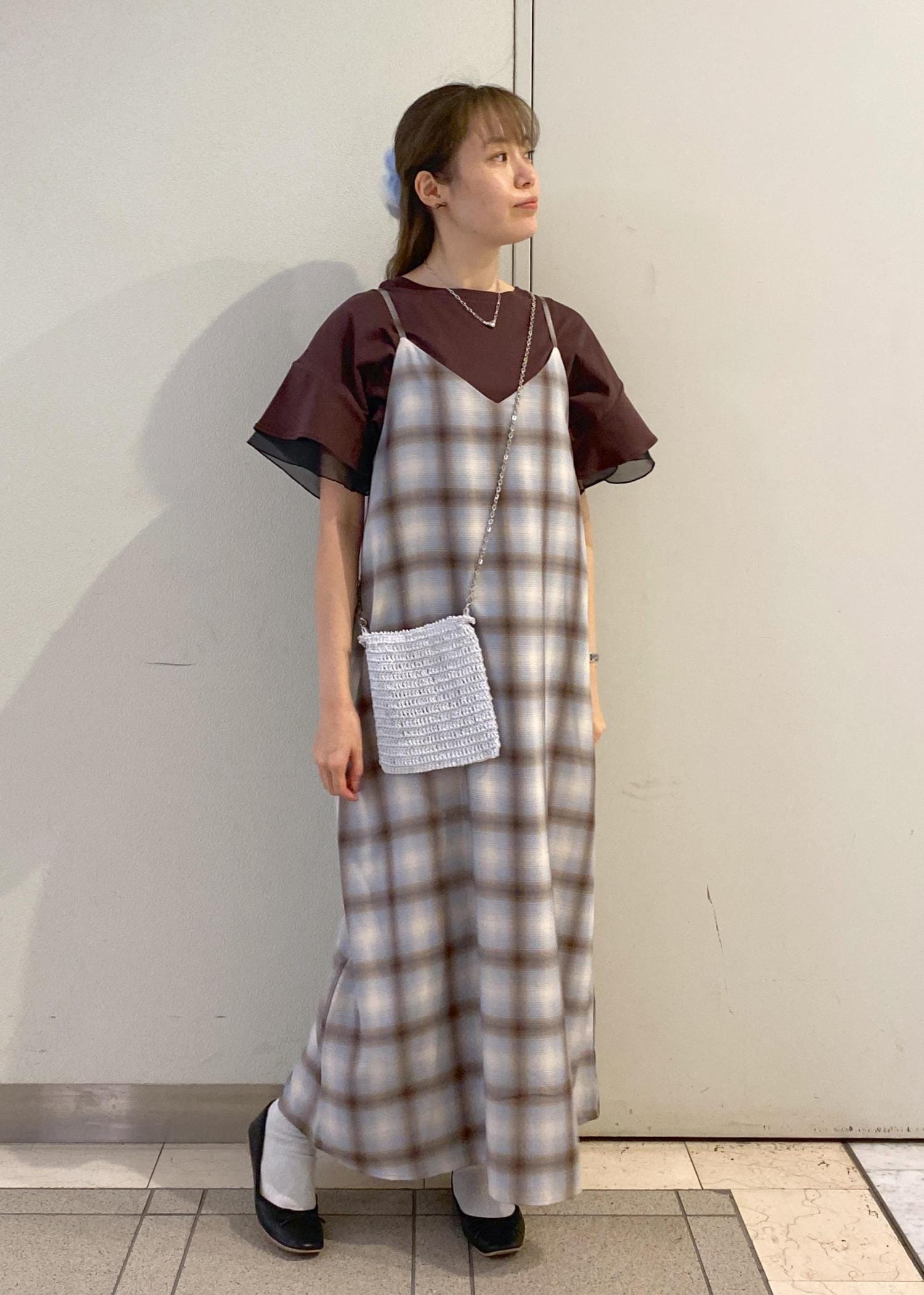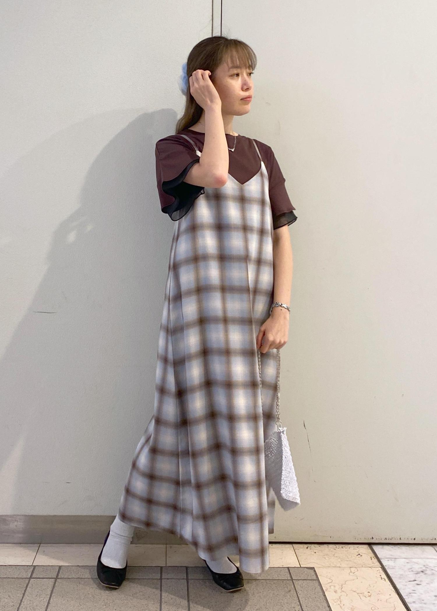 ワンピースに合わせてブラウスのトップスをレイヤードした、大人カジュアルなコーディネートです。