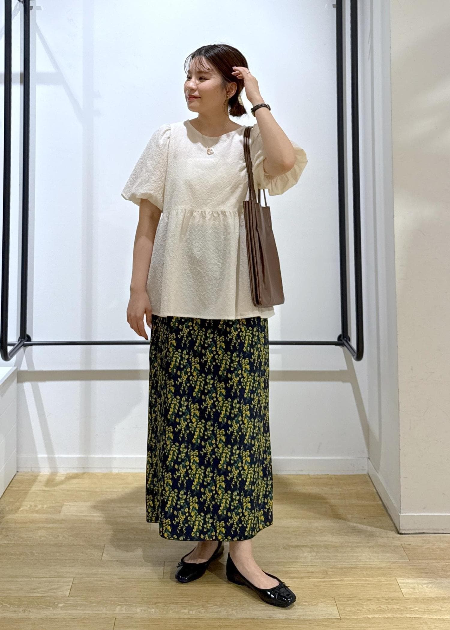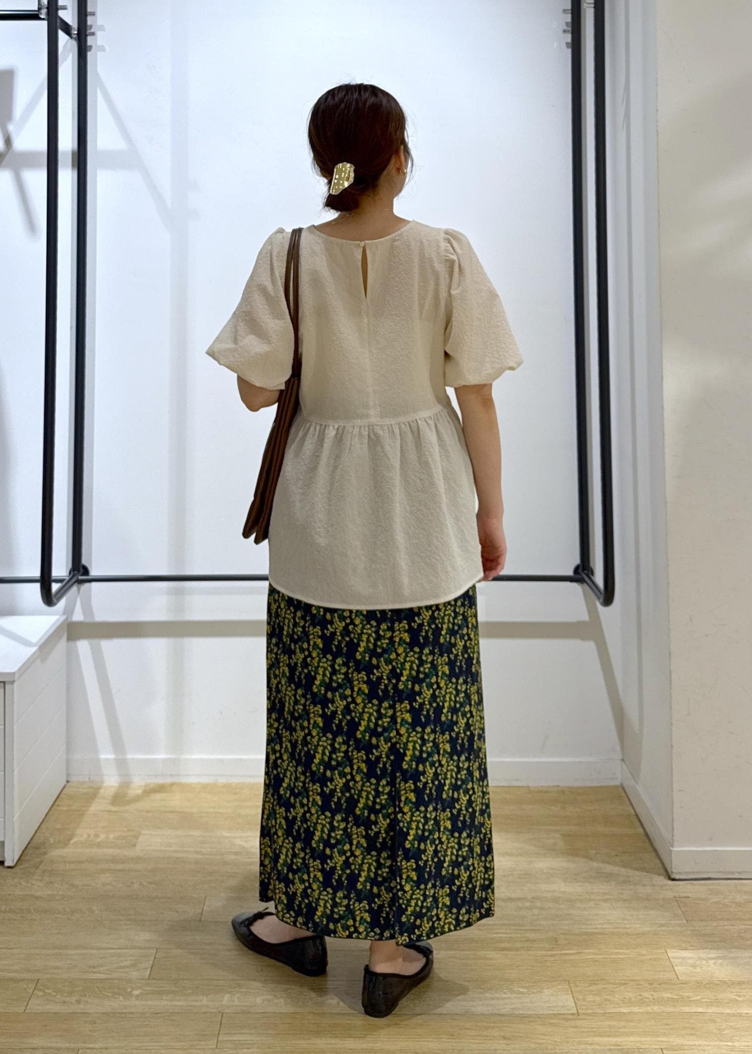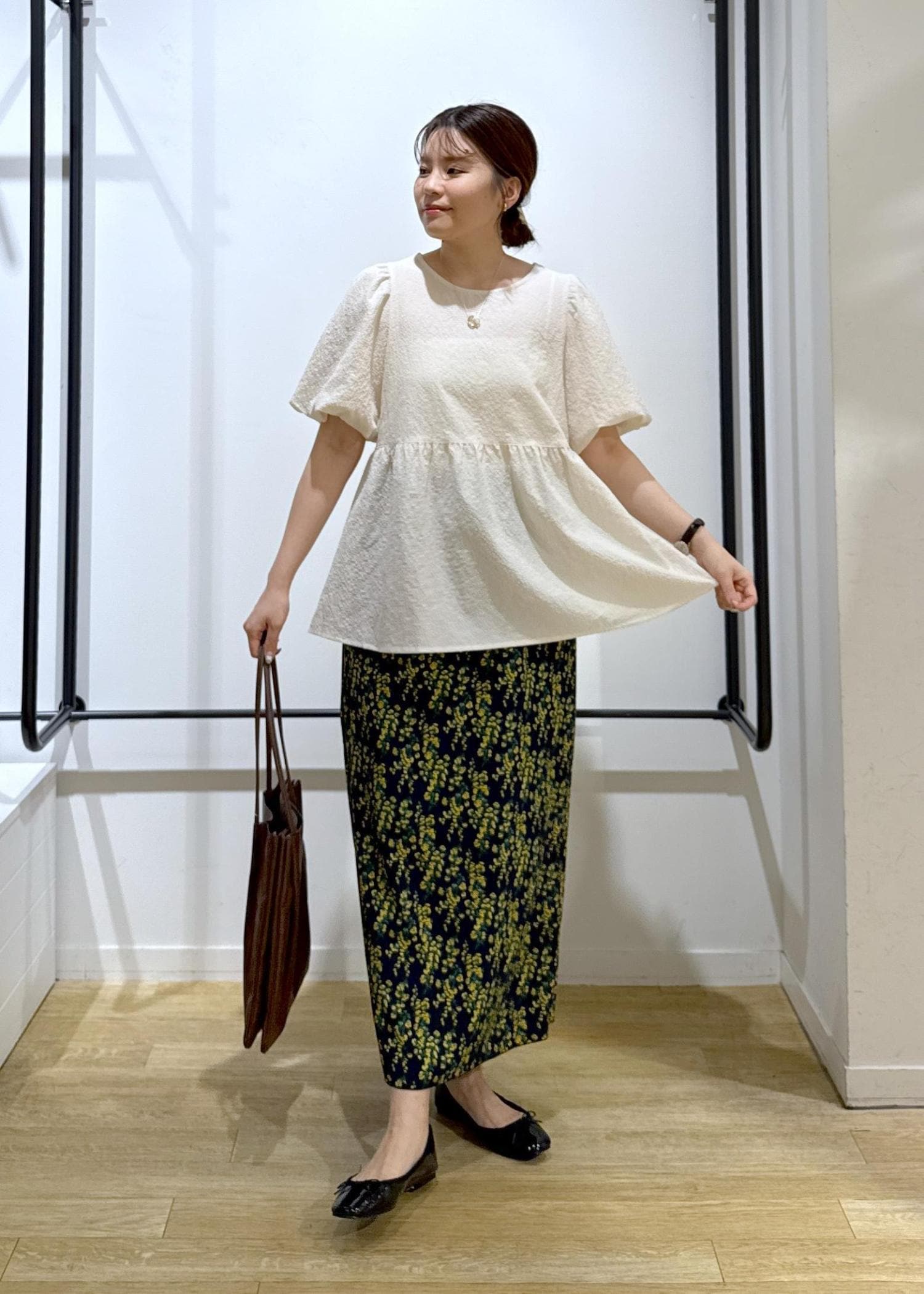 ペプラムブラウス×花柄スカート
