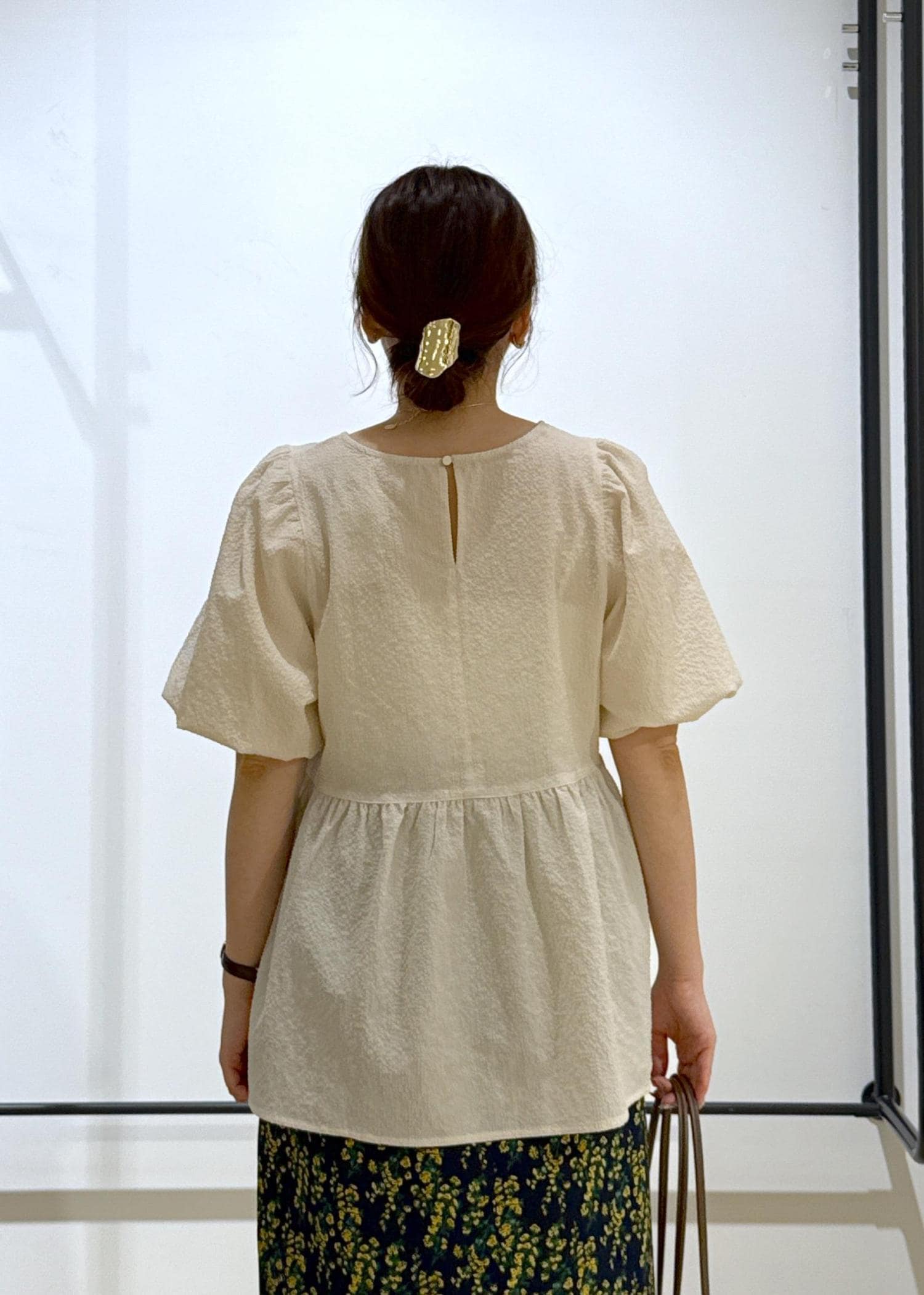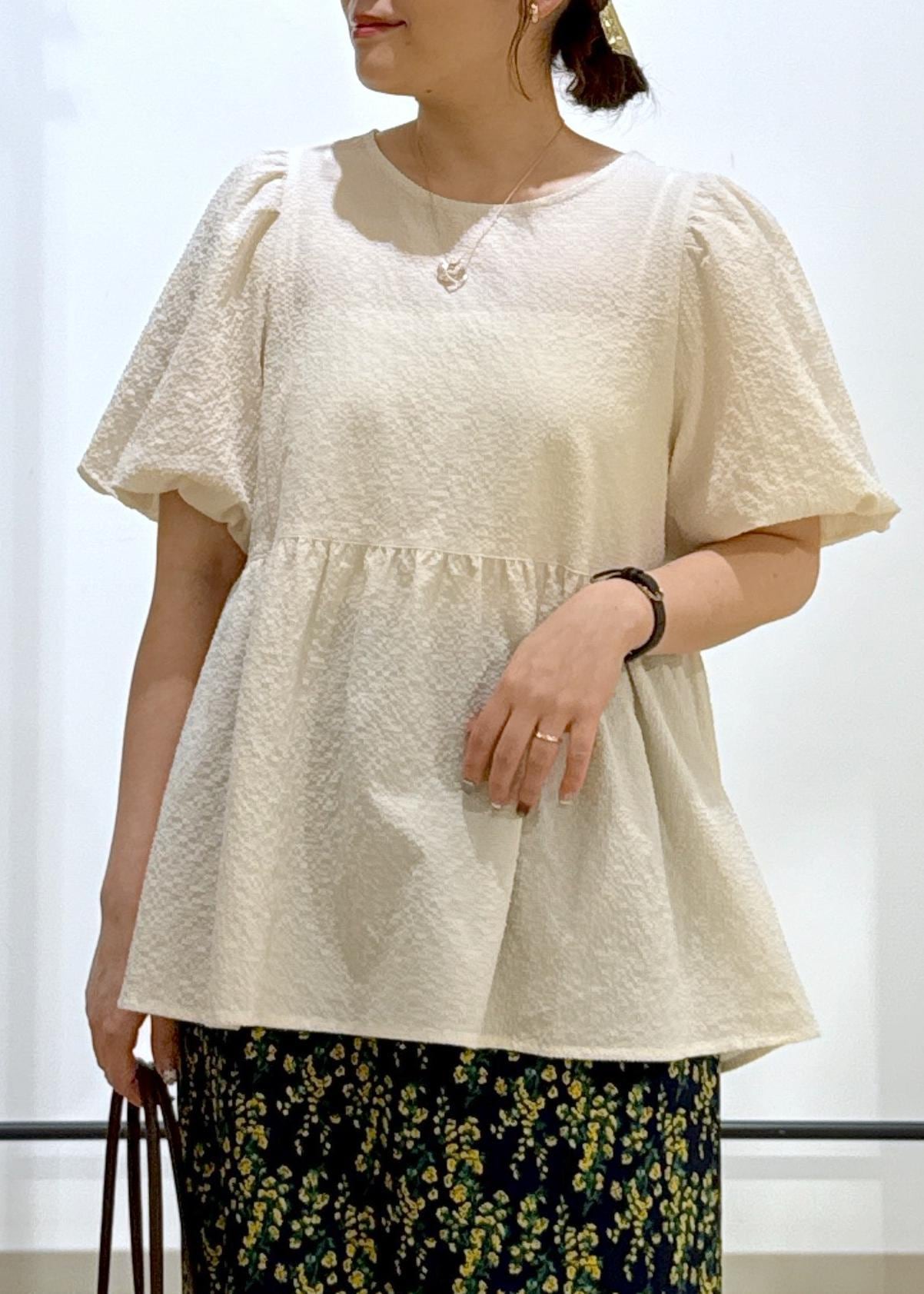 薄手で凹凸感のある素材なので肌離れよく、とても軽い着心地のブラウスです。シワになりにくい素材感です。