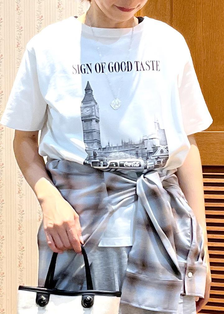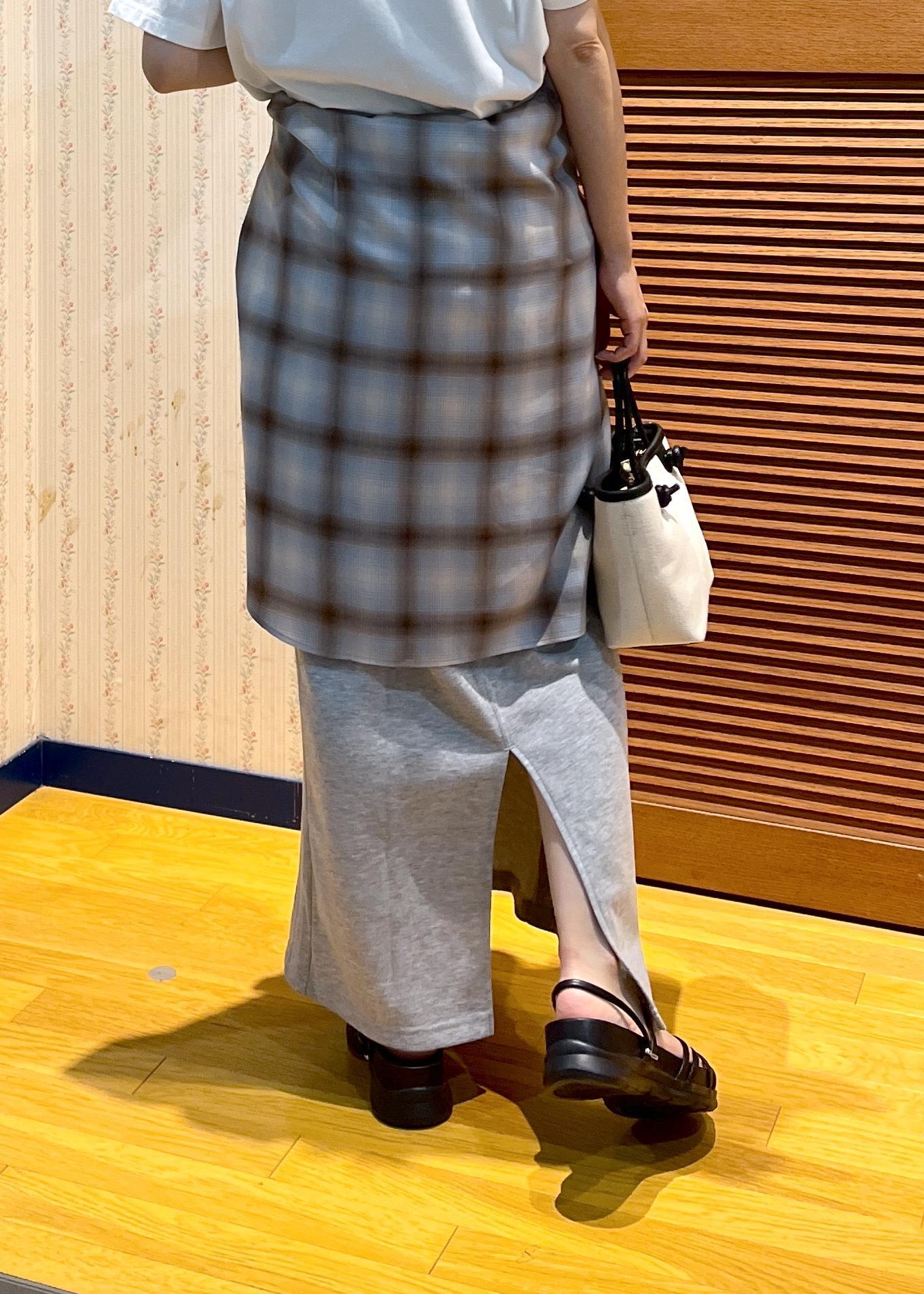 シンプルスタイルですが、腰巻きしたチェックシャツをポイントに!