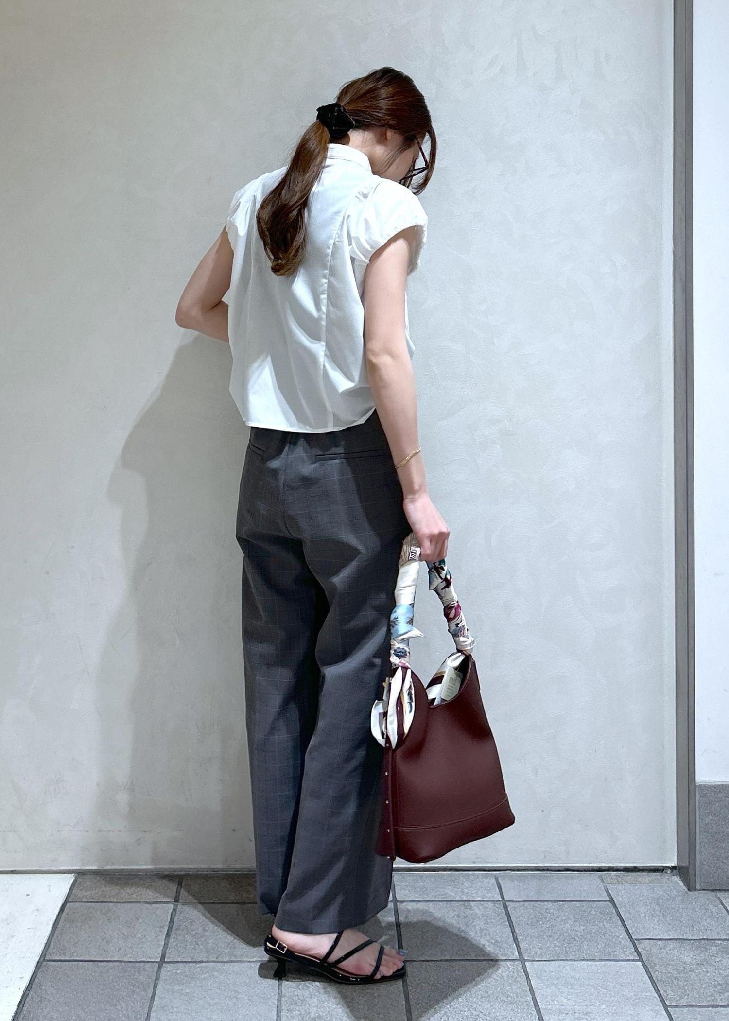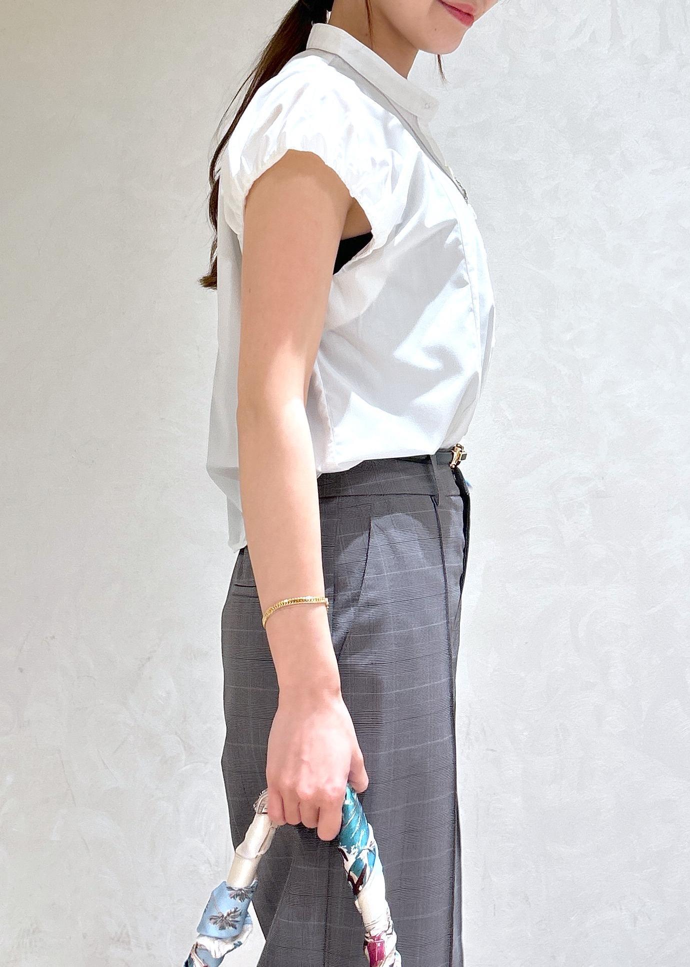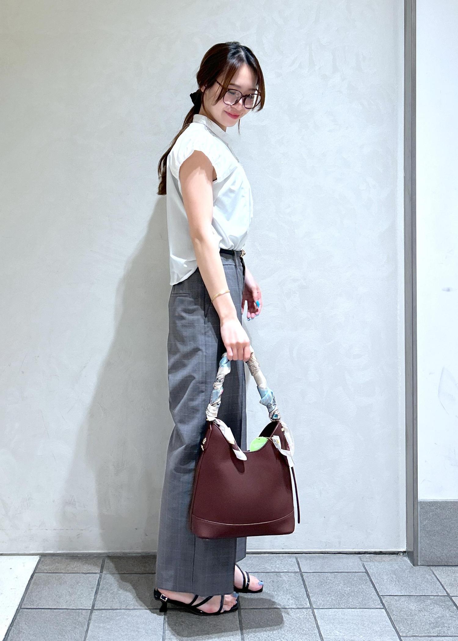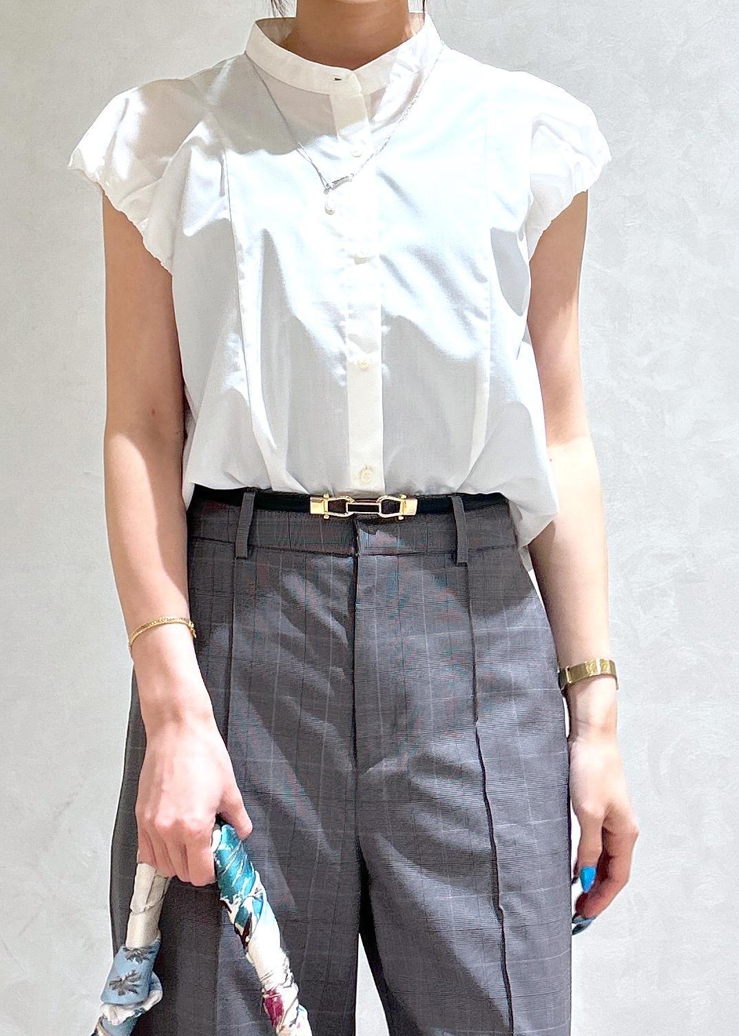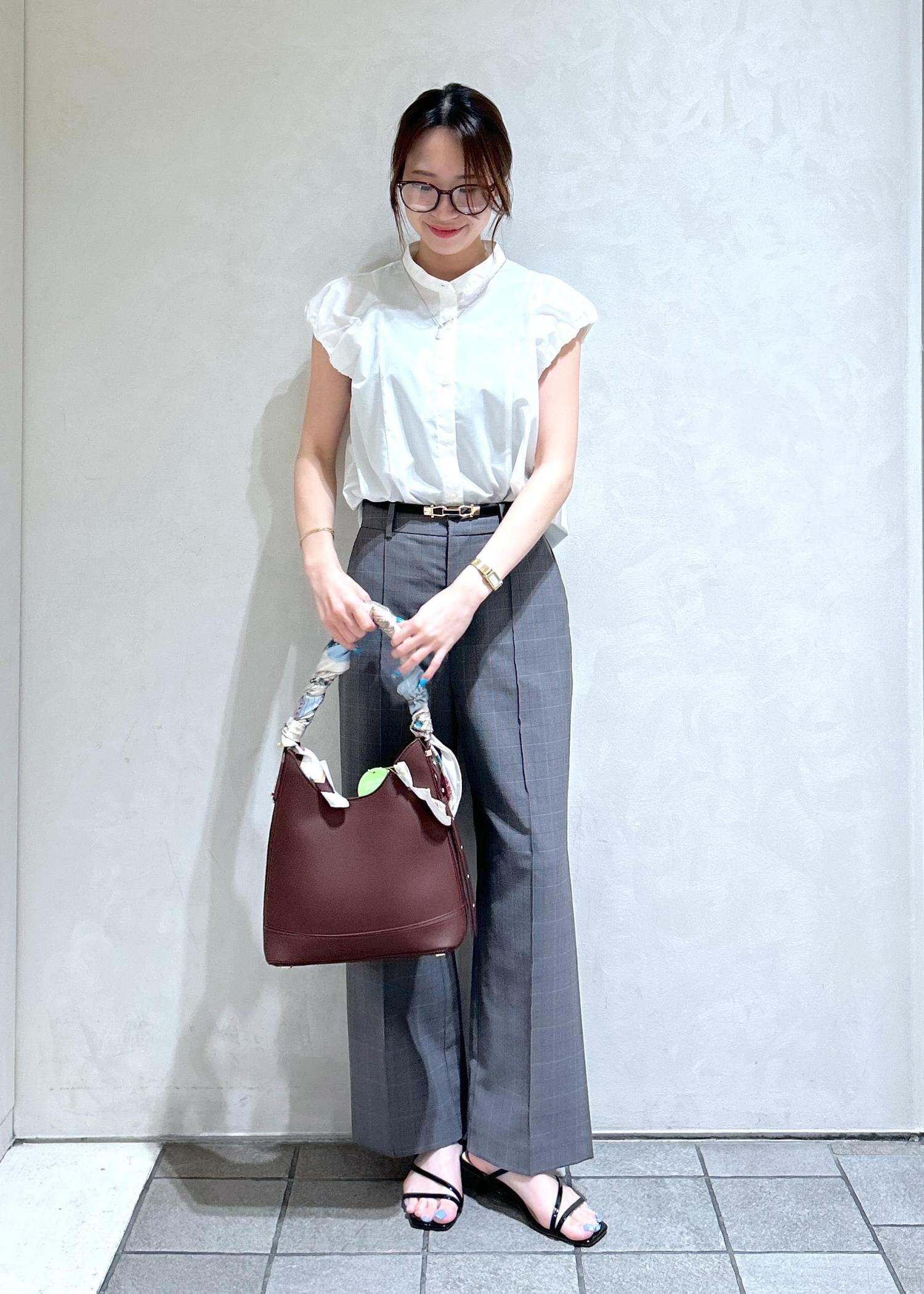 白のバルーンブラウスにチェック柄のパンツで夏から秋まで使える通勤スタイリングにしました。