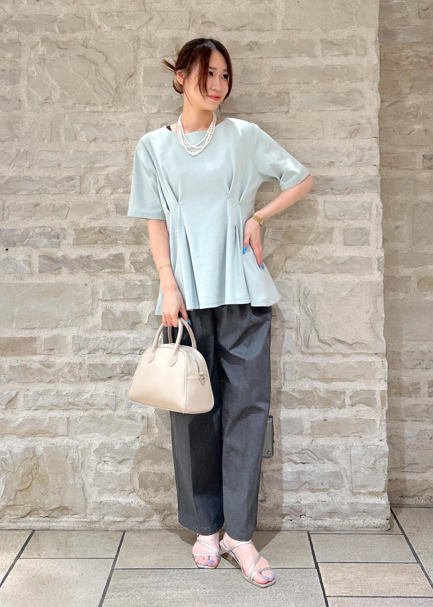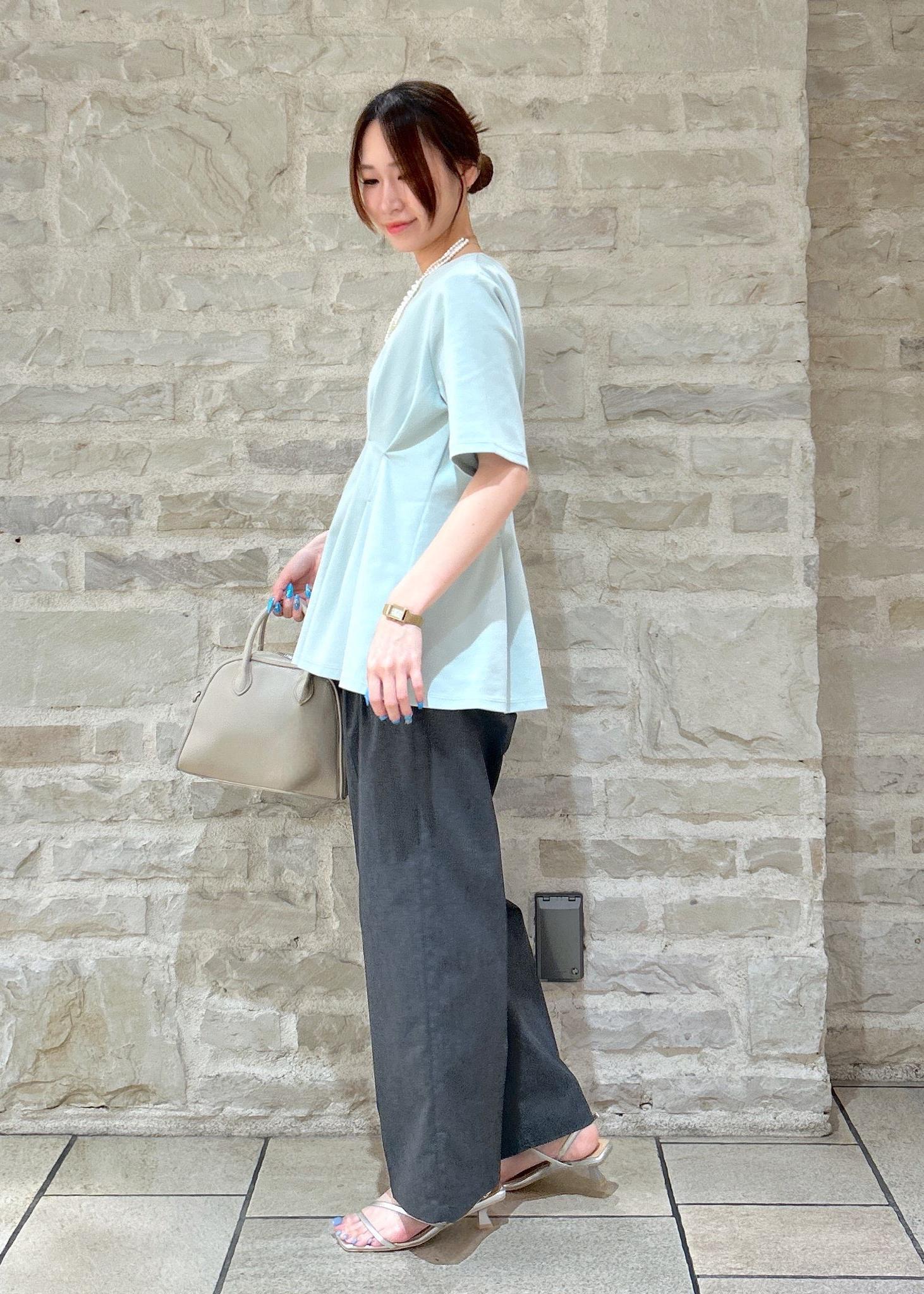 グリーンのペプラムトップスにキレイめなボトムを合わせて大人キレイめなスタイリングにしました。