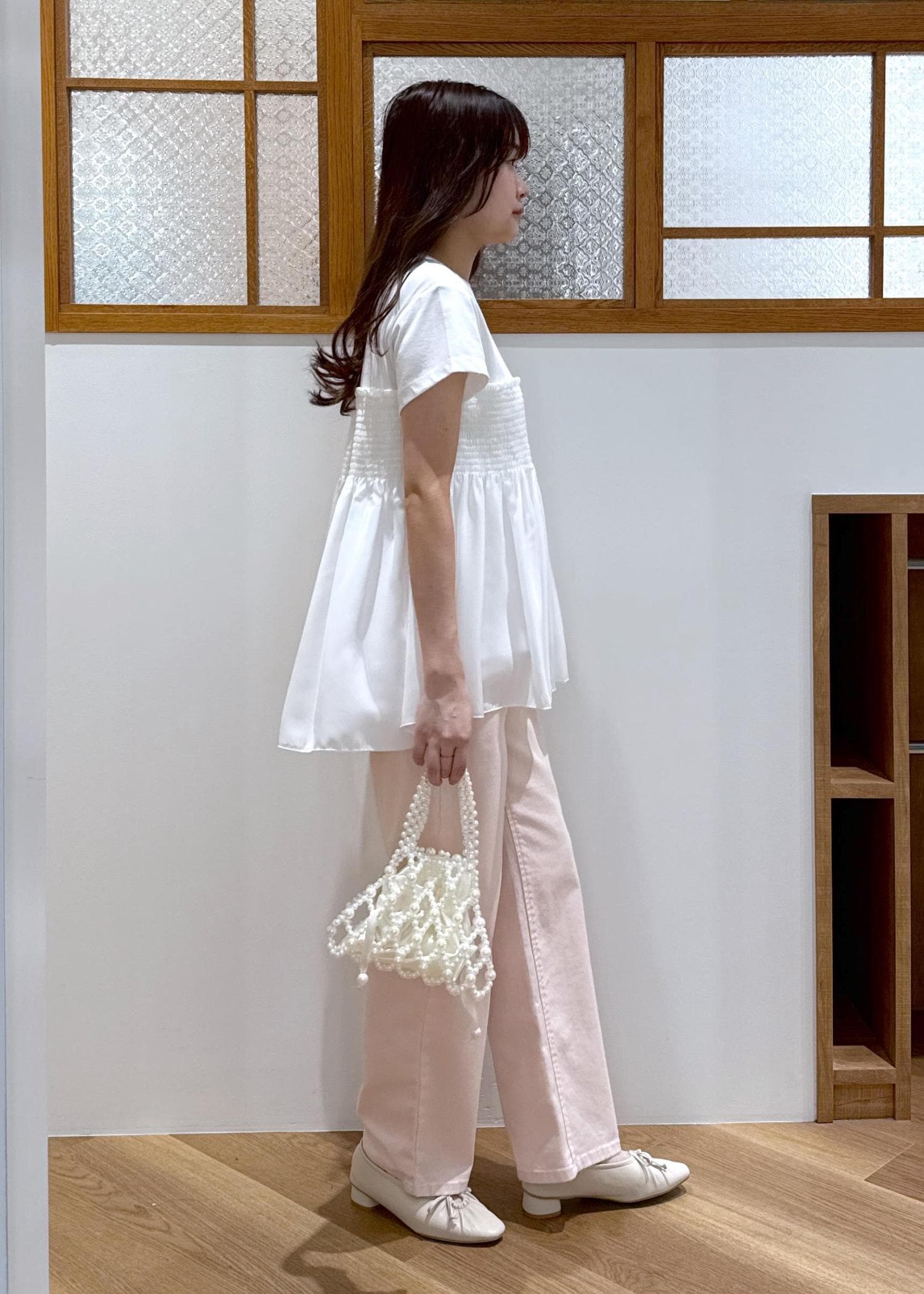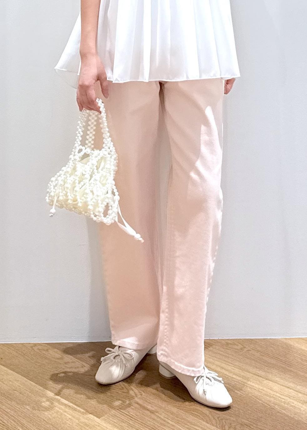 Tシャツとデニムというカジュアルな合わせなので、色味は白とピンクを合わせたガーリーで甘い印象にしました。