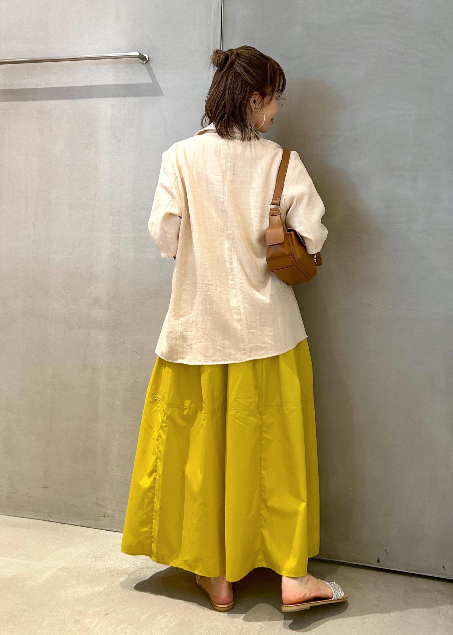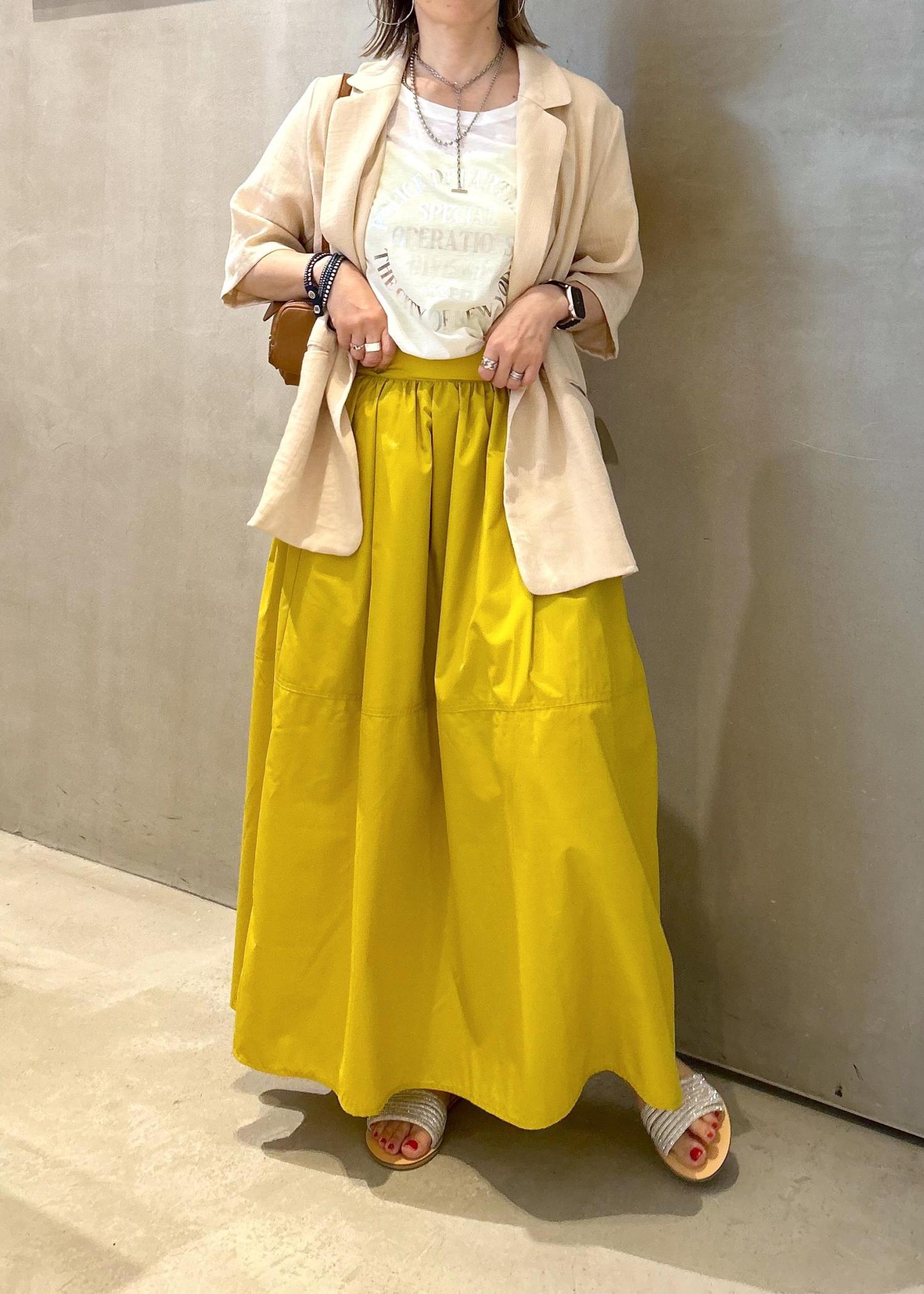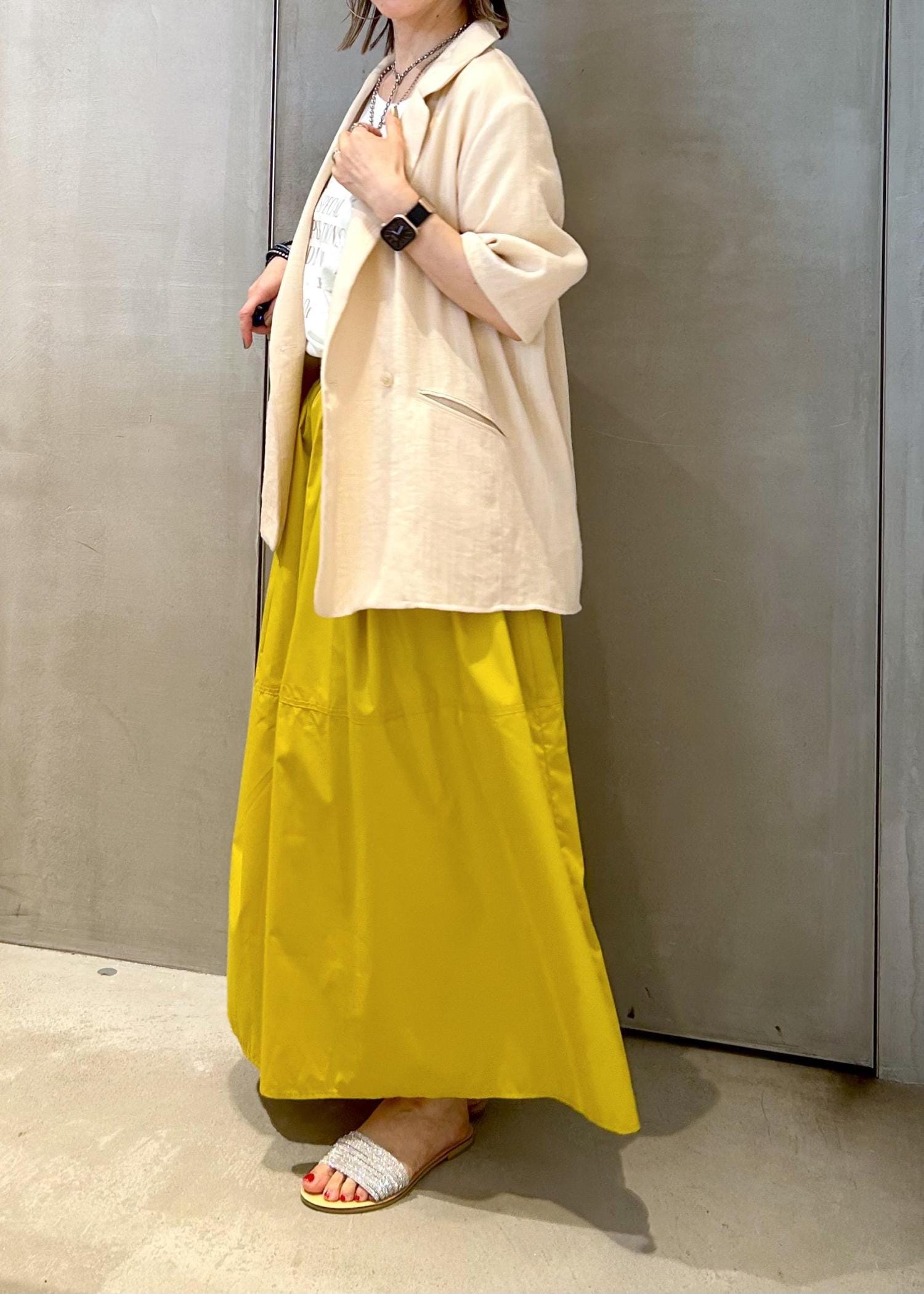 切り替えがあることで、丸みのあるコクーンシルエットになり、ふわっと優しい雰囲気になるスカートです。
