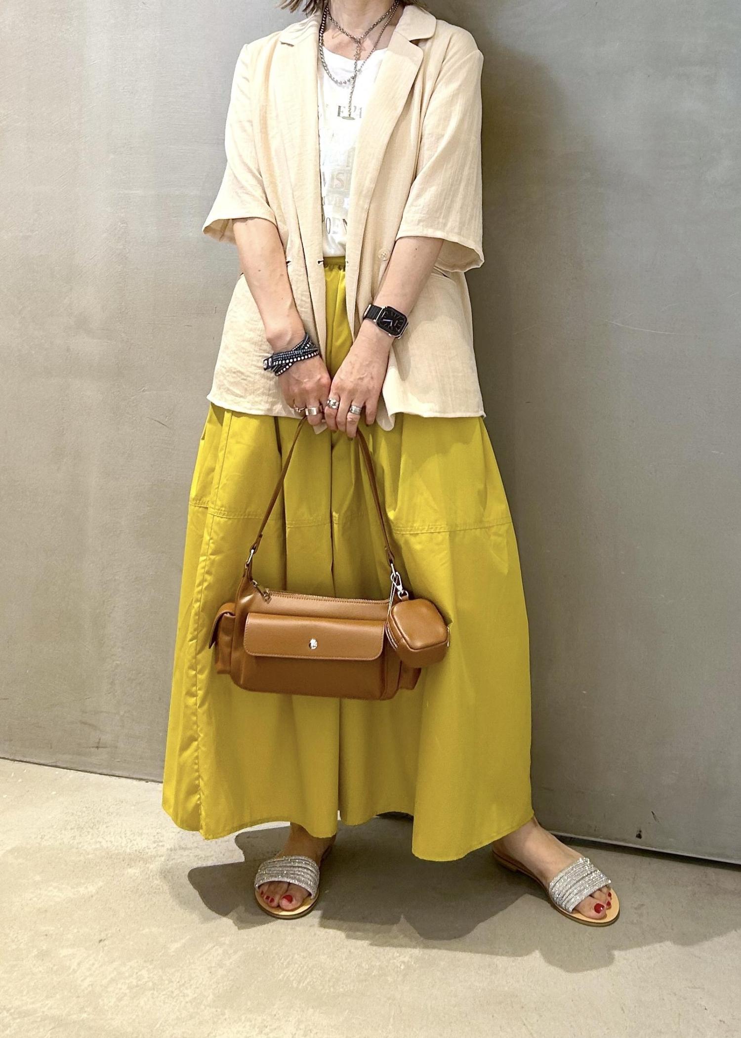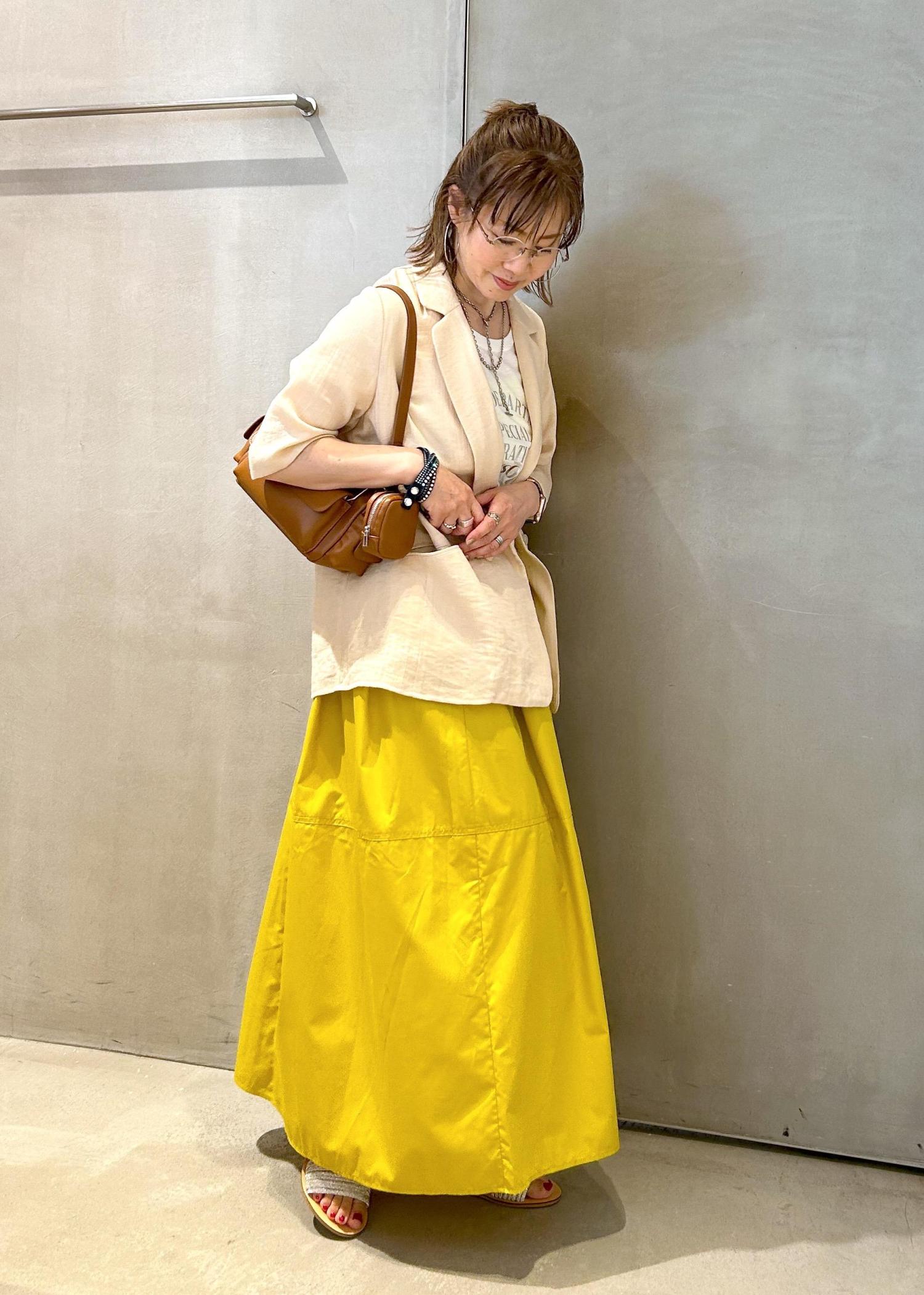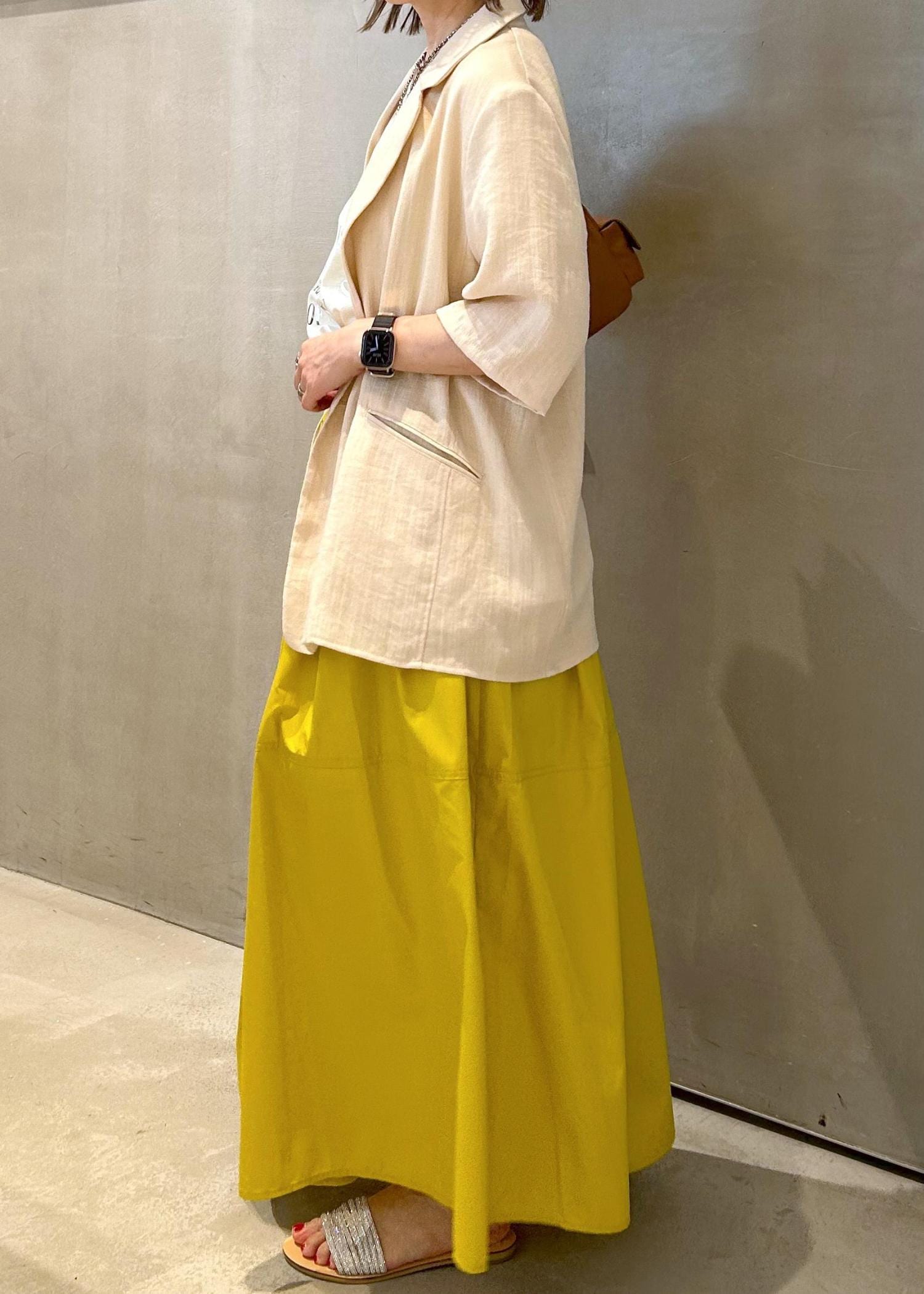 切り替えがあることで、丸みのあるコクーンシルエットになり、ふわっと優しい雰囲気になるスカートです。