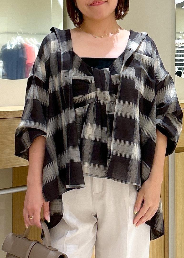 チェック柄のシャツ&ビスチェのセットアップコーデ。