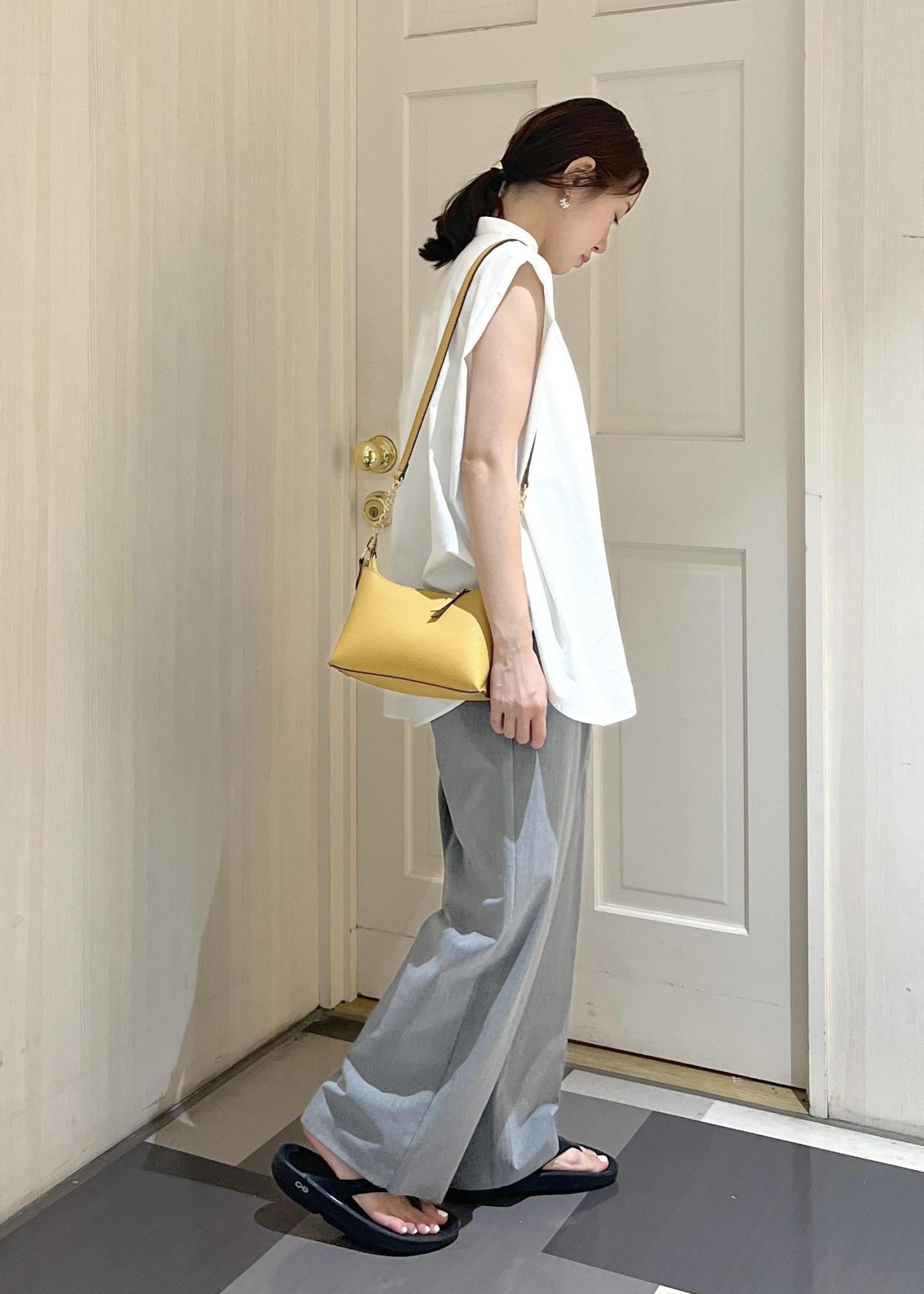 そこにOOFOSのOOlalaを合わせてカジュアルダウンさせました。OOlalaはツヤのあるトングがきれいめスタイルにもマッチします。