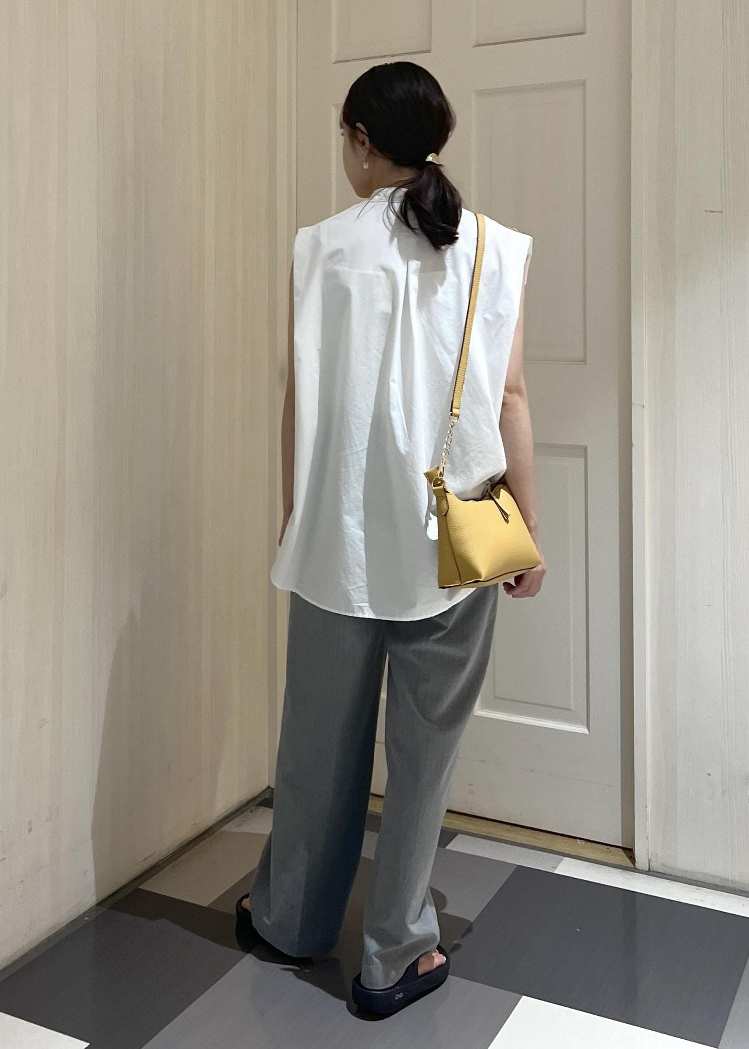 シャツにワイドパンツで、シックな印象に。