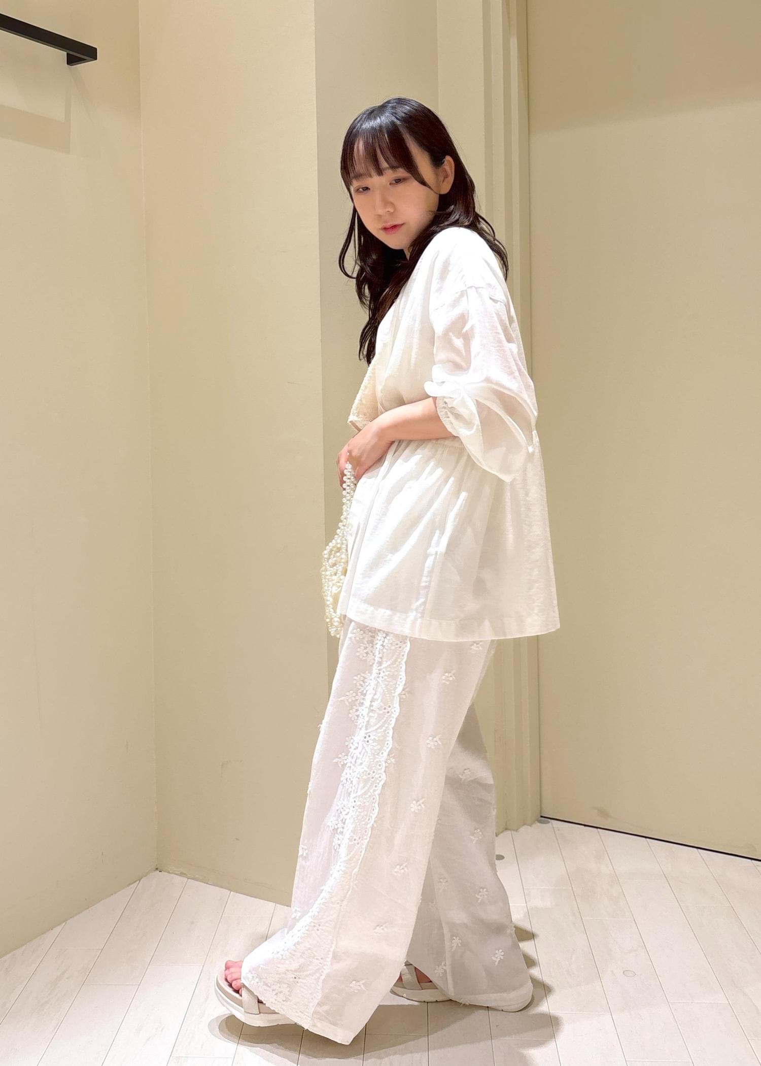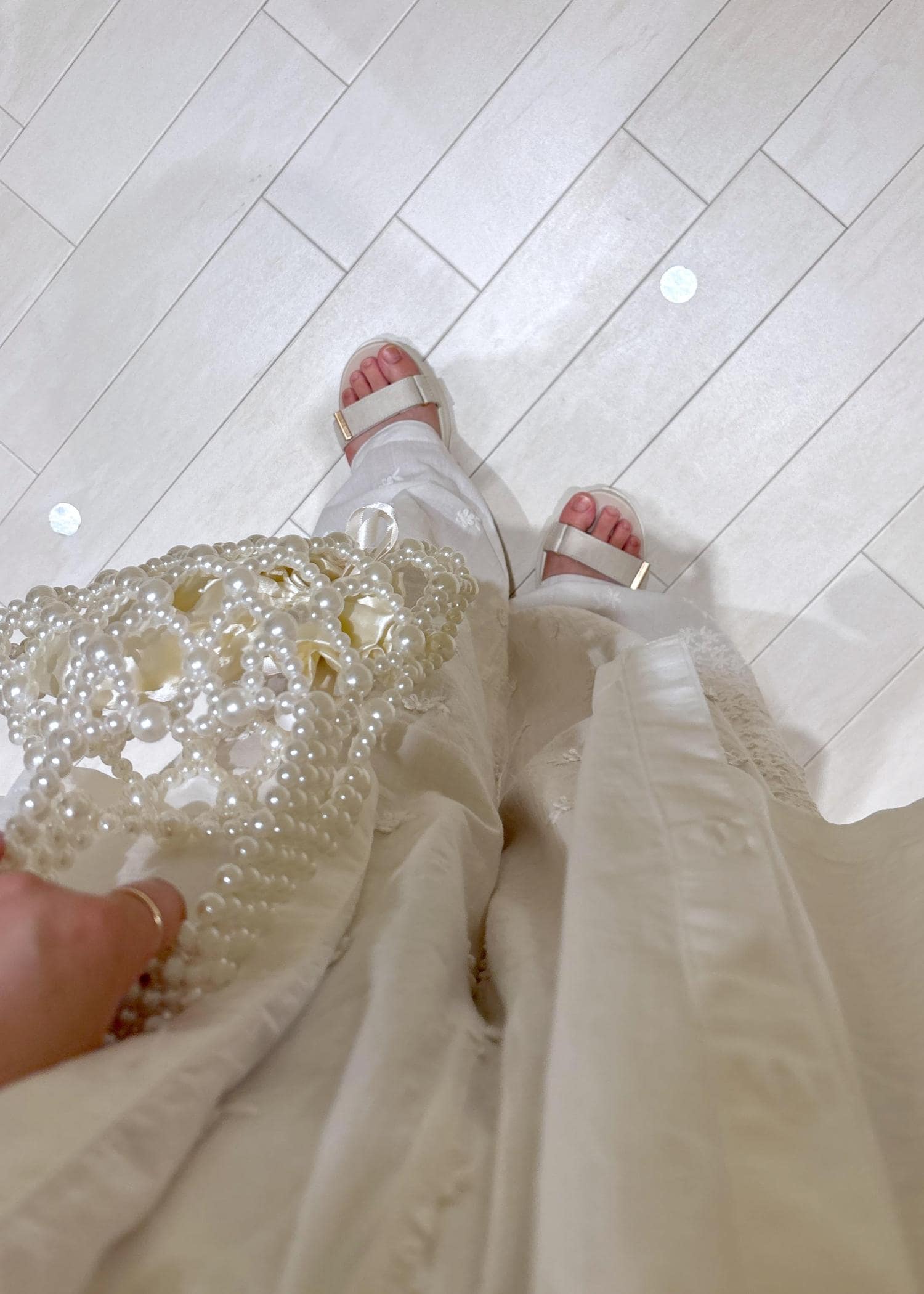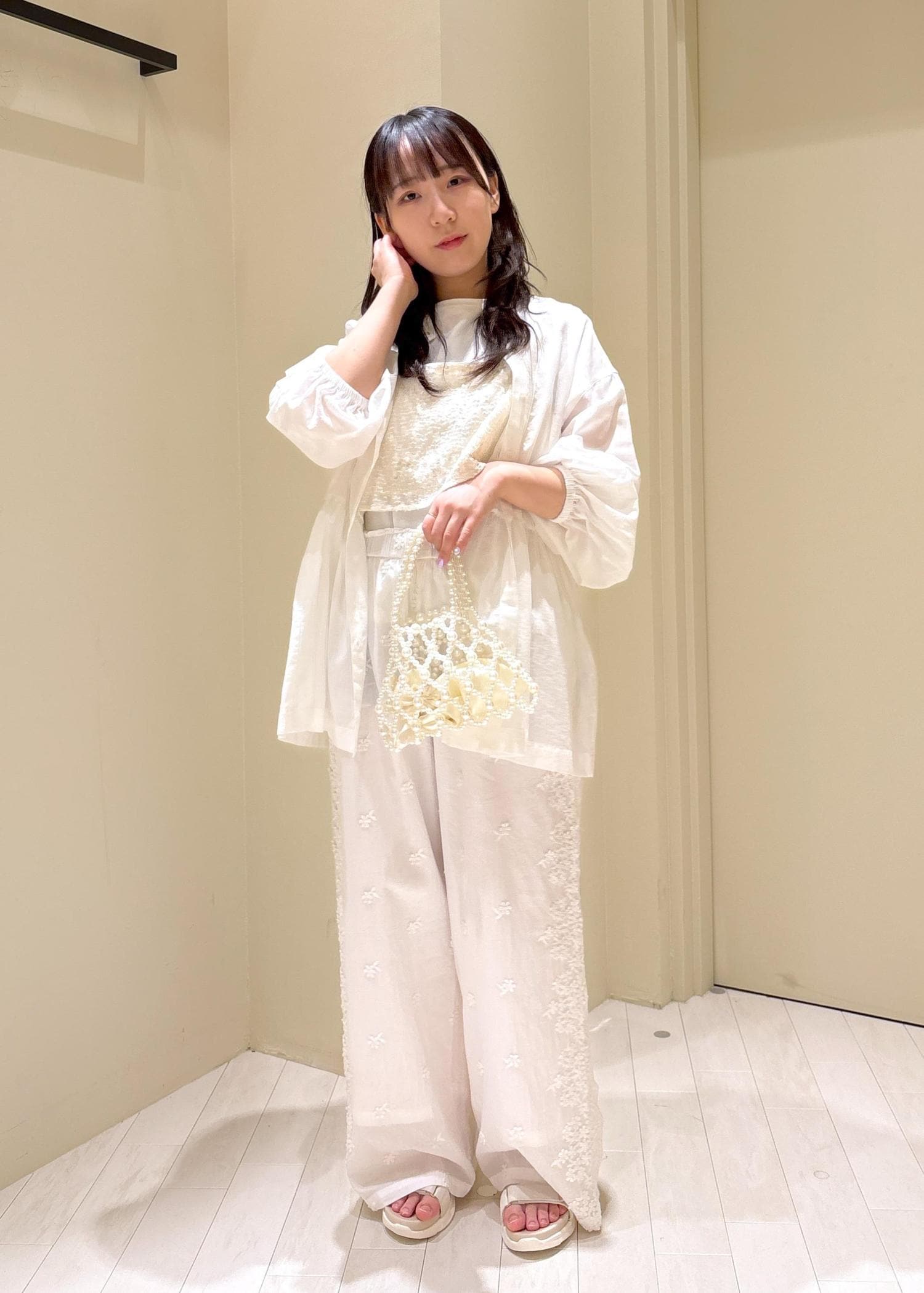 スパンコールビスチェやビーズバック、パンツの刺繍で立体感を出しオールホワイトでものぺっとしないコーデに仕上げました❤︎