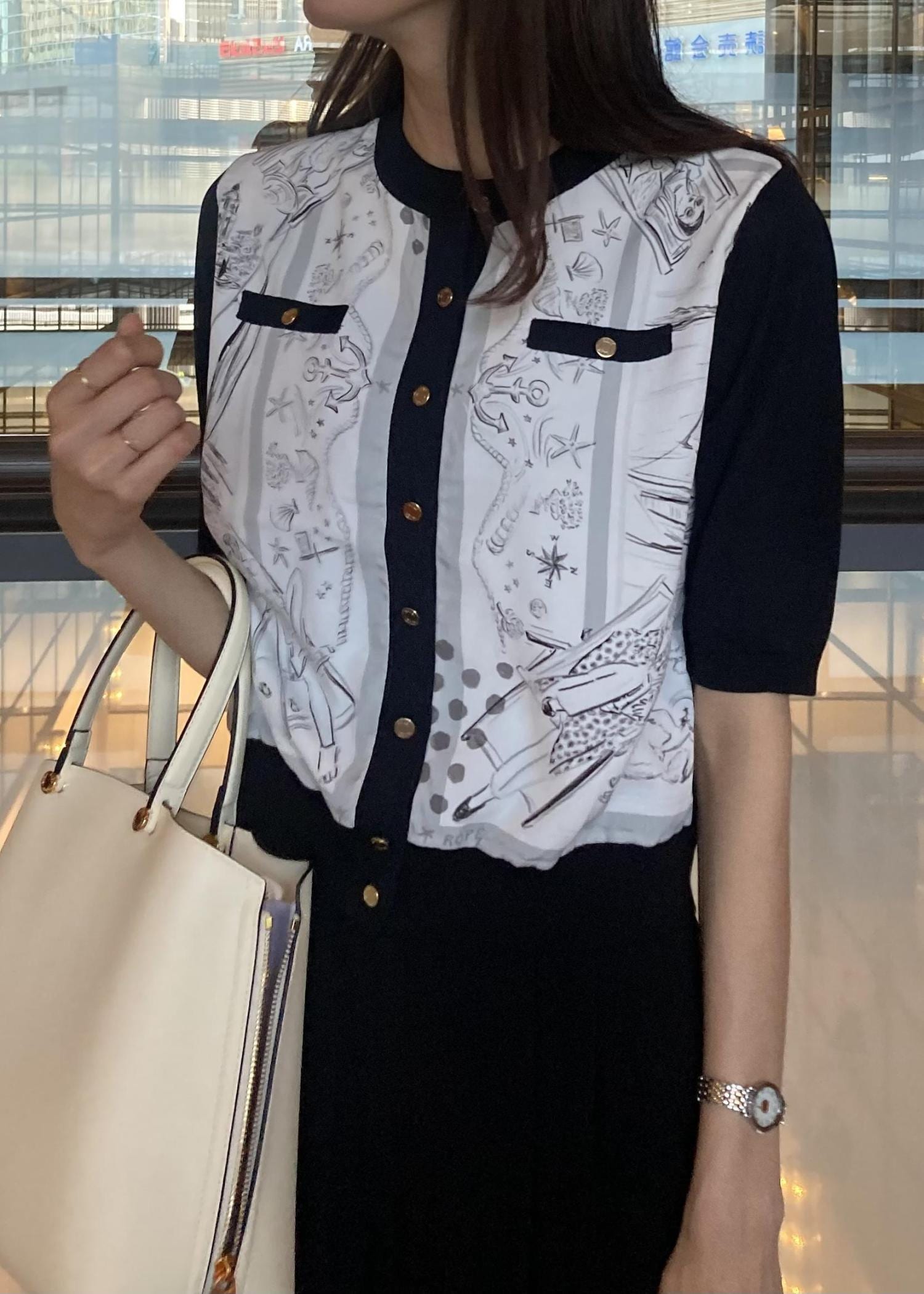 ROPÉ【洗える】【YUKO SAEKI for ROPE'・コラボ】スカーフ柄プリント カーディガンブラウスブラック / F¥27,500レビューコンパクトですが体のラインを拾いにくく、1枚でコーデが決まるトップスです。