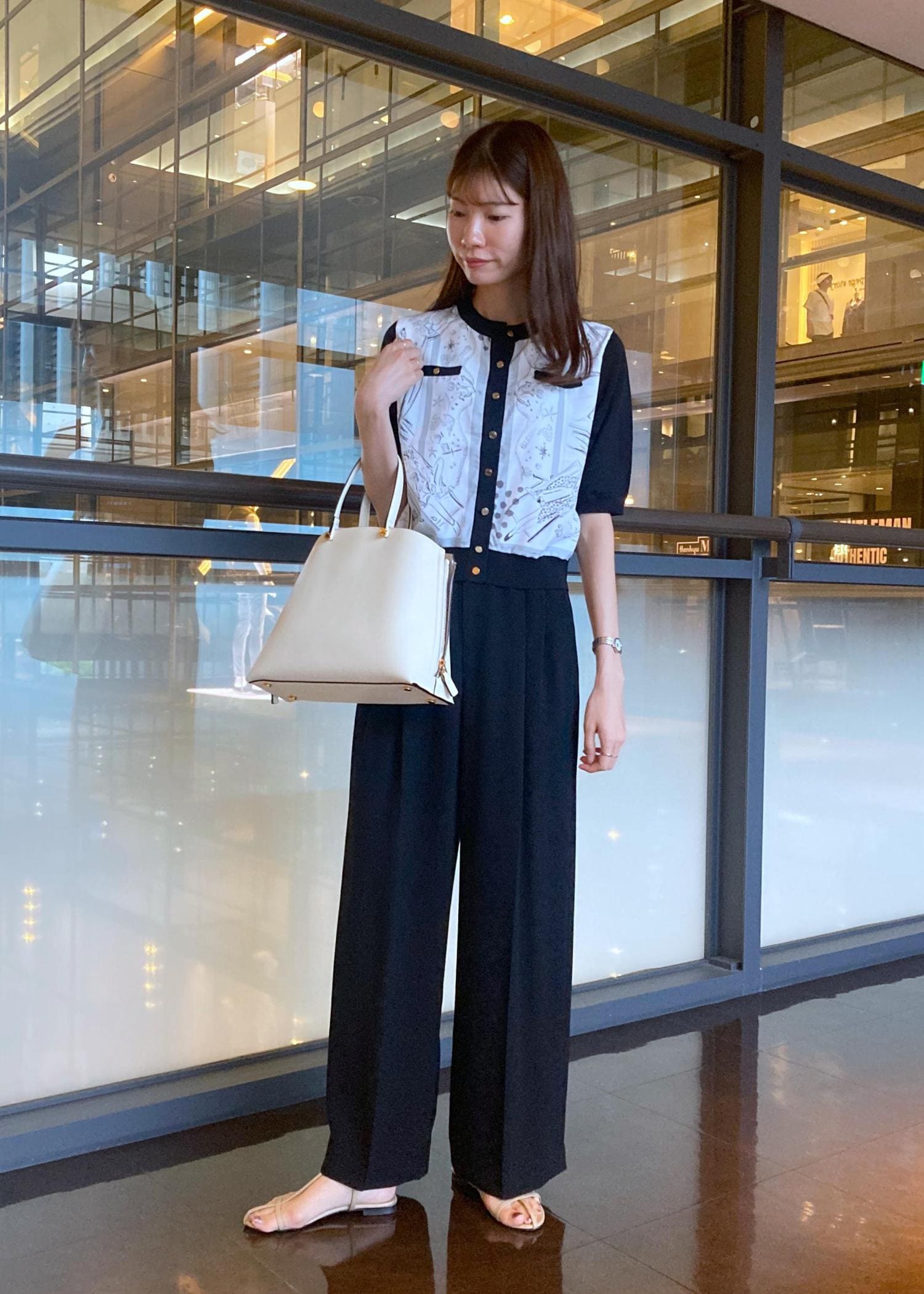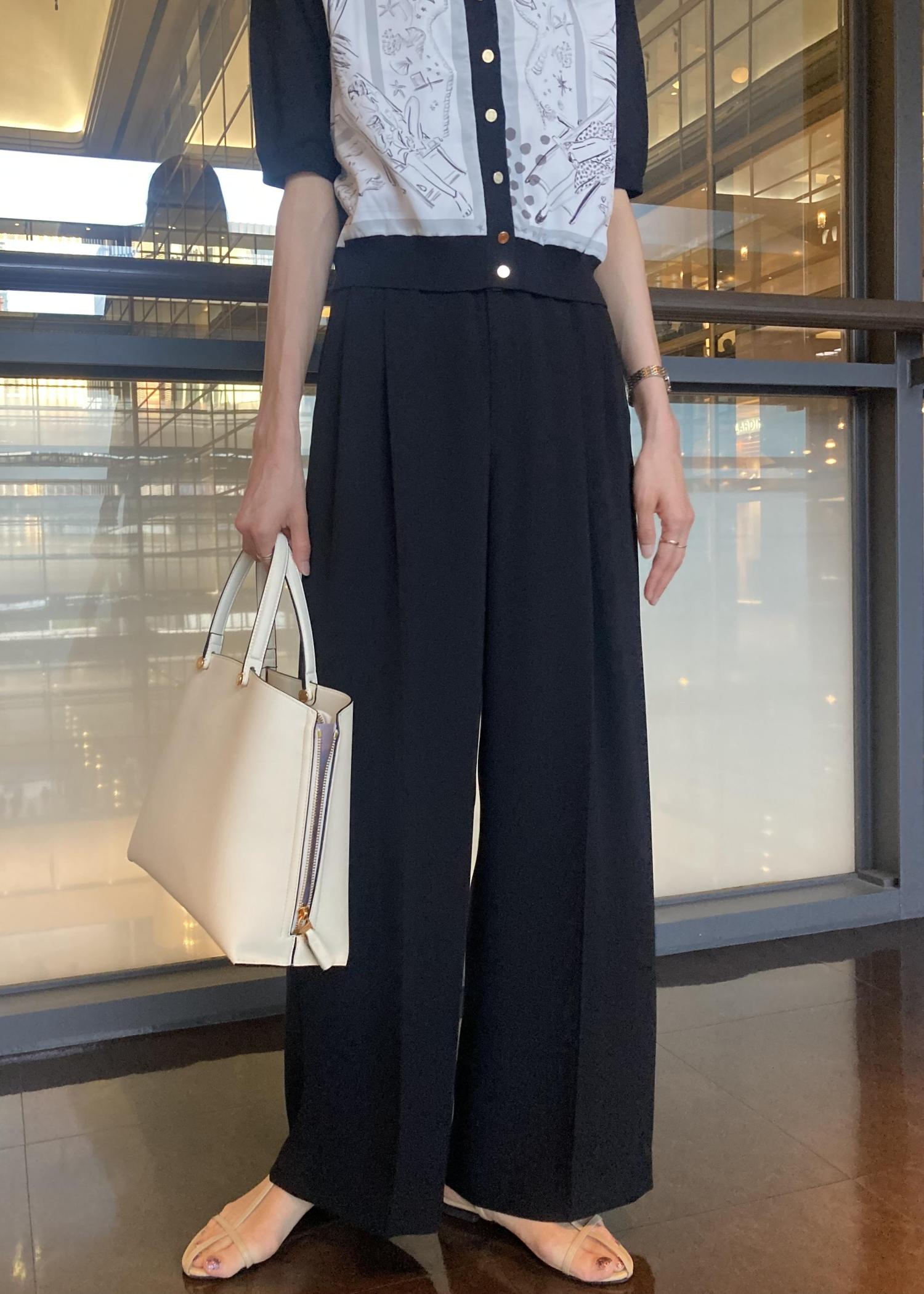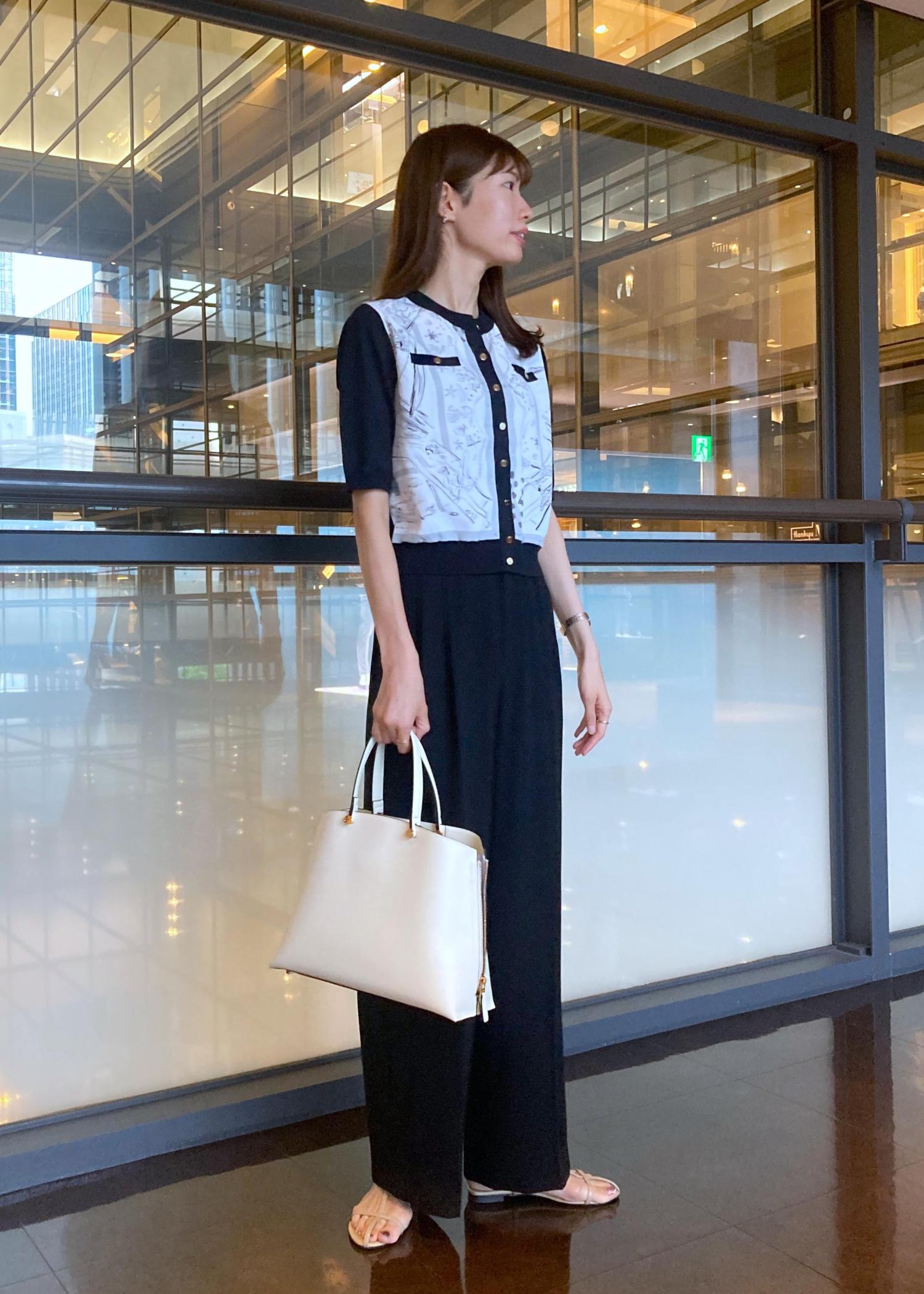 スカーフ柄プリントカーディガンをメインにシンプルなワイドパンツスタイルでまとめました。