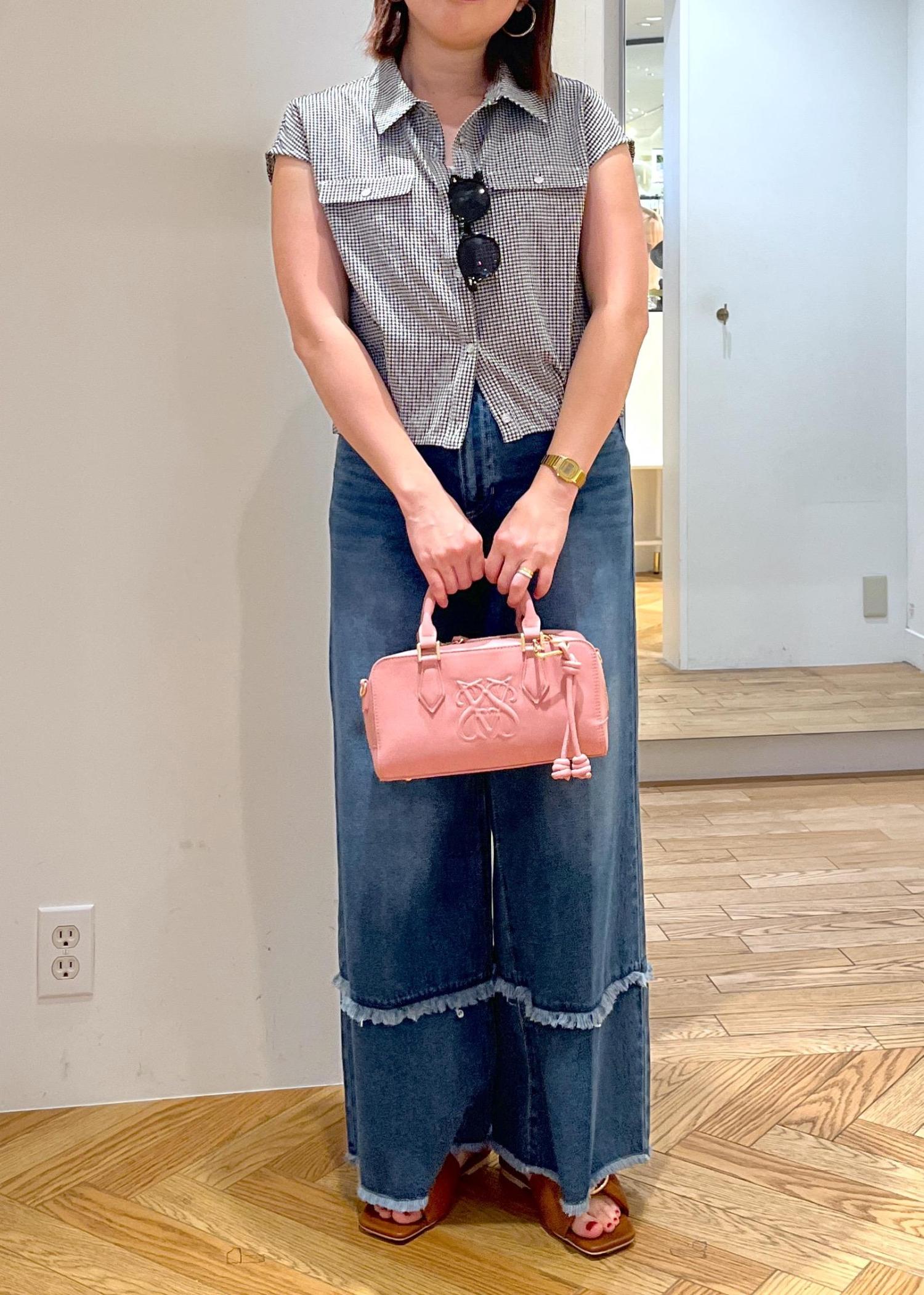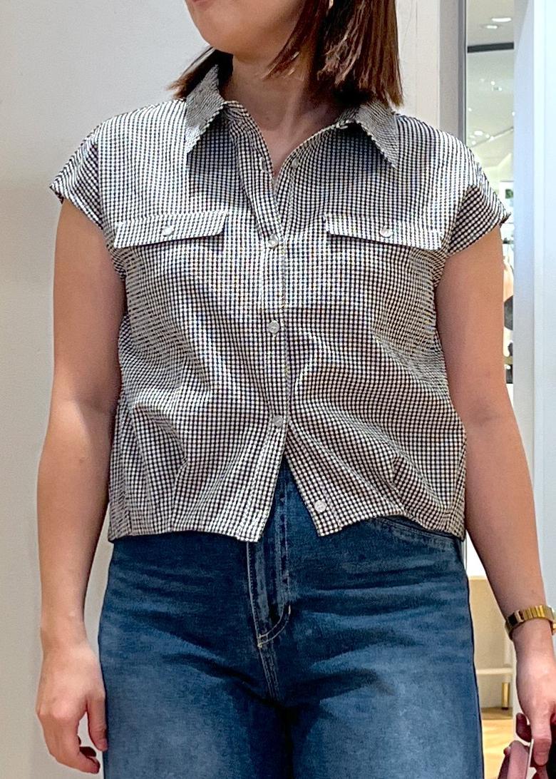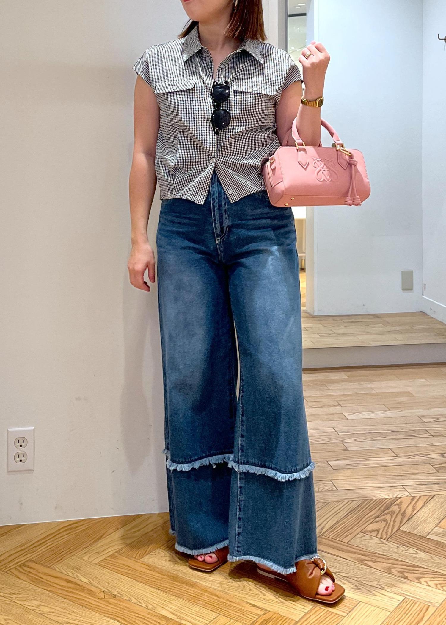 ギンガムチェックがかわいいブラウスは、デニムと合わせ、サングラスやサンダルなど夏らしさを楽しめる小物を合わせて、王道カジュアルスタイルにまとめました。