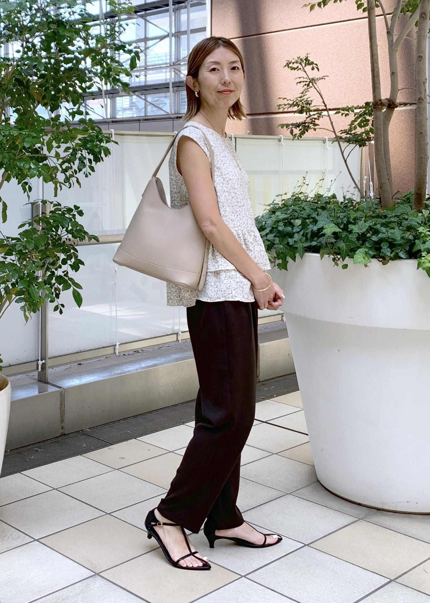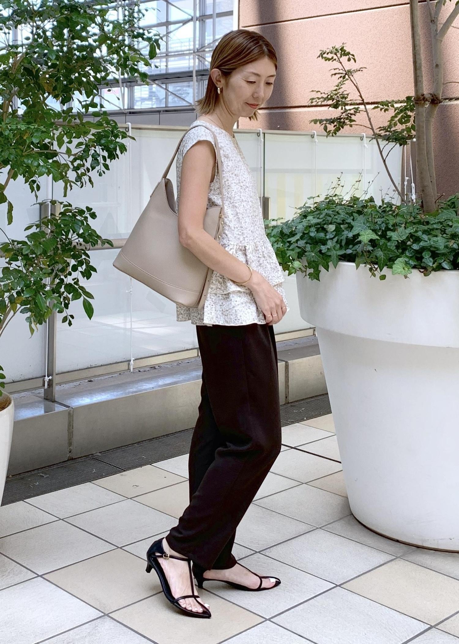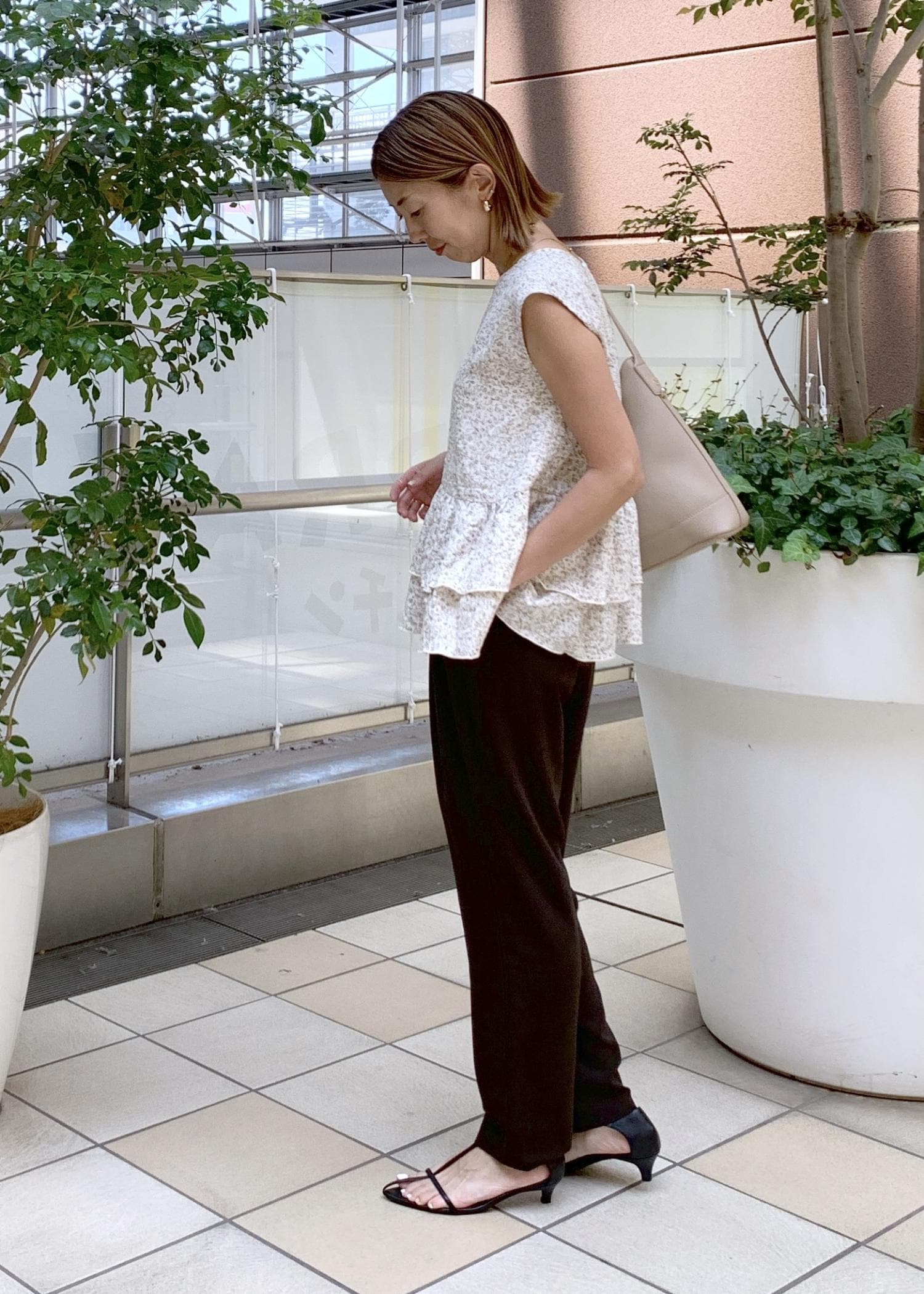 ブラウスのパンツを合わせて大人も着やすいスタイリングに。
