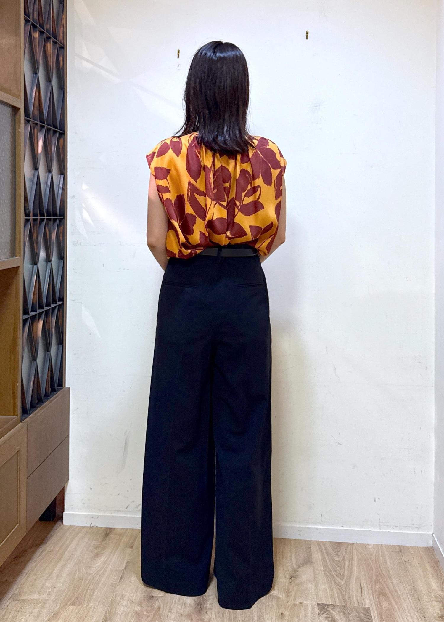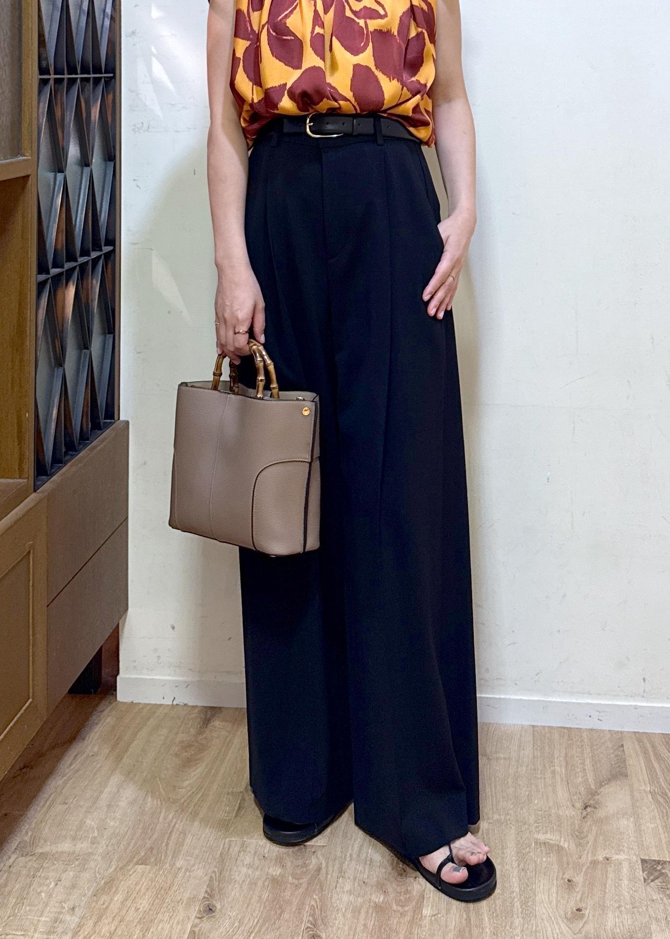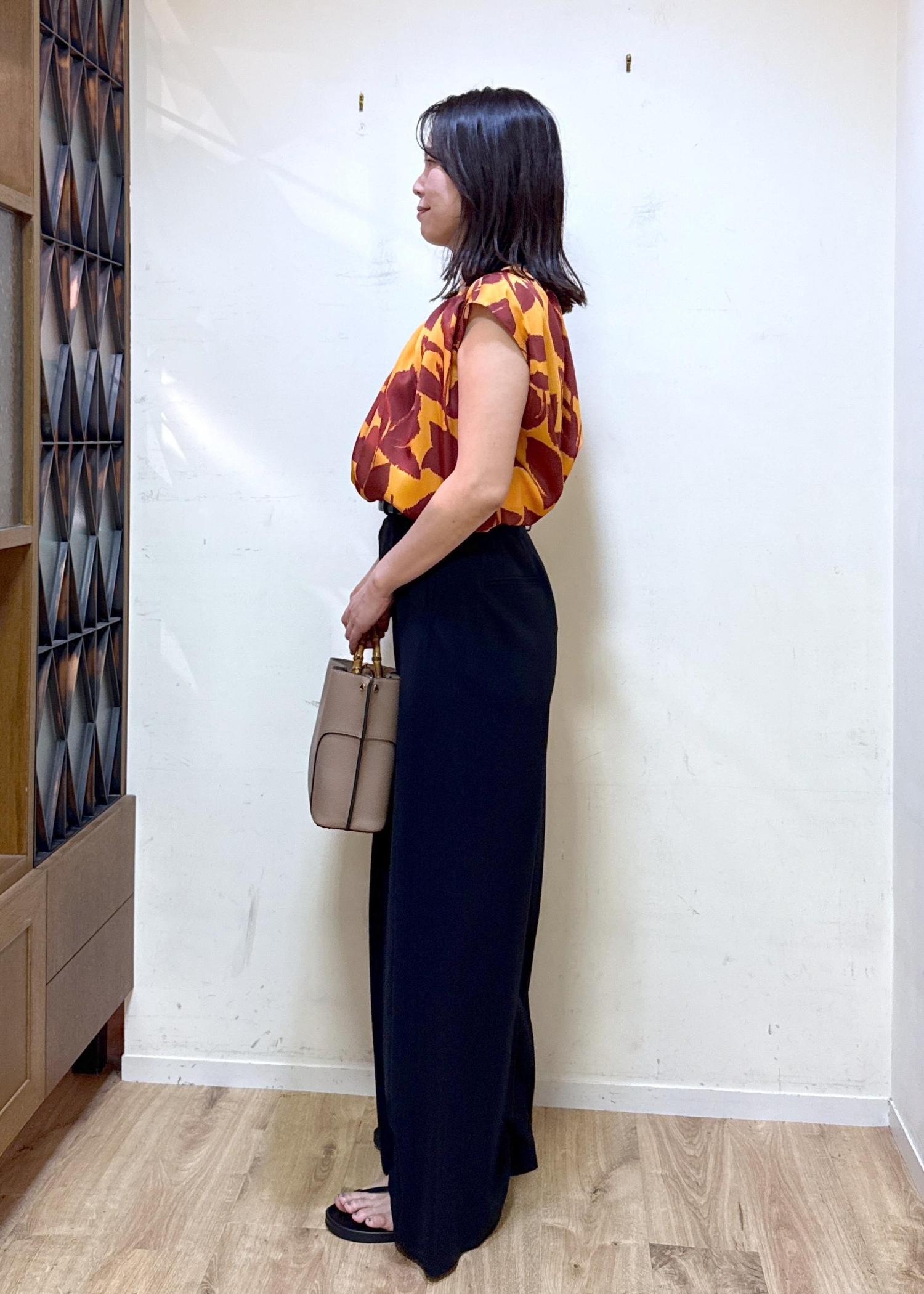 シンプルなパンツとのコーディネートで、少し秋を感じるカラーにまとめました。