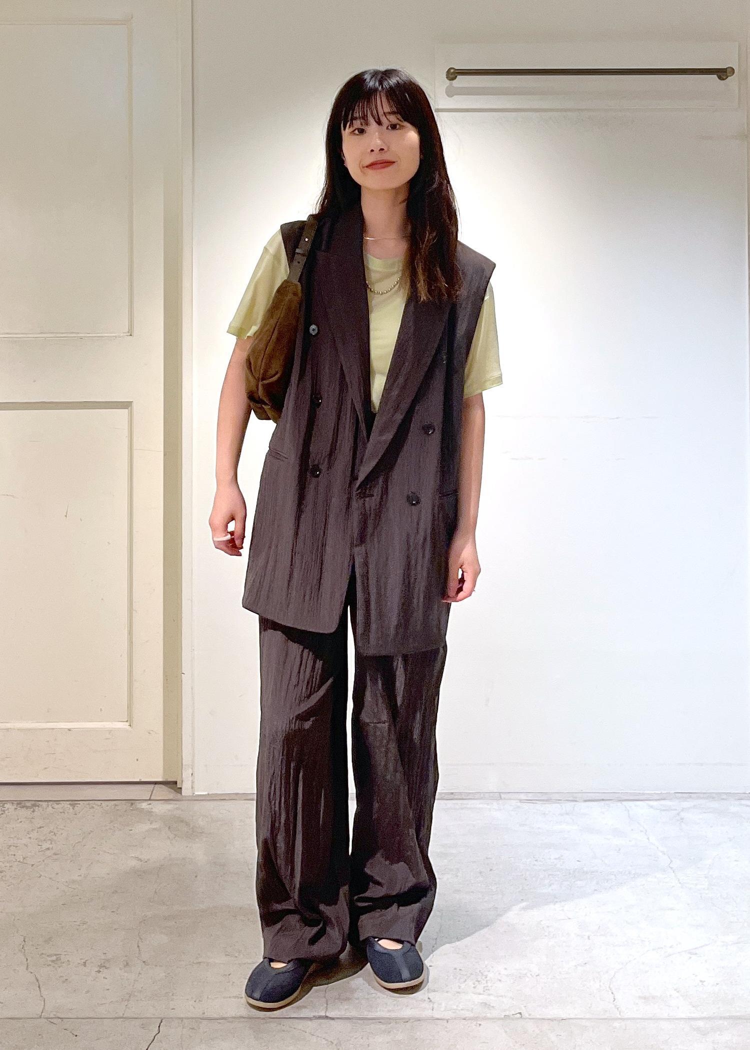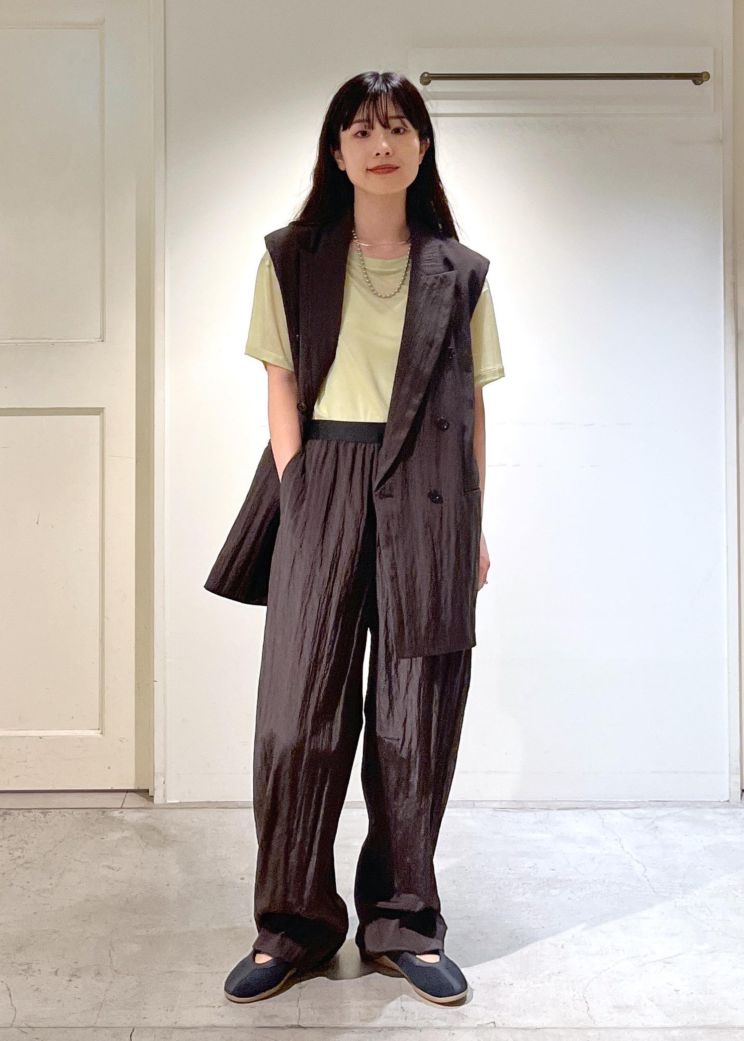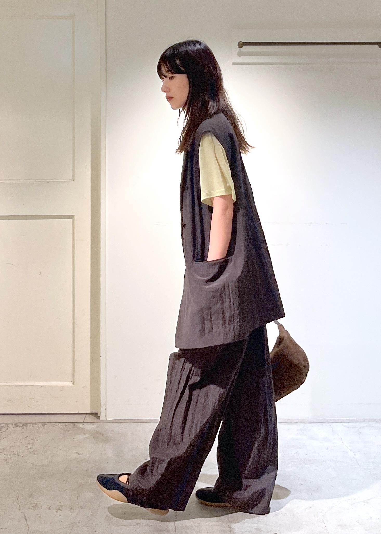 軽いナイロンウール素材。腰回りもゆとりがあるので楽ちんな着心地です。きちんと感のあるスタイルにも合います。 -