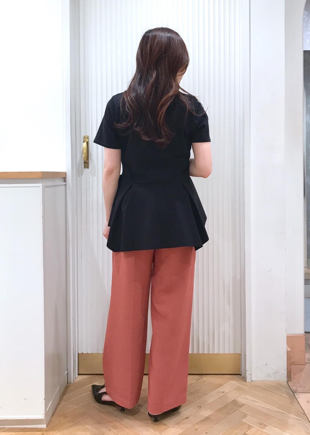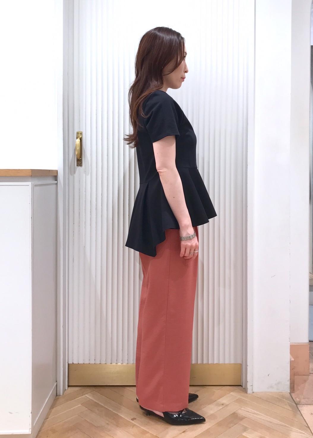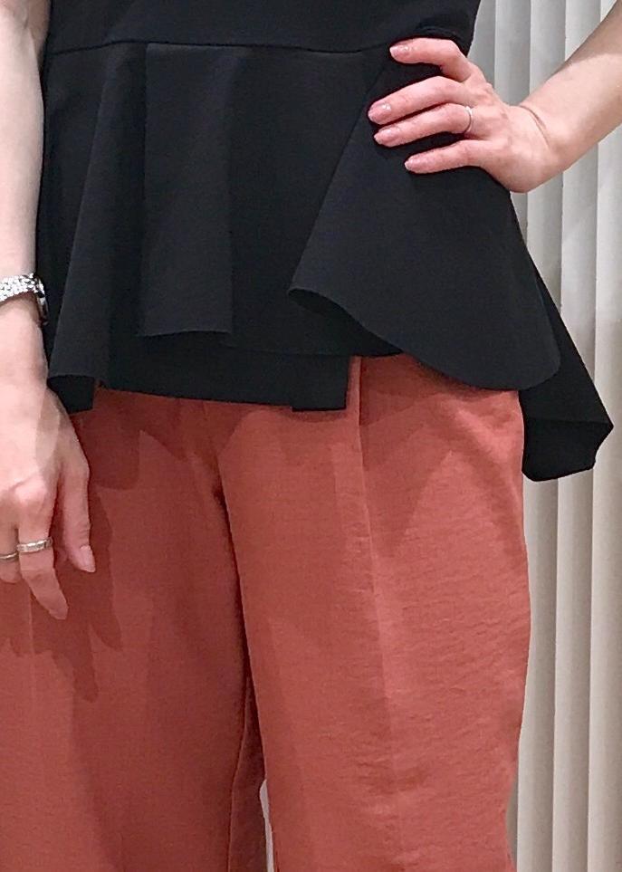 お腹周りをカバーしつつスタイルアップも叶うペプラムプルオーバーをパンツに合わせた、きちんと感あるコーディネートです。