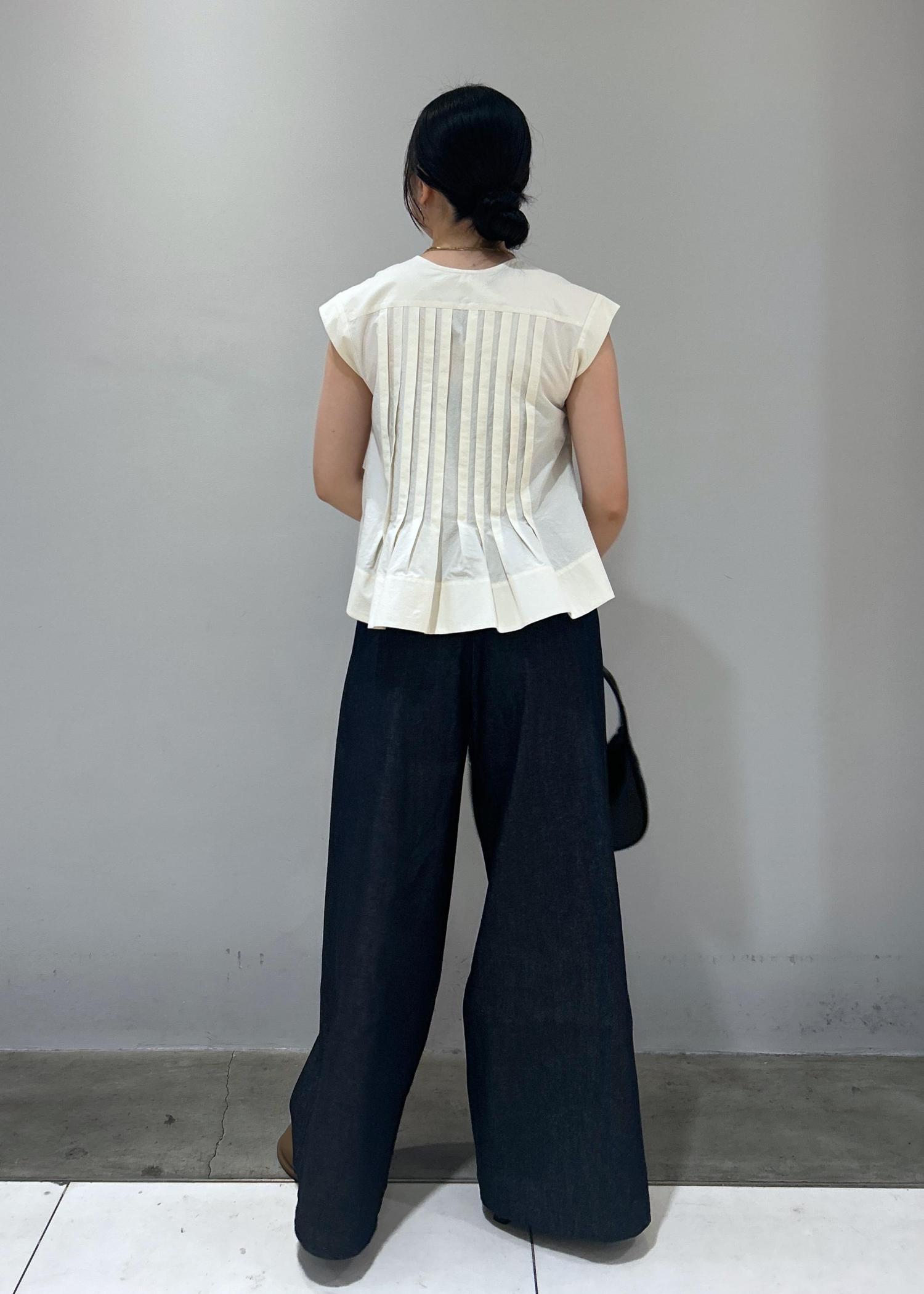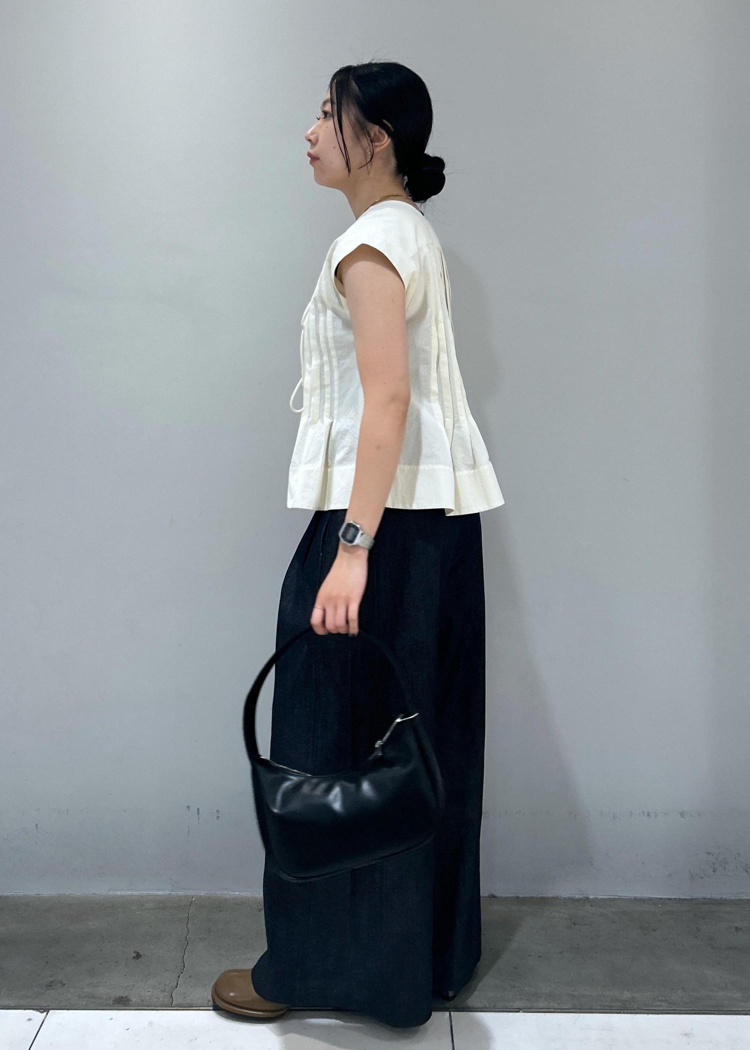 タックが入っており綺麗めな雰囲気にも相性がよく、色味も深いネイビーのようなでクールな印象です。