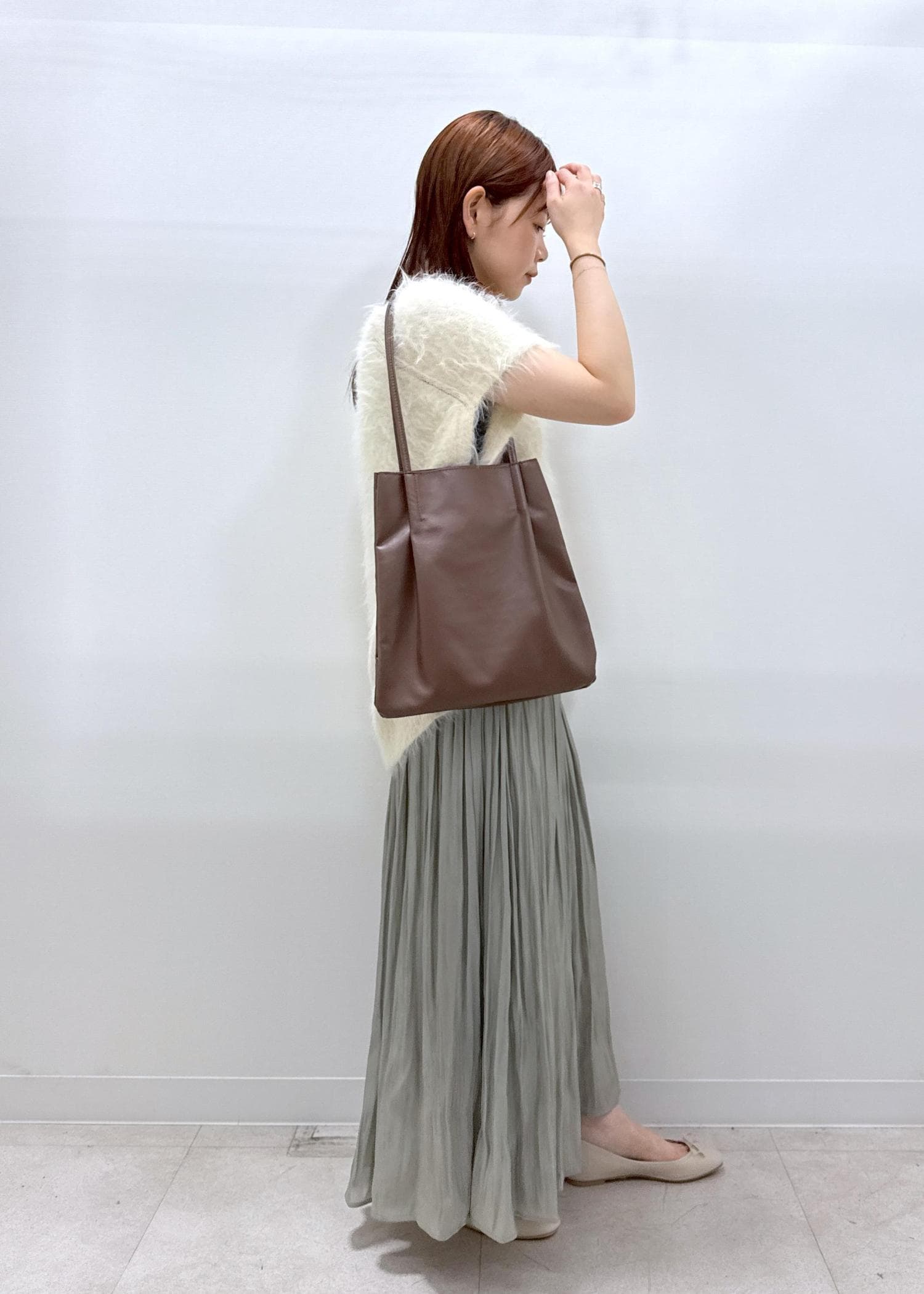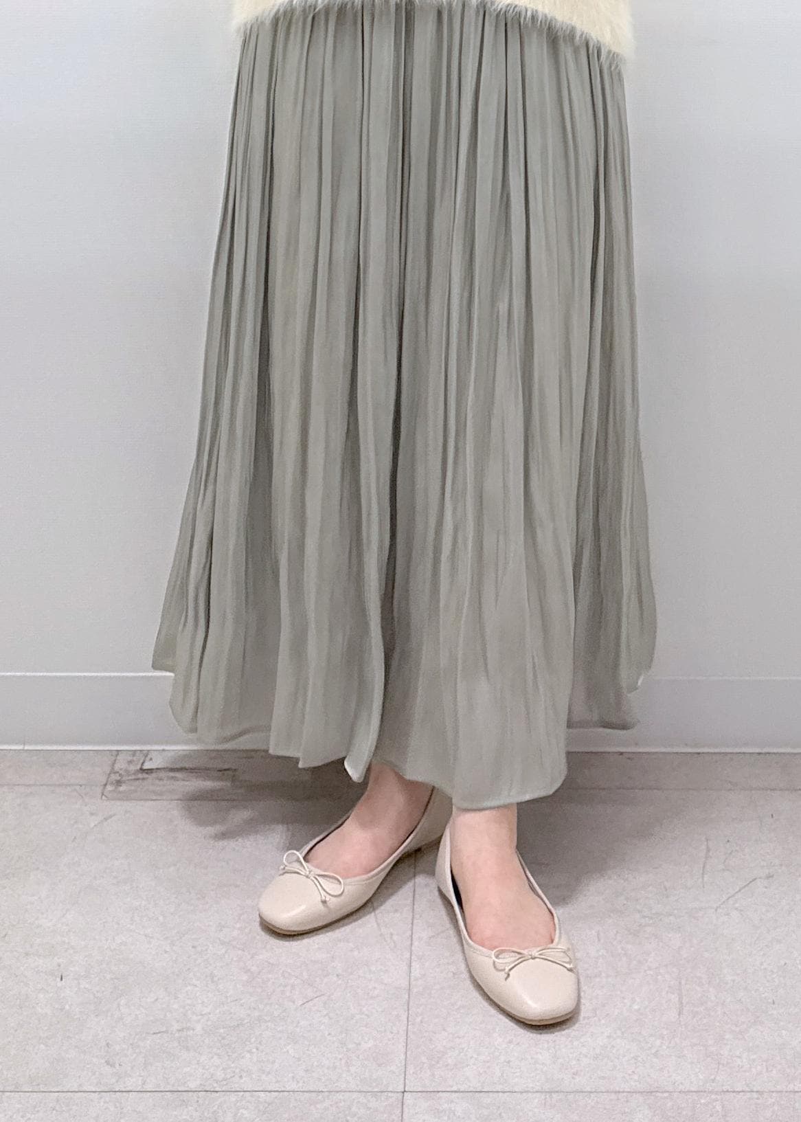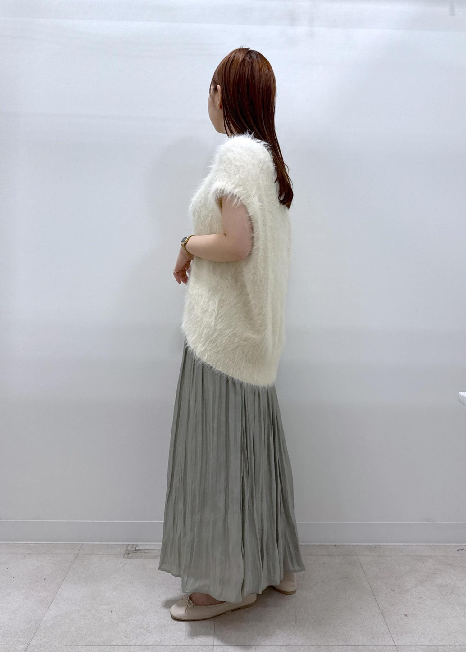 152センチの身長ですが、足首が見えるほどの丈間なのでフラットシューズでもバランス良くお召しいただけます。