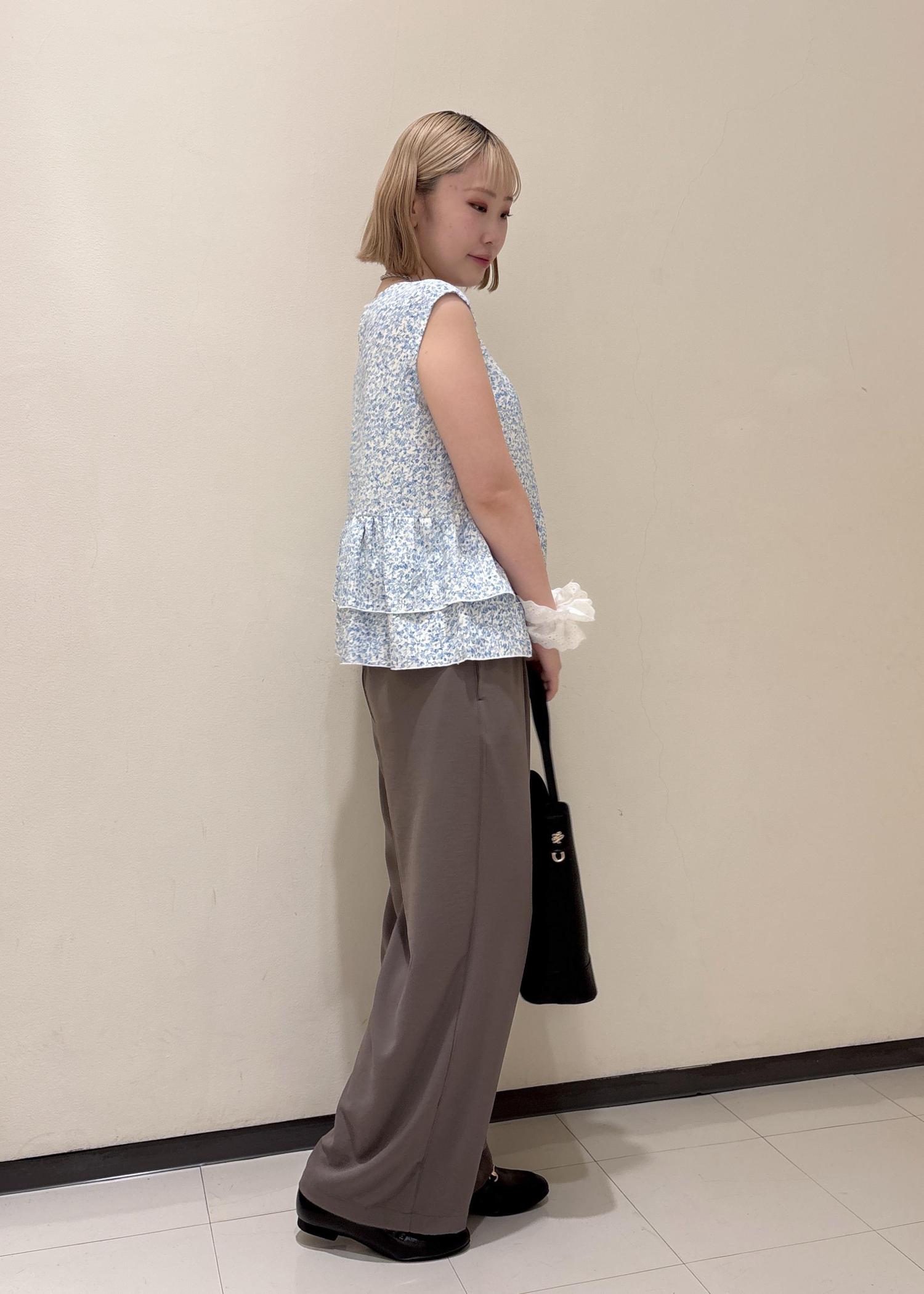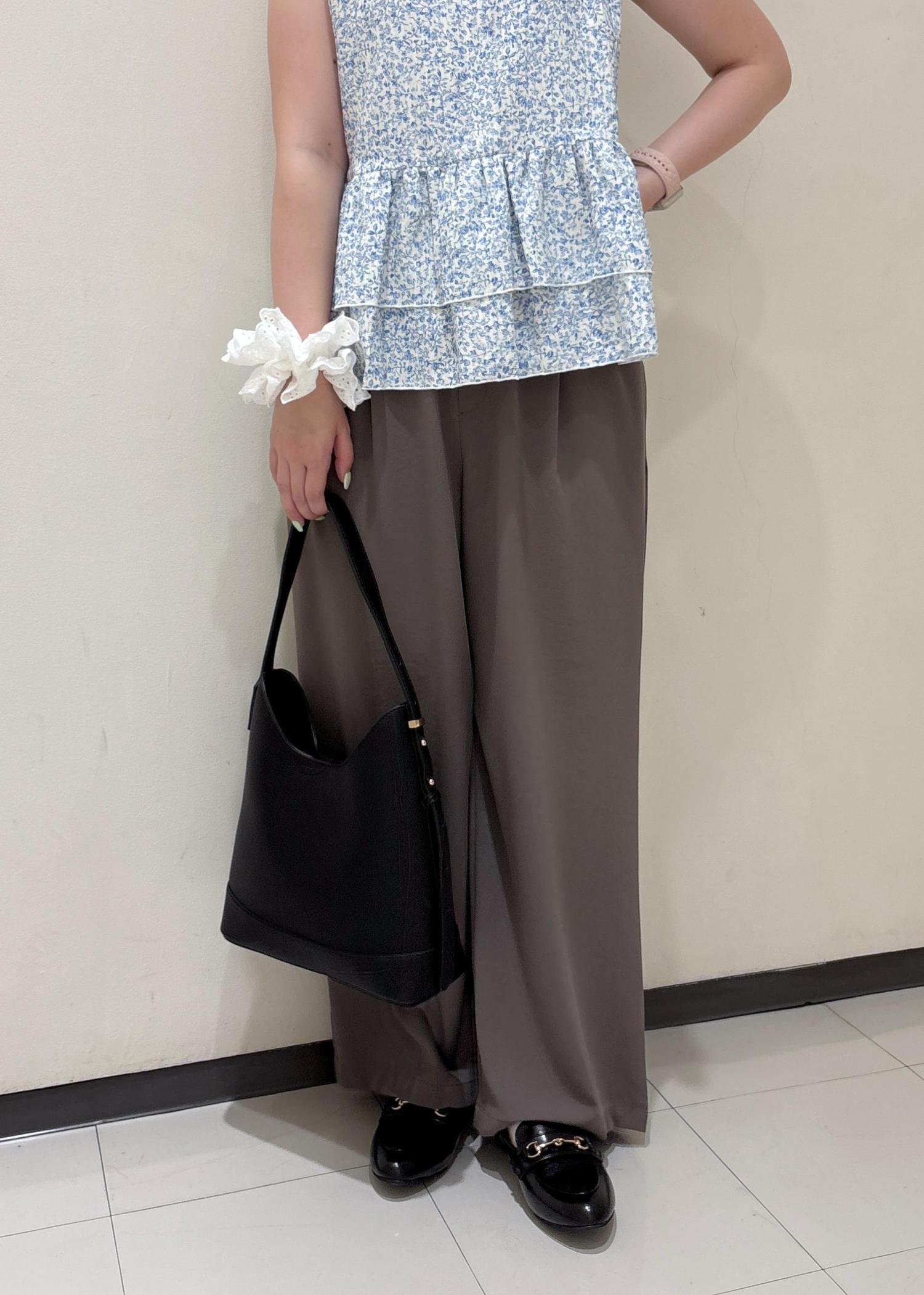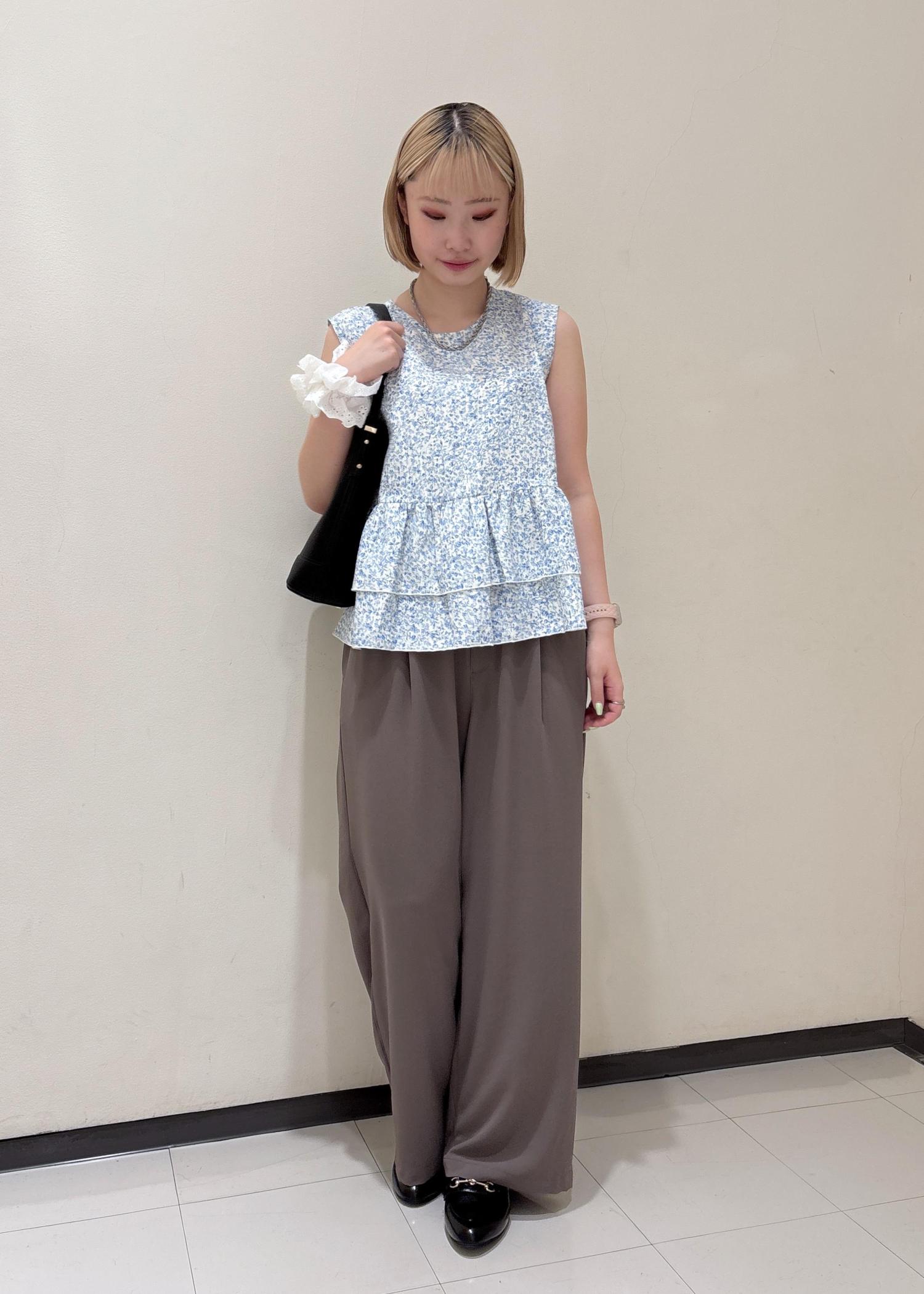 花柄のブラウスにワイドパンツを合わせた、リラックス感のあるコーディネートです。