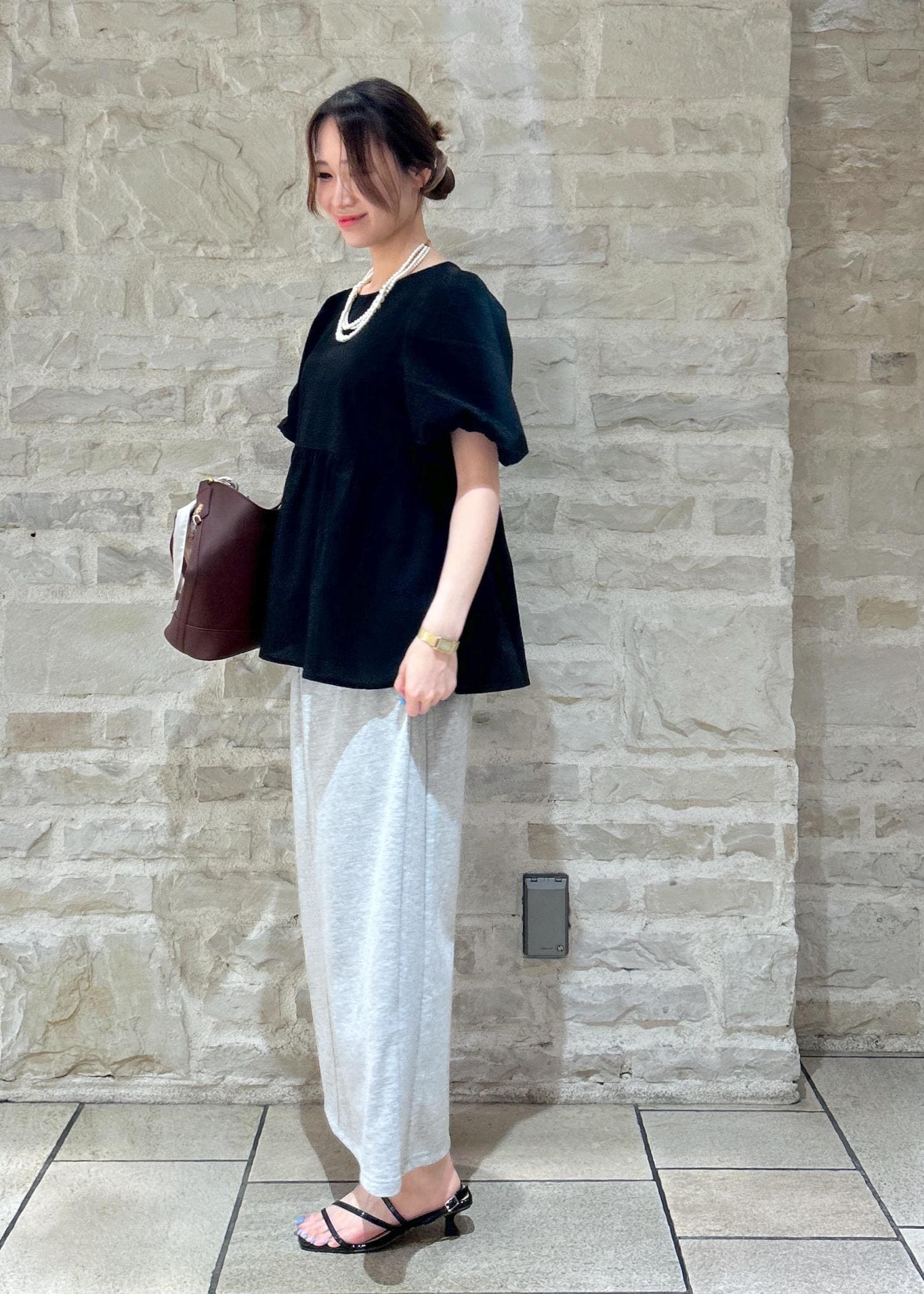 身長157センチでくるぶしくらいの丈なのでフラットなサンダルでも合わせやすいです。