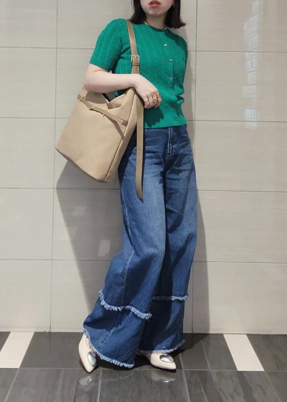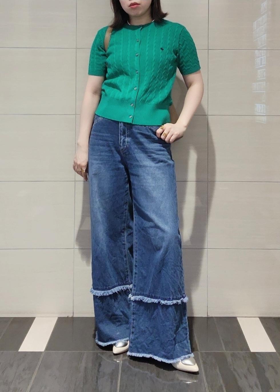 グリーンのカラーをポイントにシンプルなデニムコーデにしました!