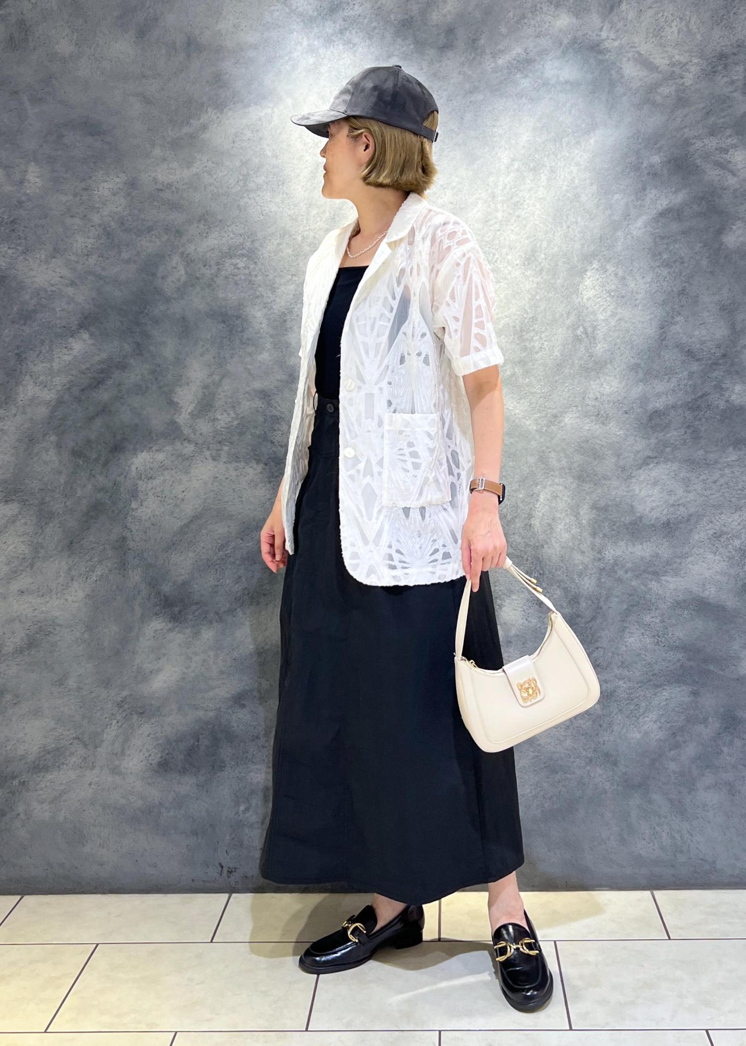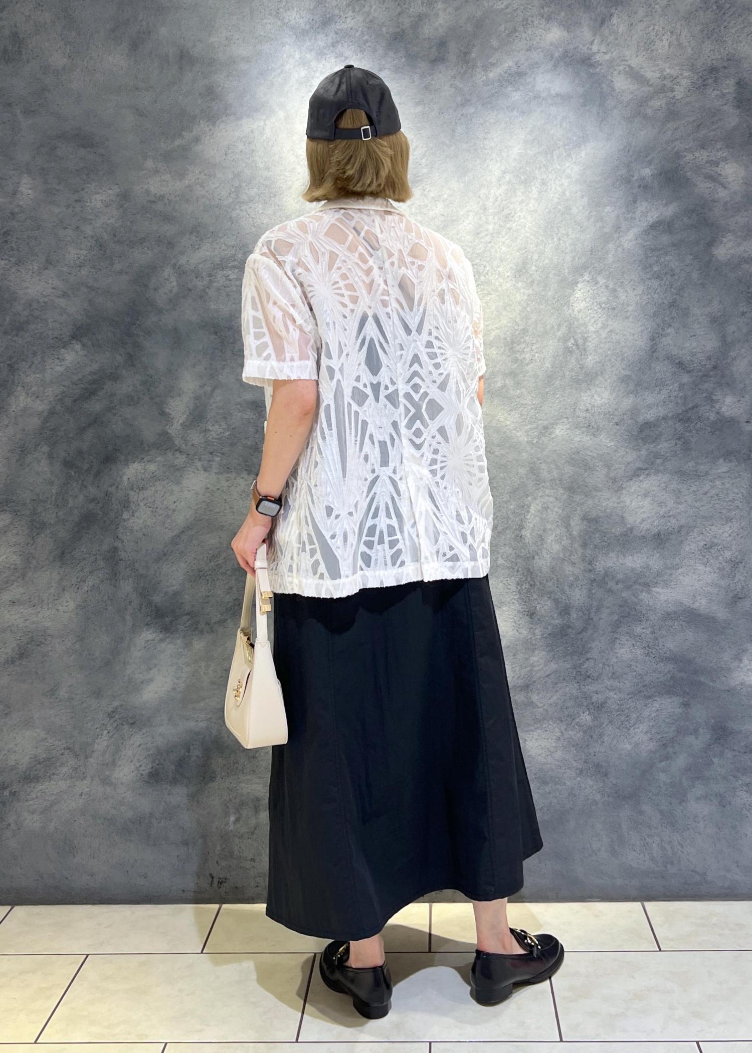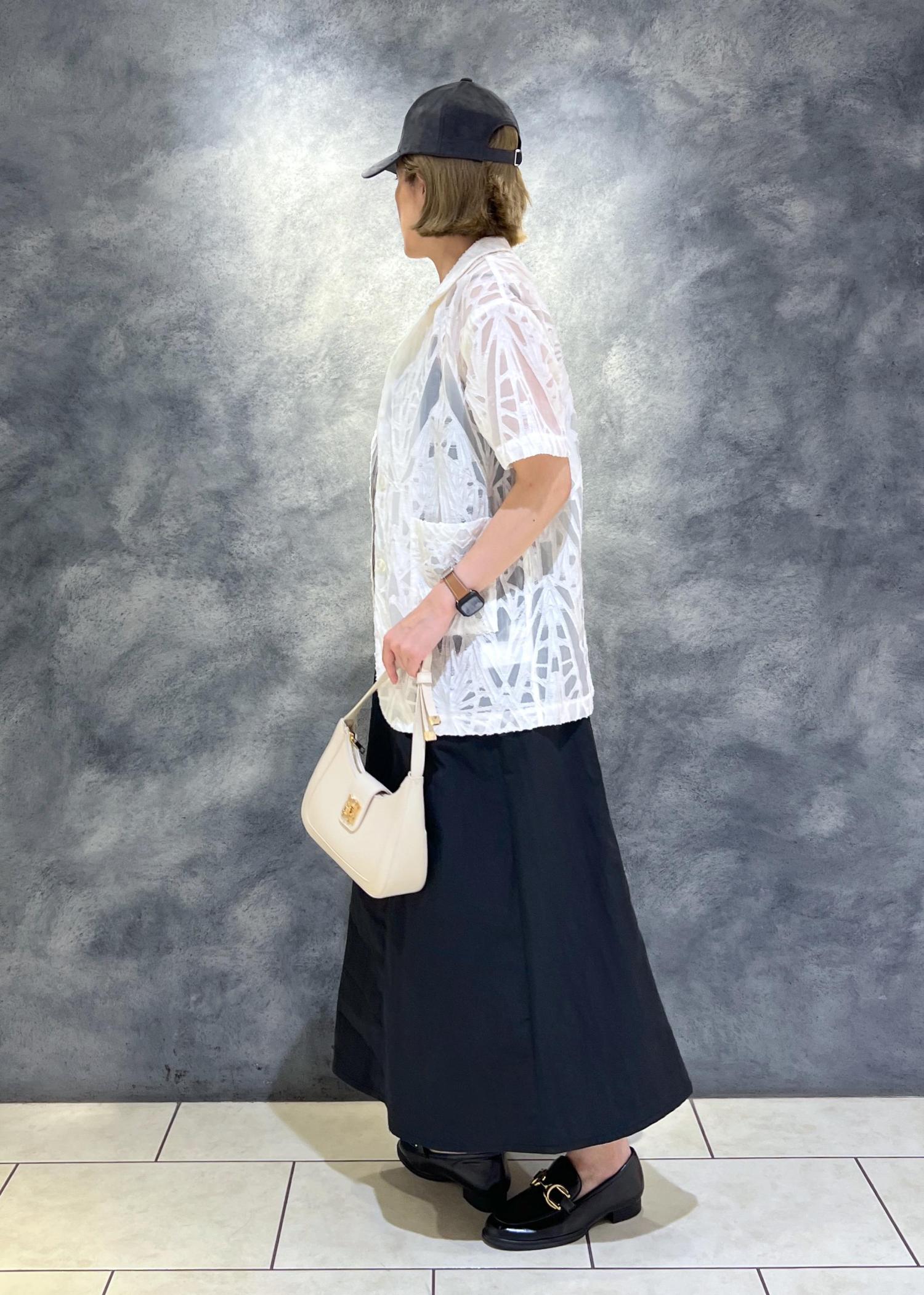 シルエットはしっかりメンズシャツのようなデザインですがシアー感のある素材が大人っぽい。