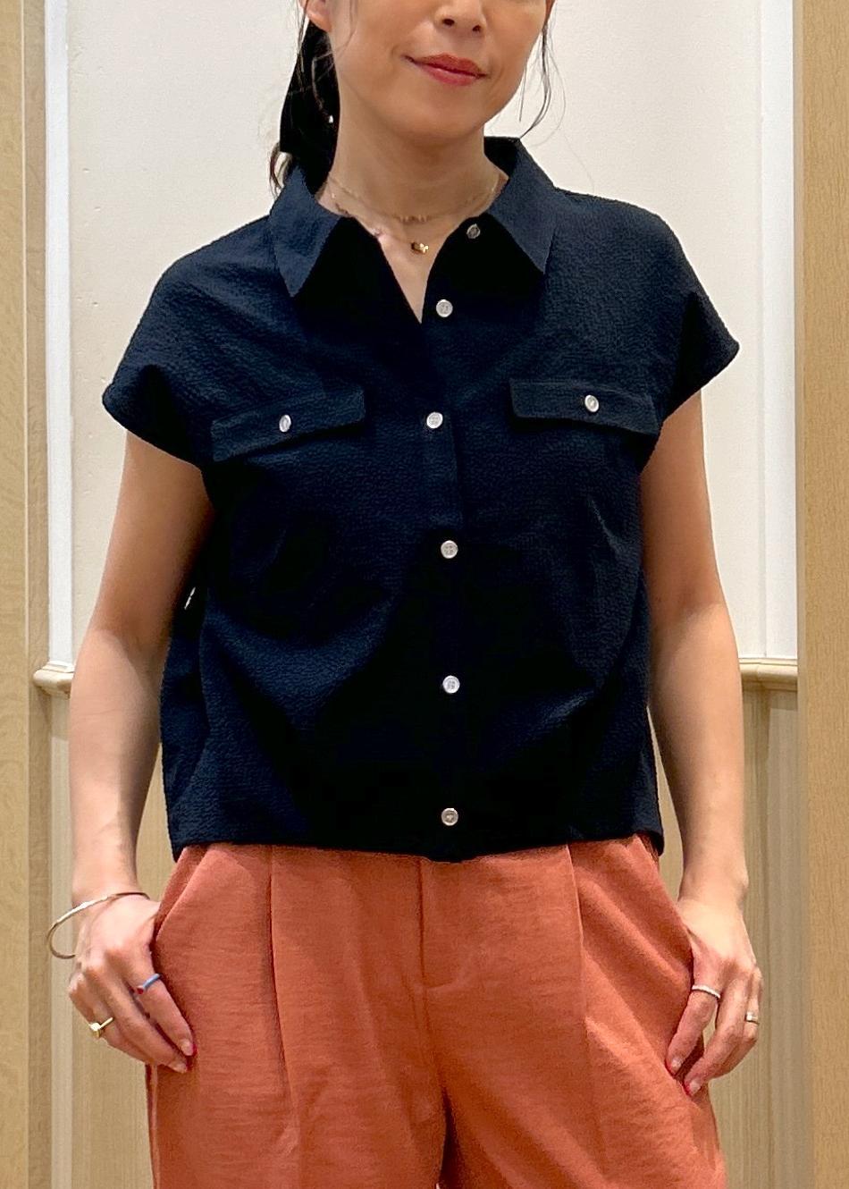 VIS【UVケア/洗える】フレンチスリーブサッカーブラウスネイビー系 / F¥4,389レビュー153cmで腰にかかるくらいの丈感です。