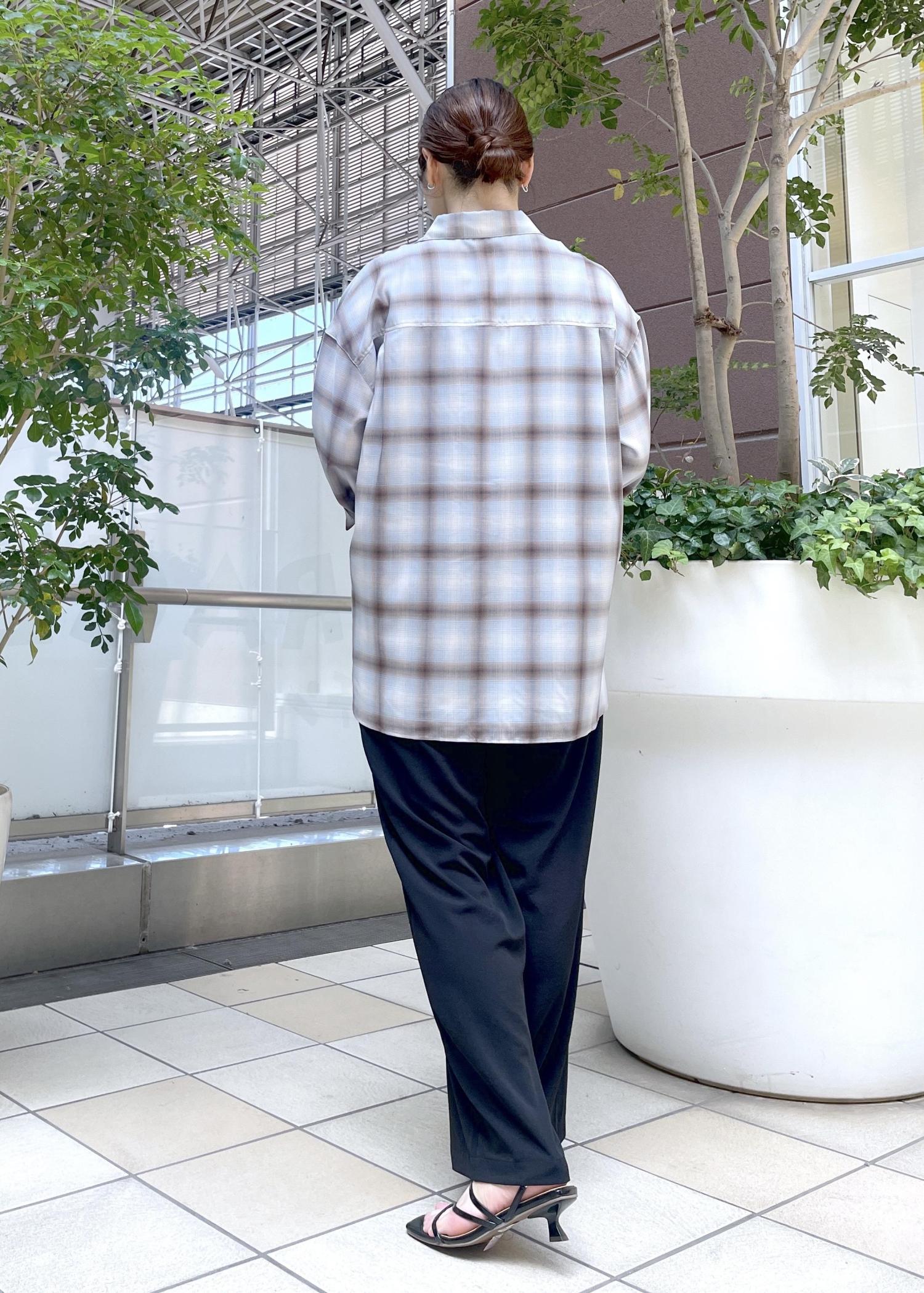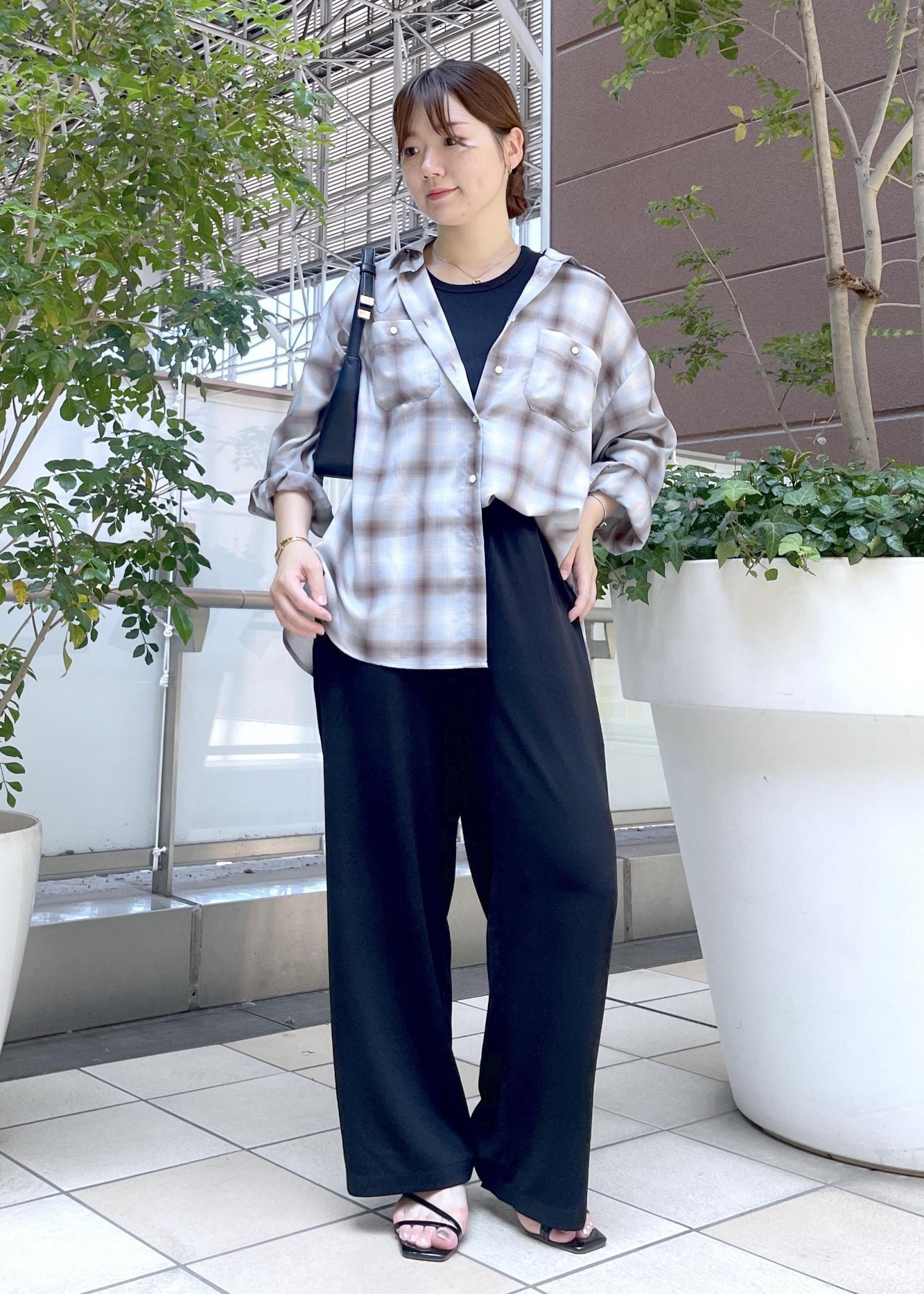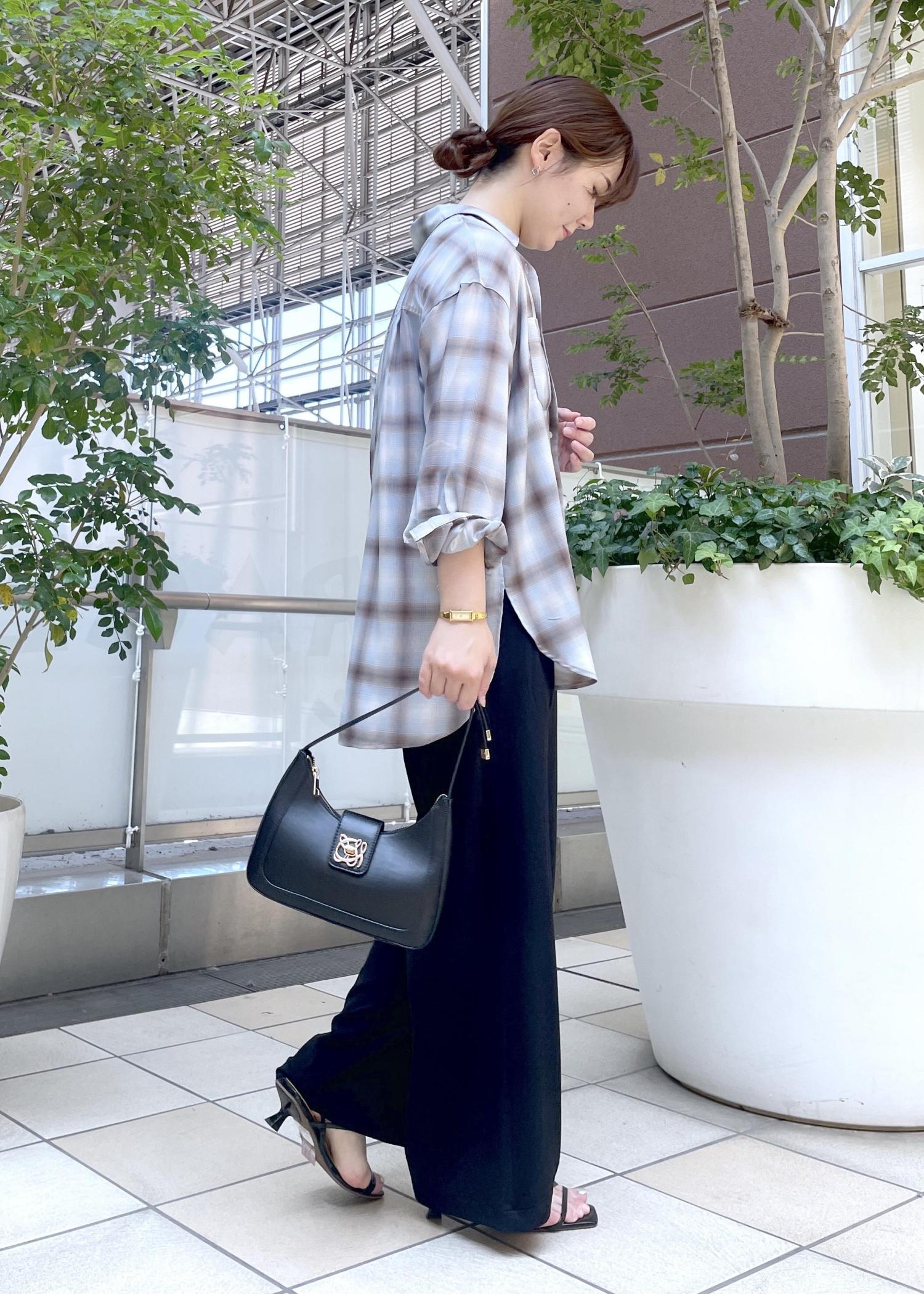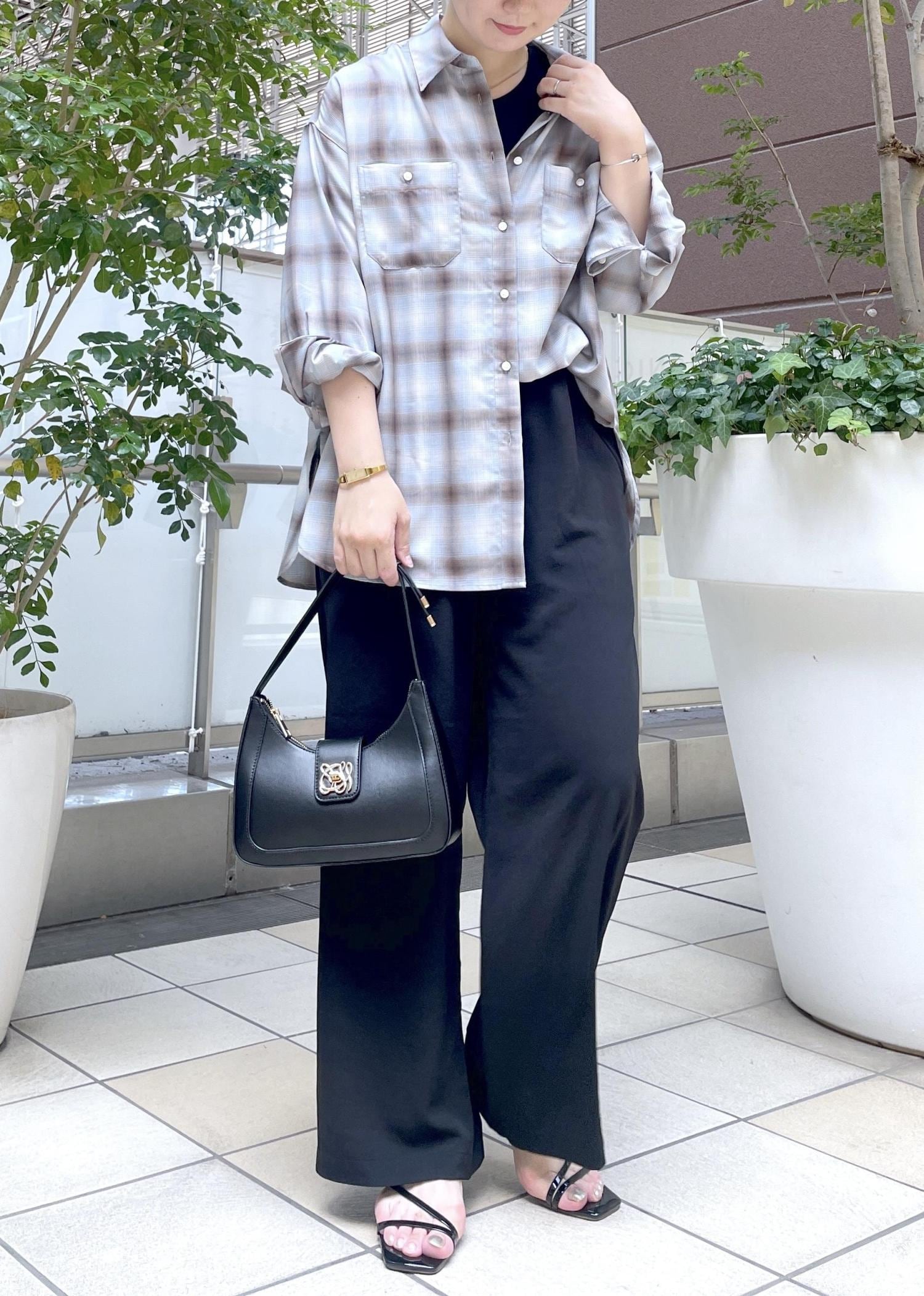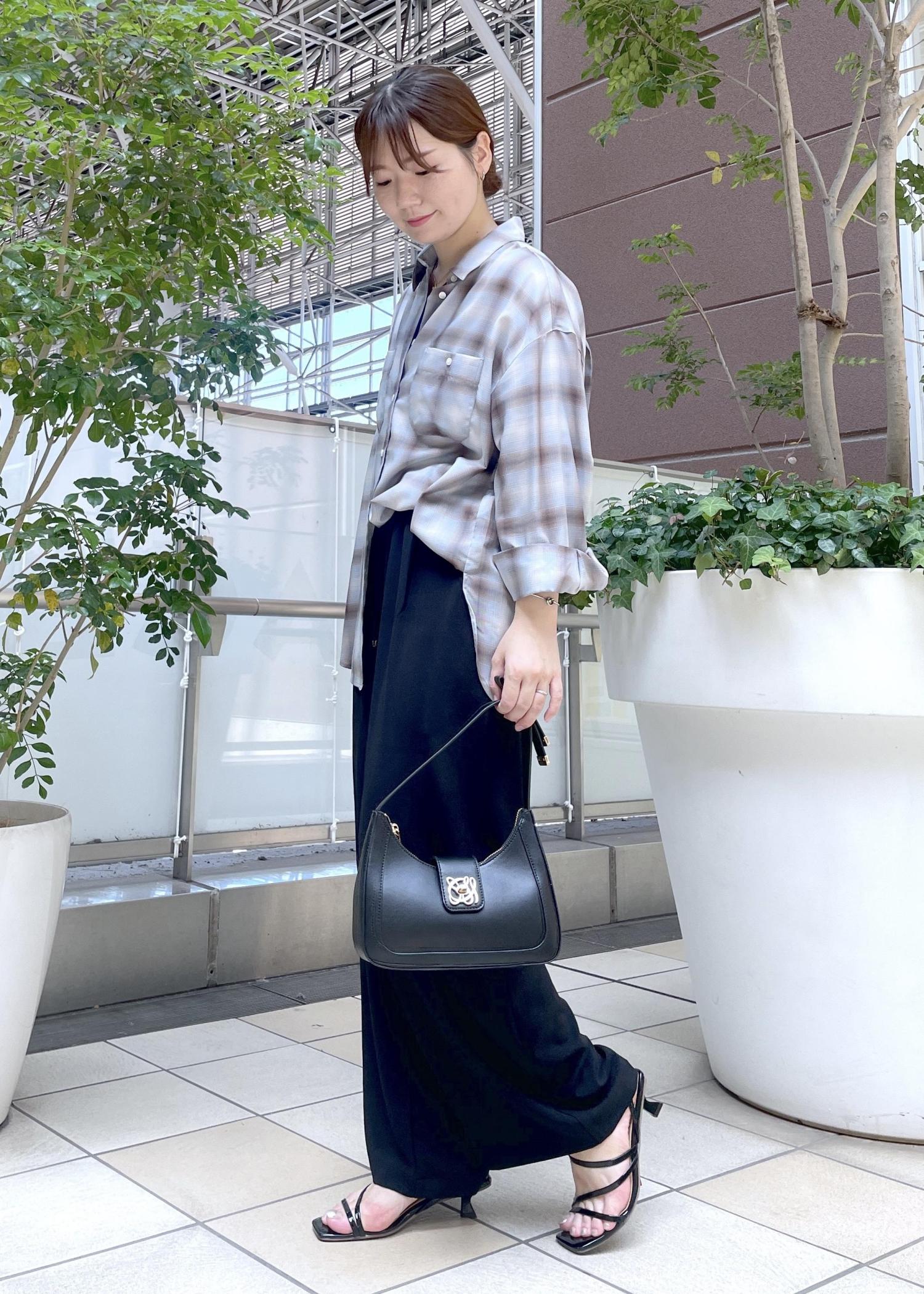 カジュアルイメージの強いチェックシャツをブラックのアイテムと合わせて大人っぽいコーディネートにまとめました。