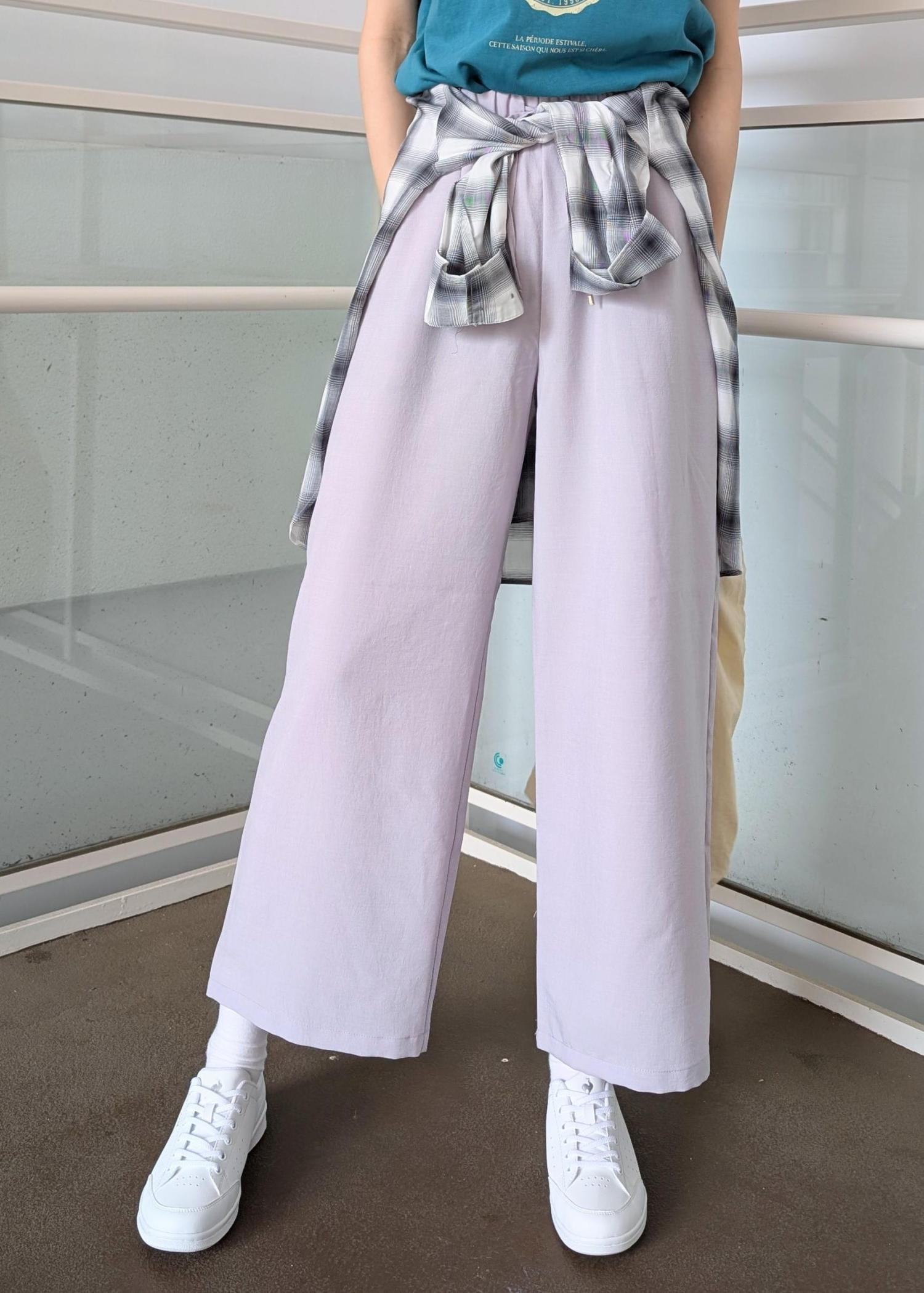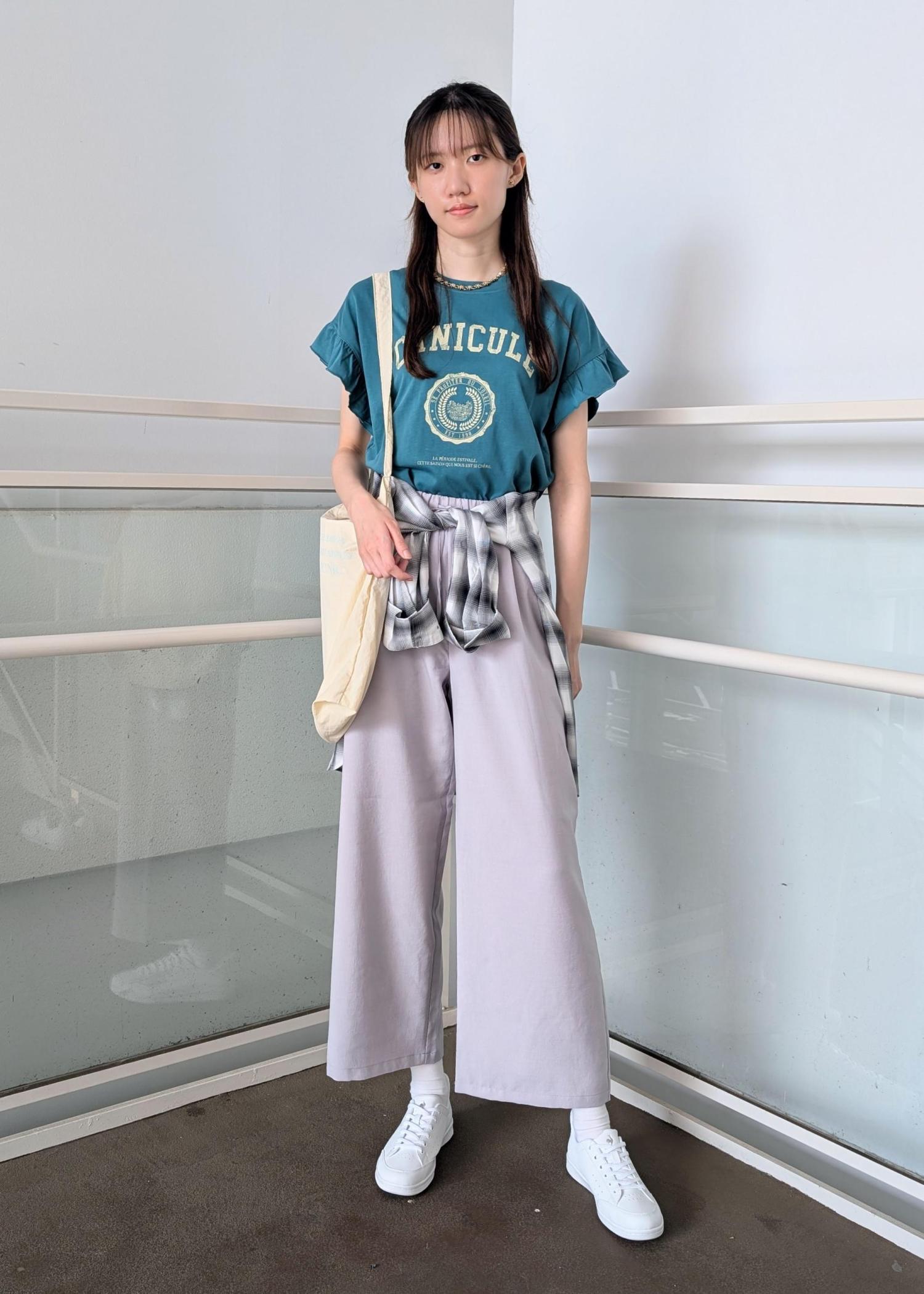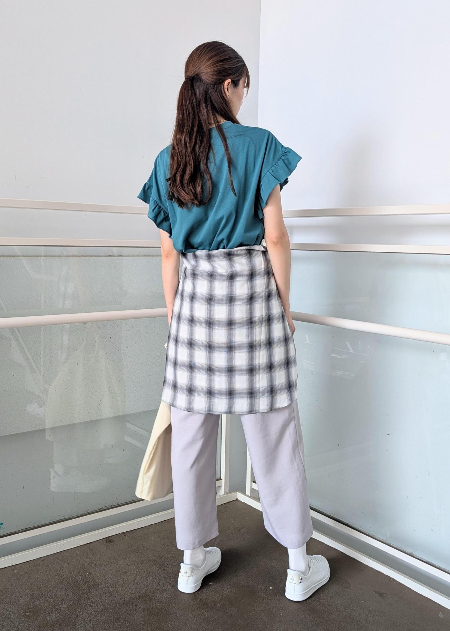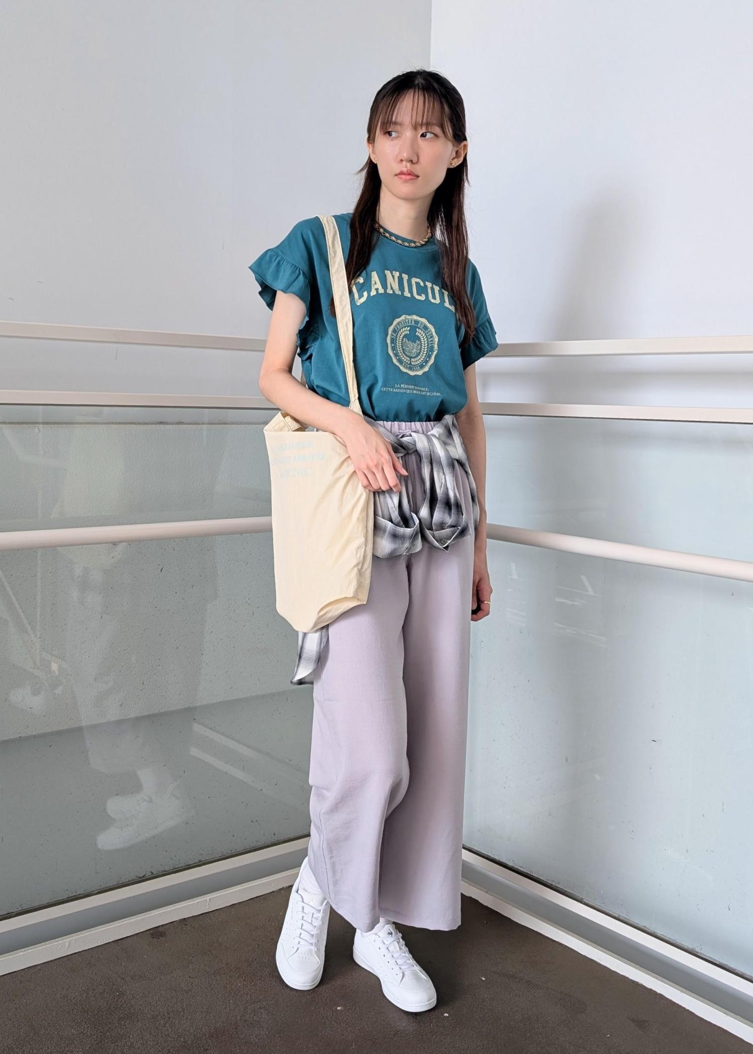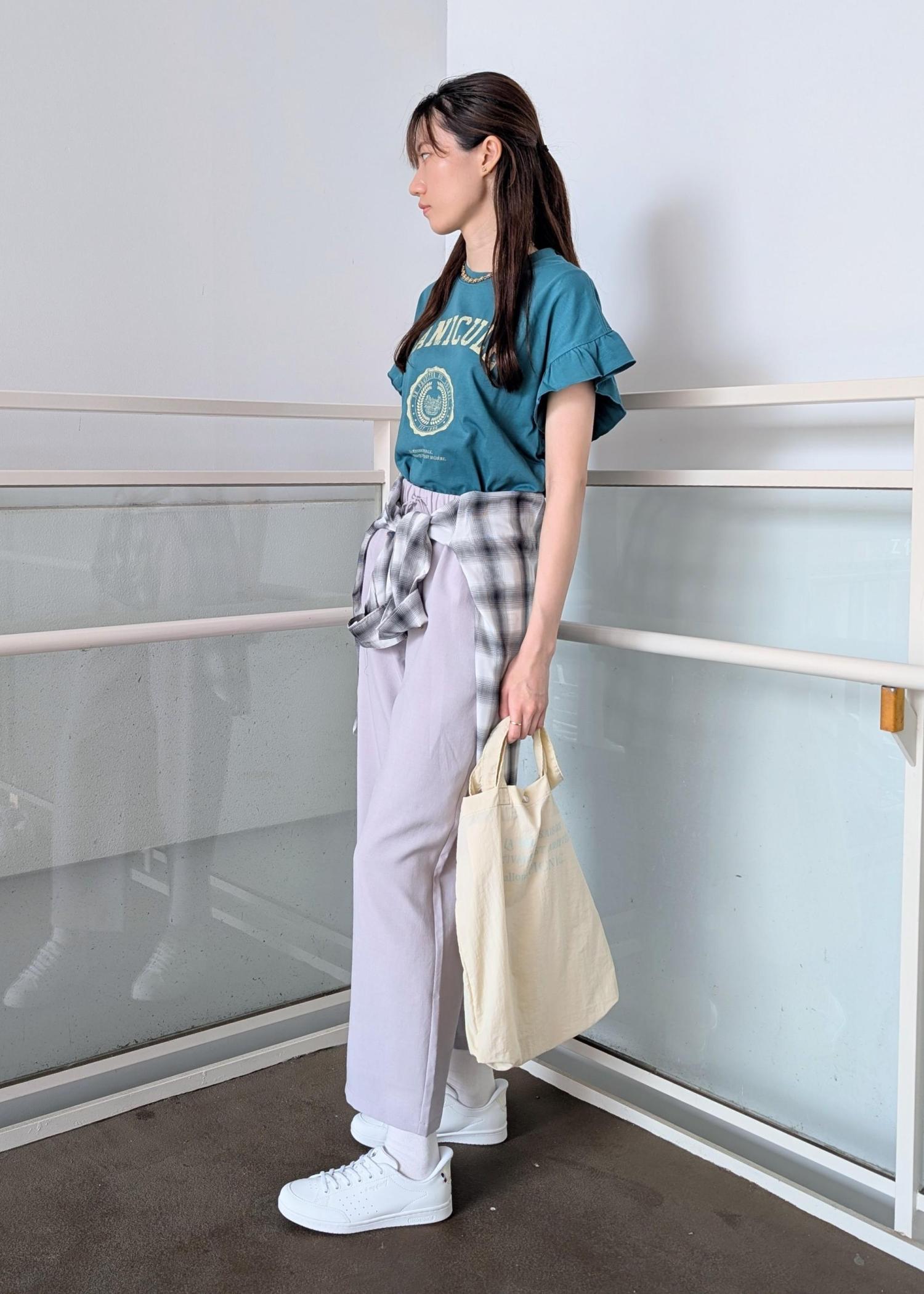 Tシャツにさらっとしたパンツで暑さ対策しつつチャックシャツを腰に巻いて秋っぽさも取り入れました。