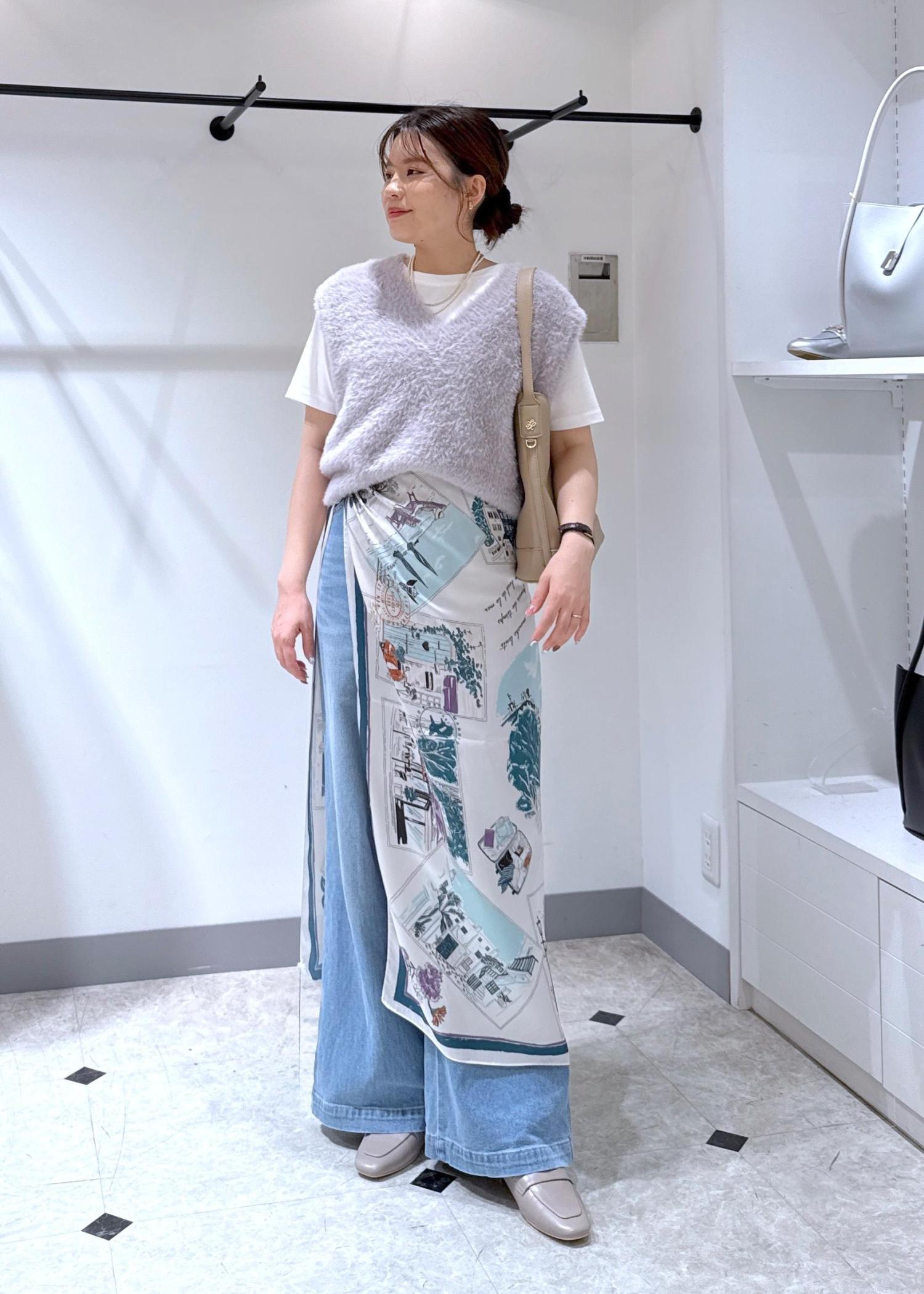 フェザーニットベストやスカーフアレンジなど今年らしいアイテムを合わせたトレンド感のある大人カジュアルコーデにしてみました!