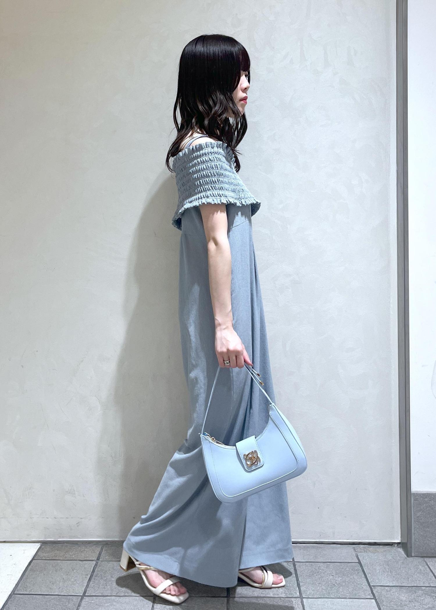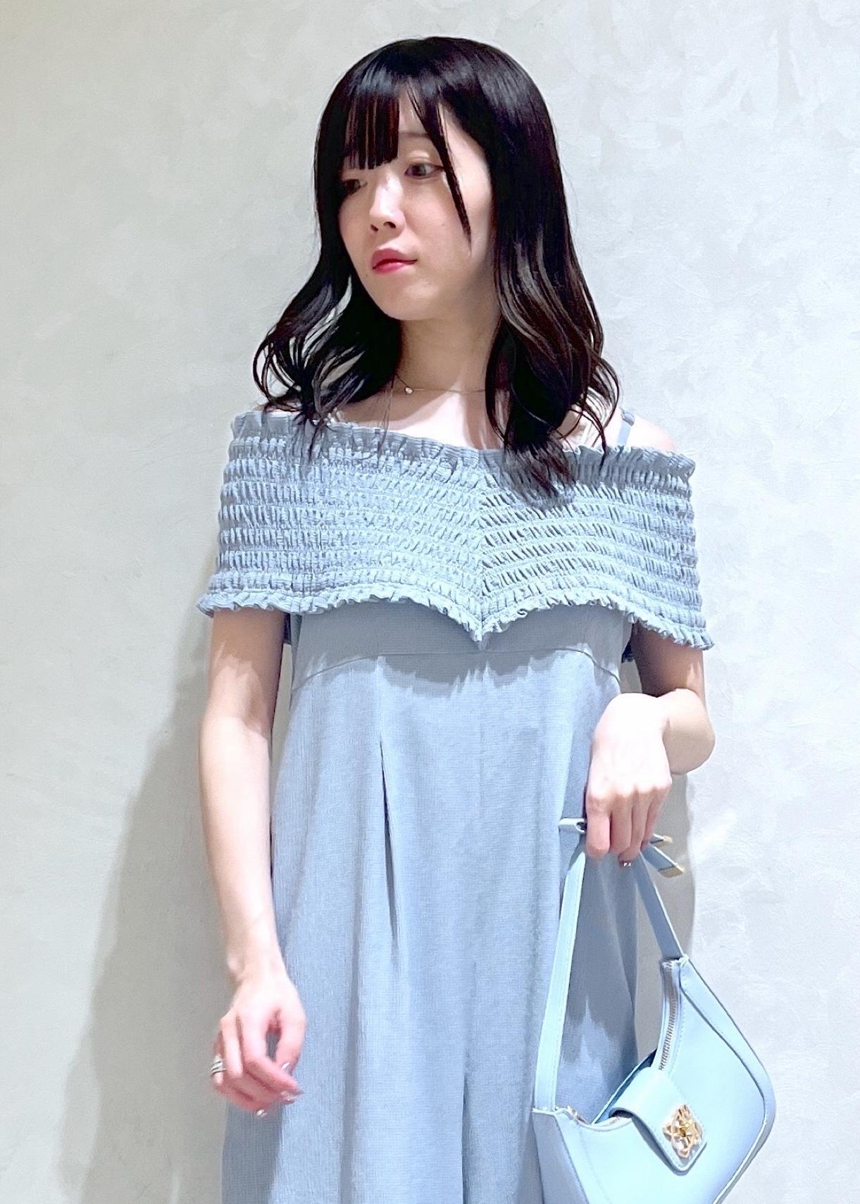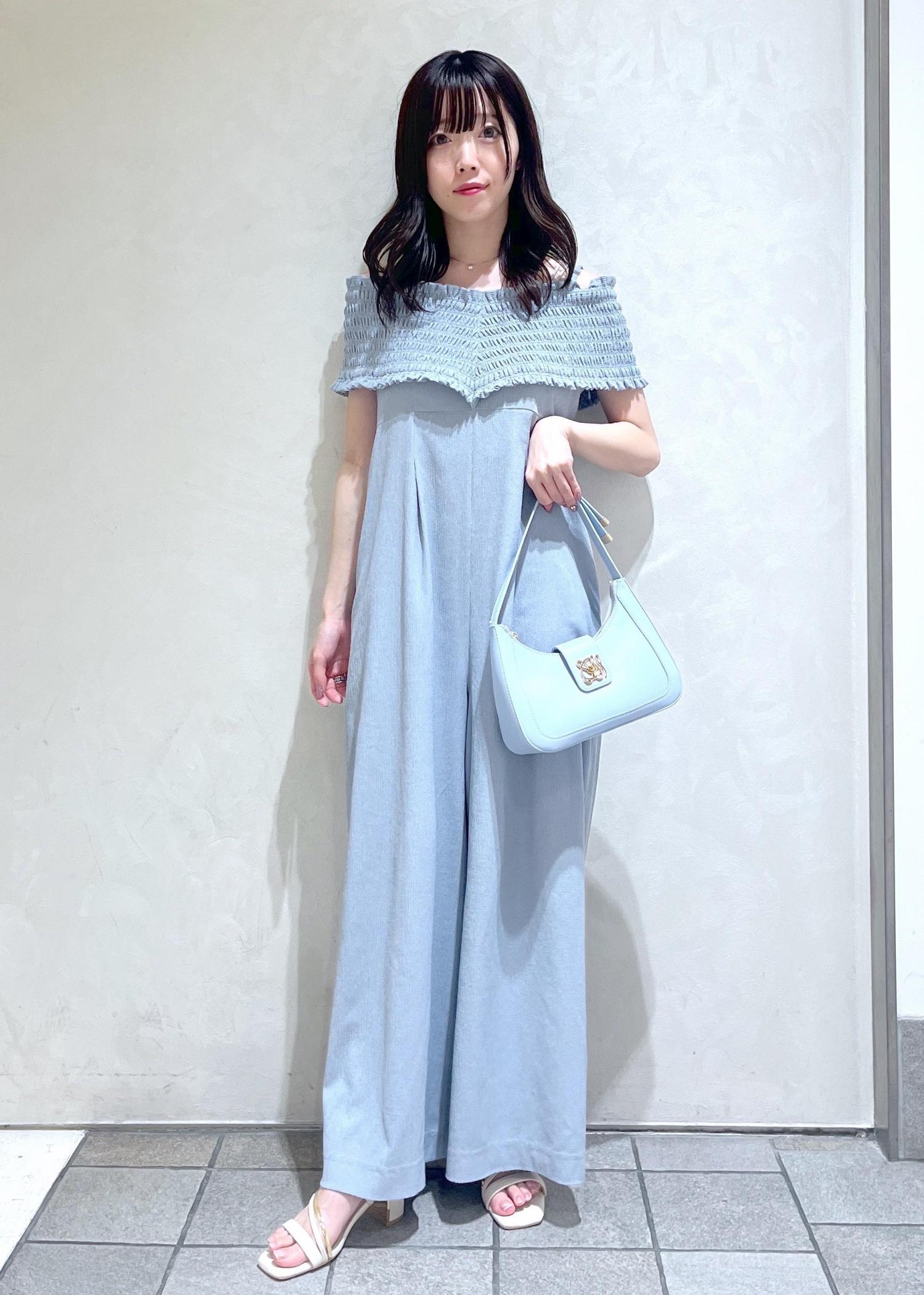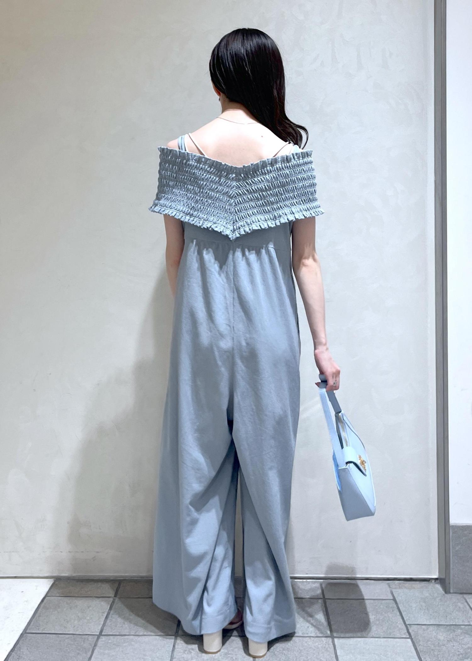 アウトレットVISシャーリングオフショルダーオールインワンブルー系 / F¥6,327レビューすごく軽くて涼しく、夏にピッタリなデザインです!