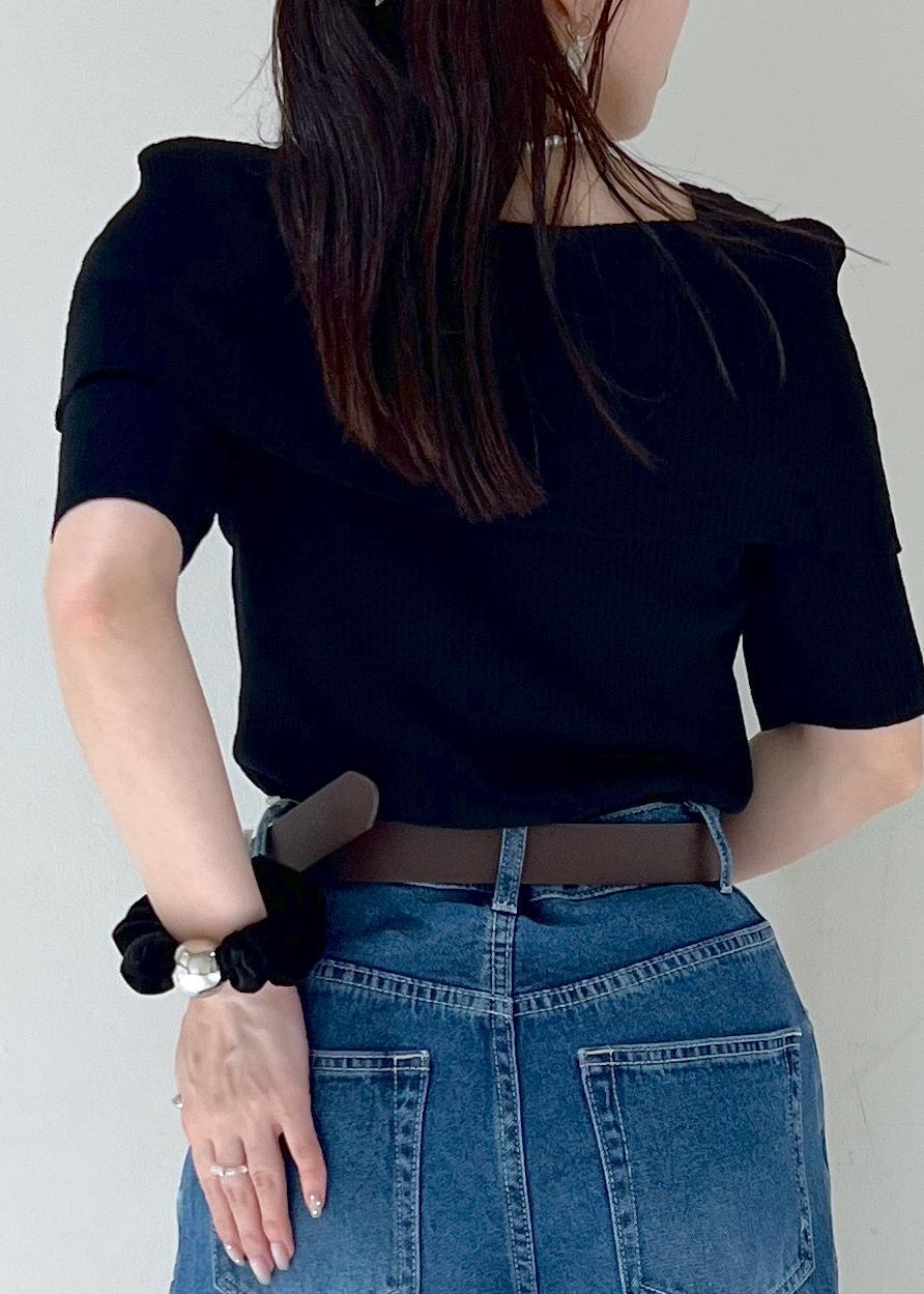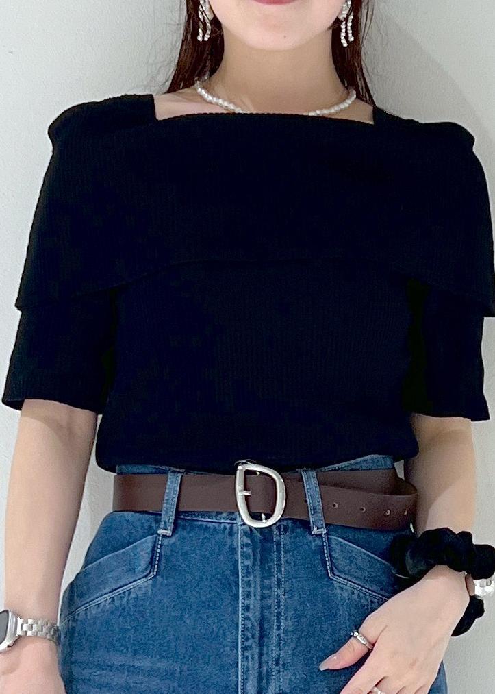 VIS【アンチピリング/UVケア/洗える】オフショルハーフスリーブニットブラック / F¥4,939レビューオフショル風のデザインですが、肩にマチがついているのでインナーの紐などが見えないデザインです◎