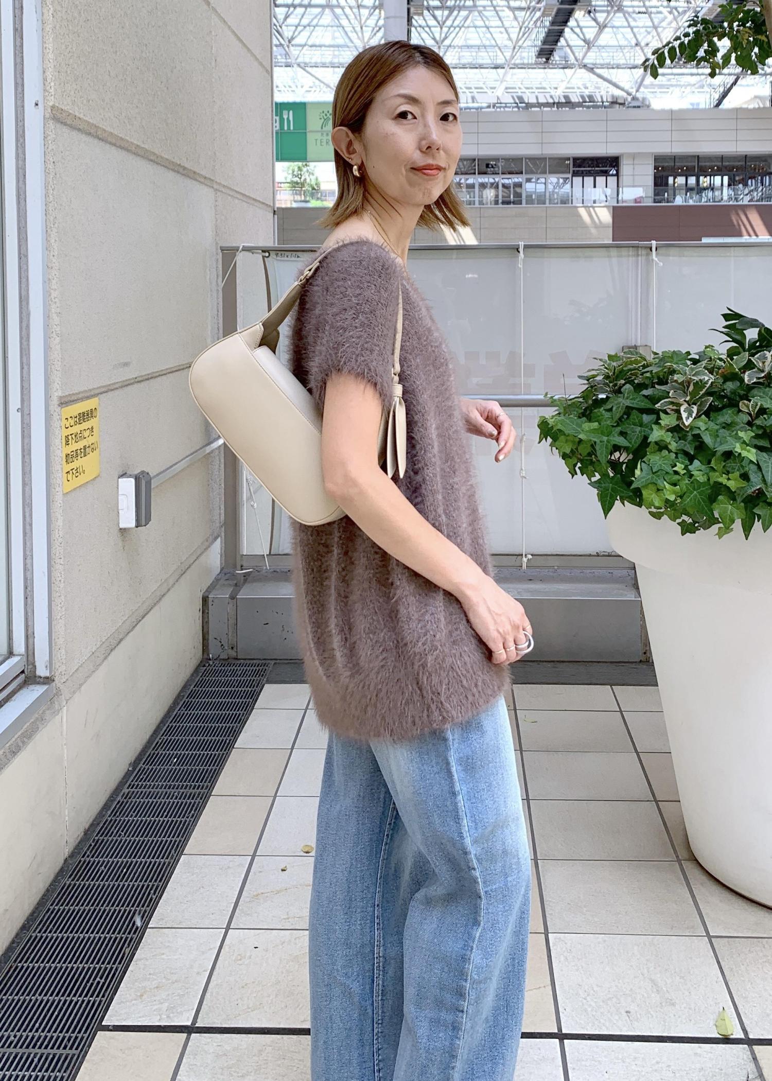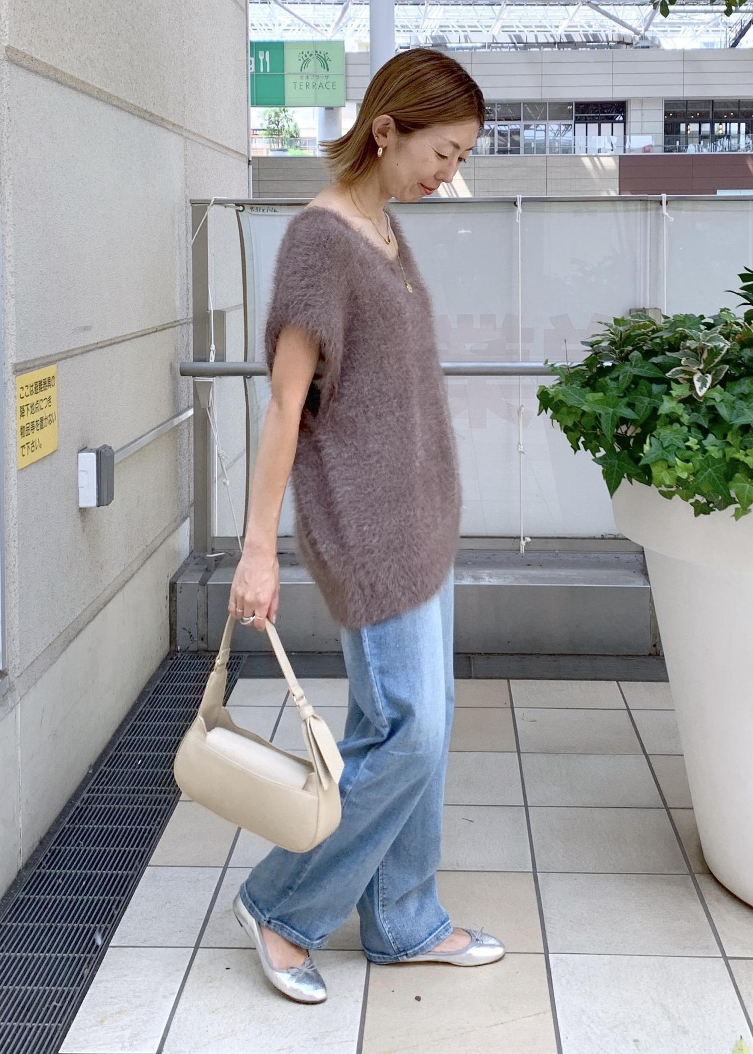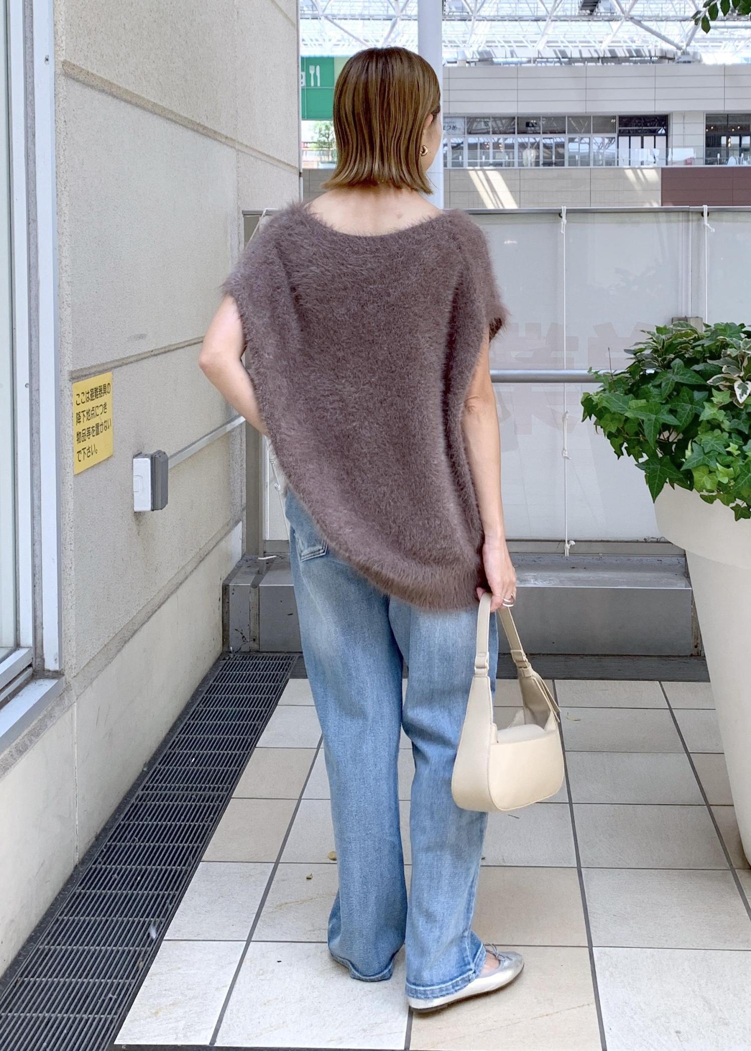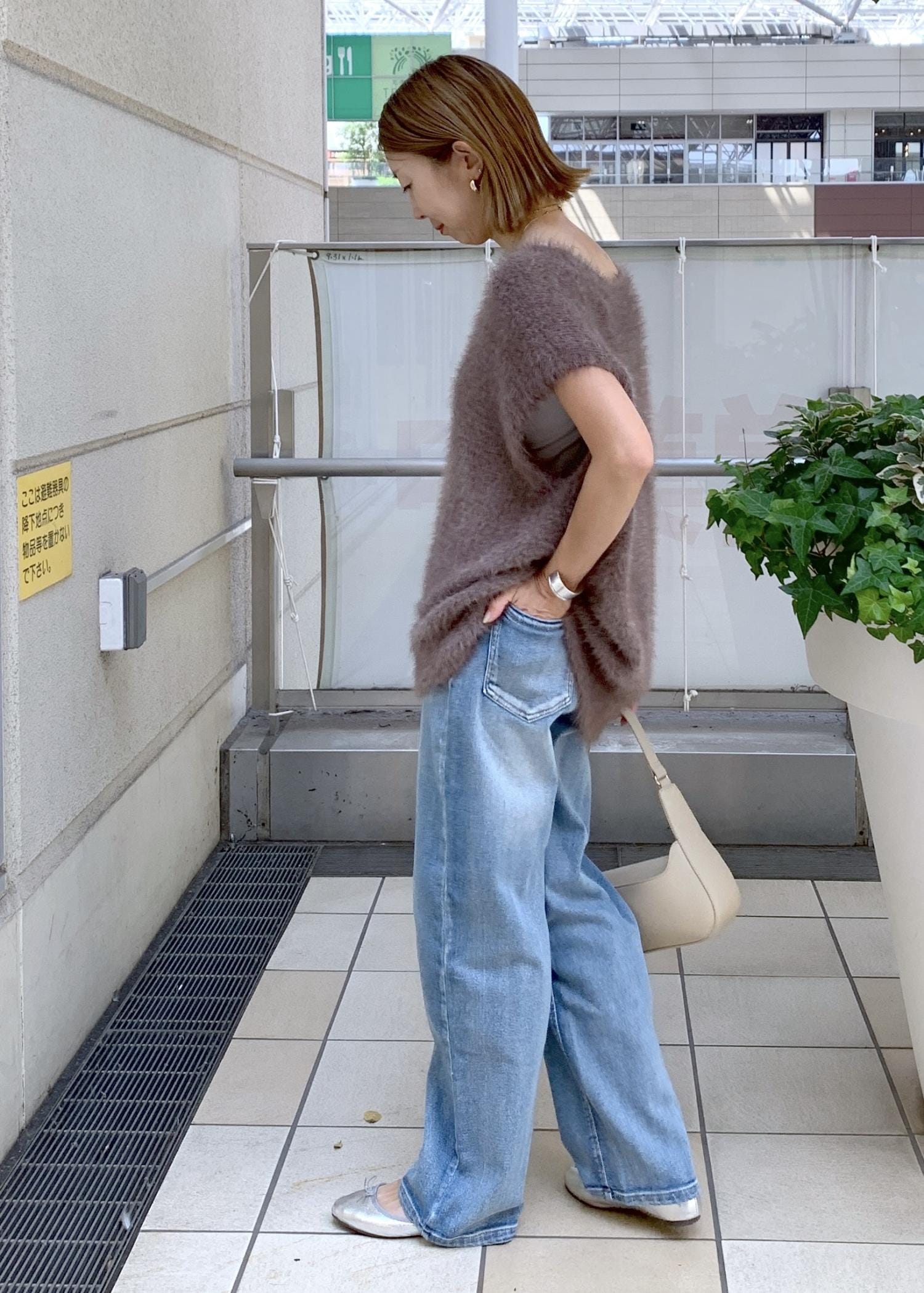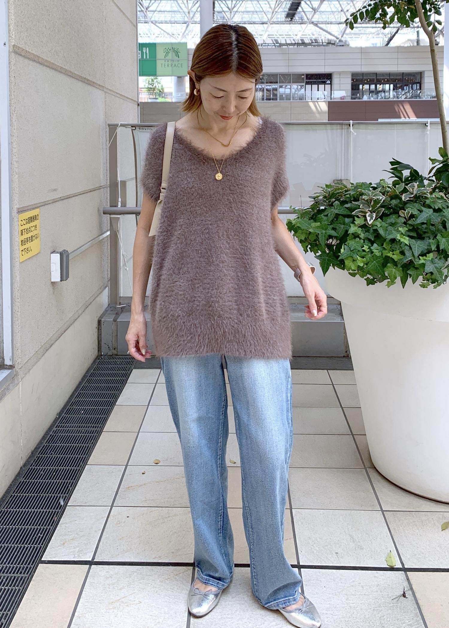 ふわふわのシャギーニットベストとデニムのカジュアルスタイリング。