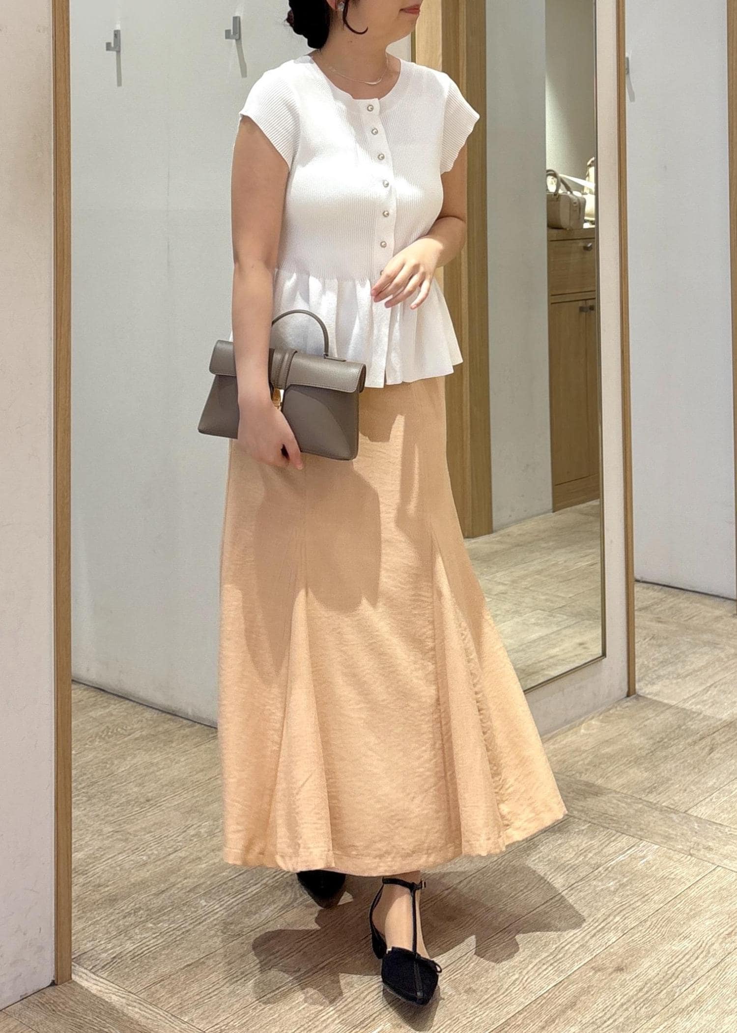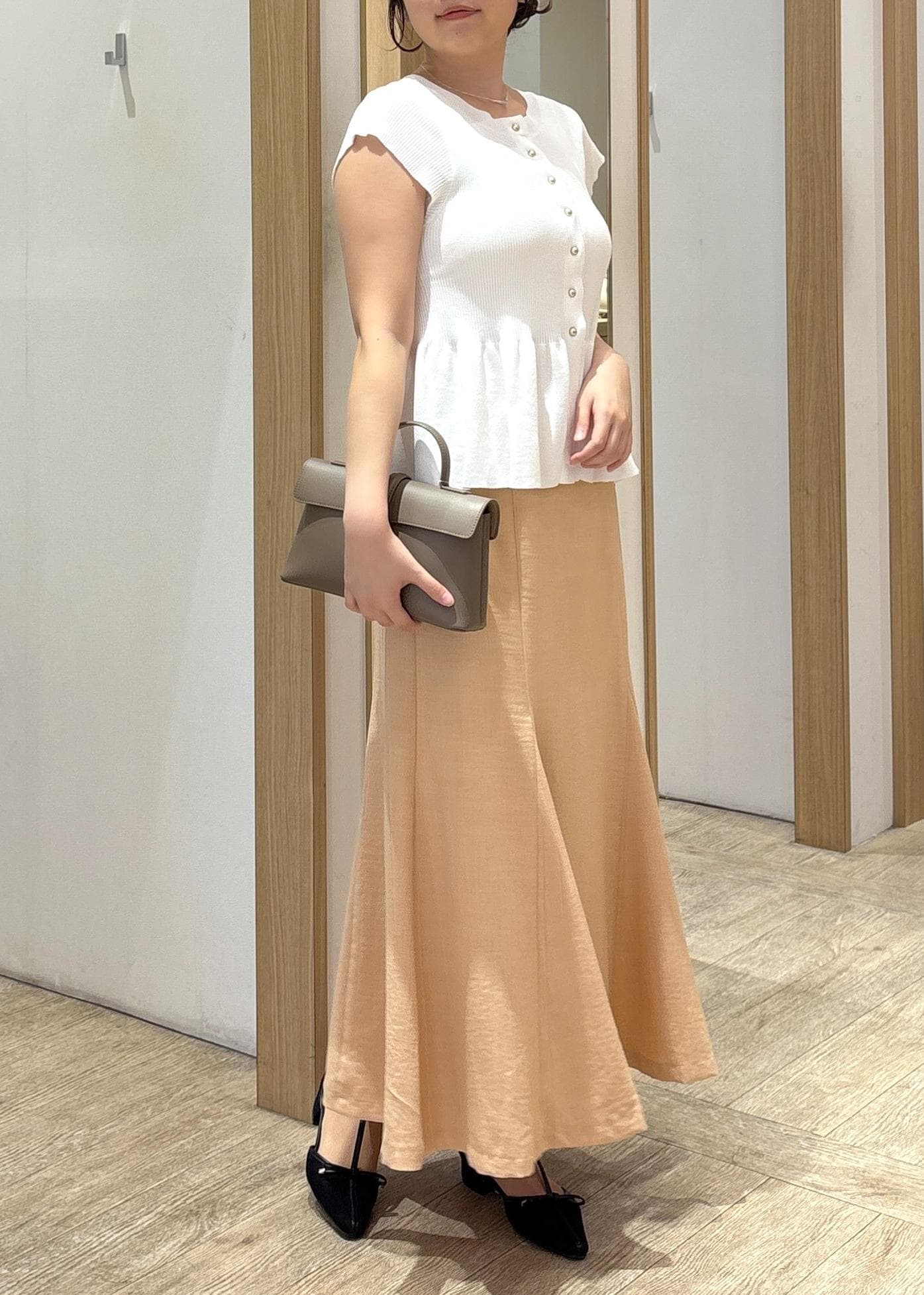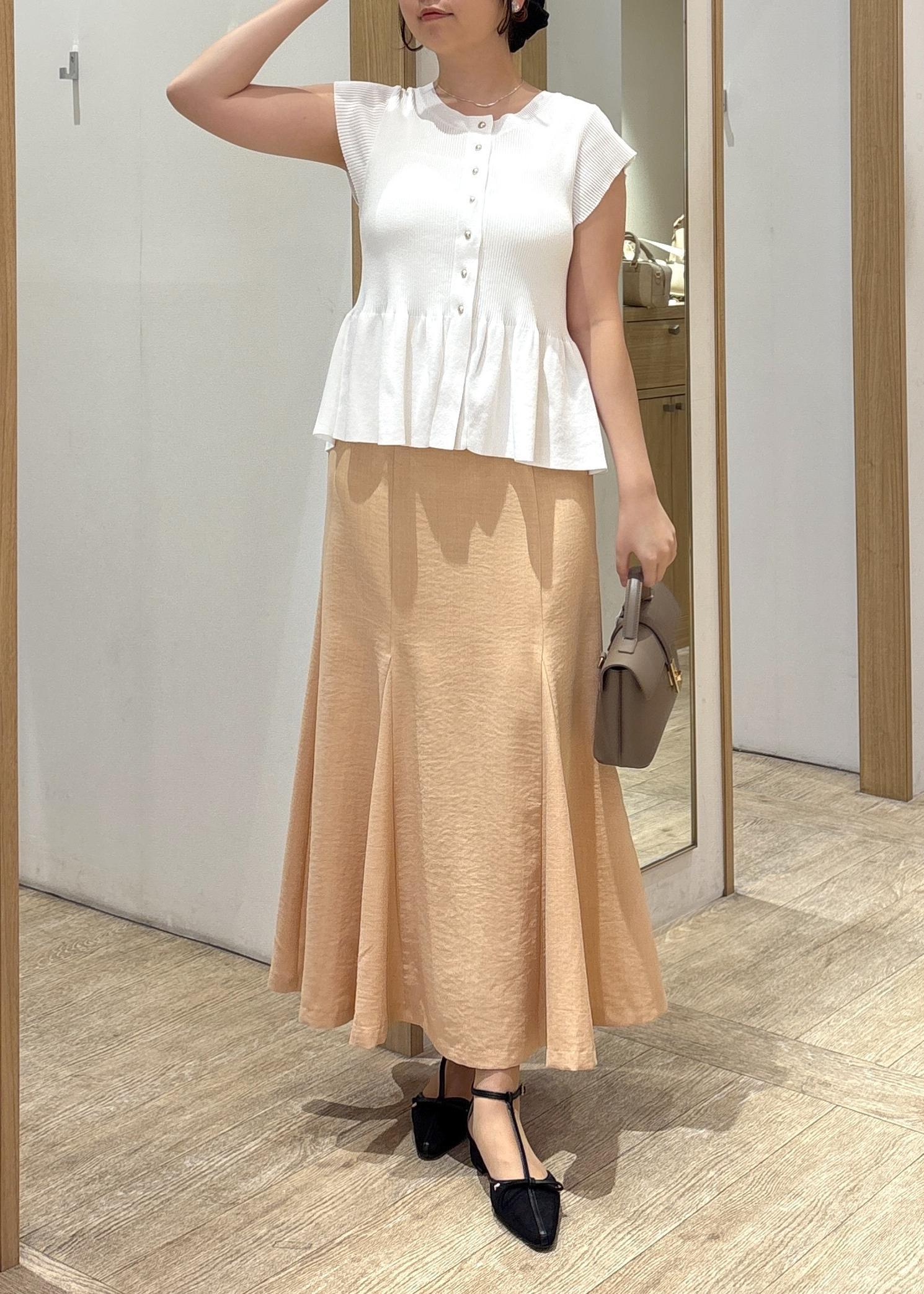 ボディラインを拾いすぎない柔らか素材のリブニットに、動くたびに美しく揺れ、エレガントな印象のマーメイドスカートを合わせたコーディネートです。
