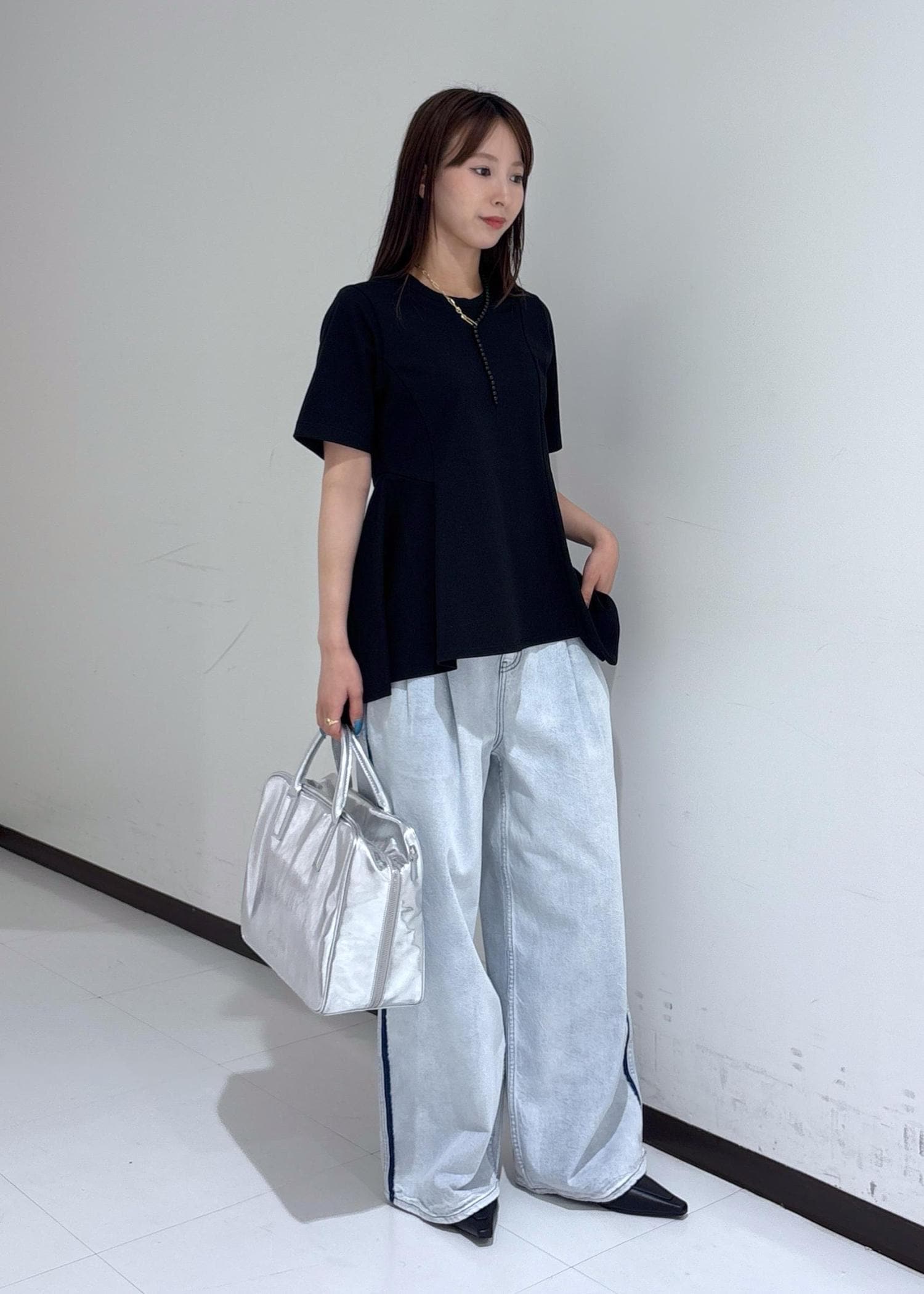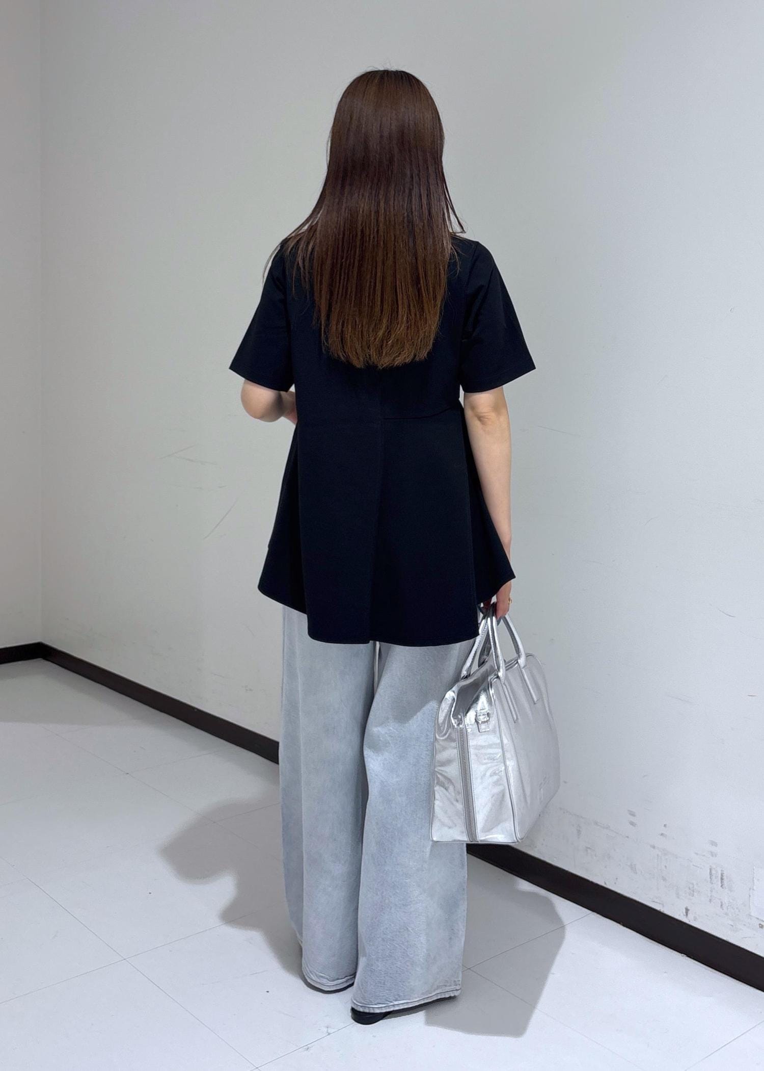 トップスは、Tシャツ感覚で気軽に着られますがデザイン性があるのでデニムと合わせると綺麗めな印象になります。