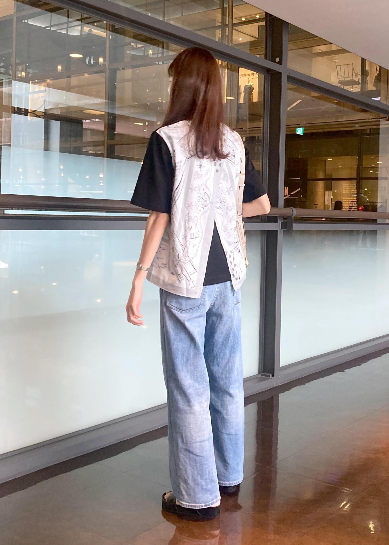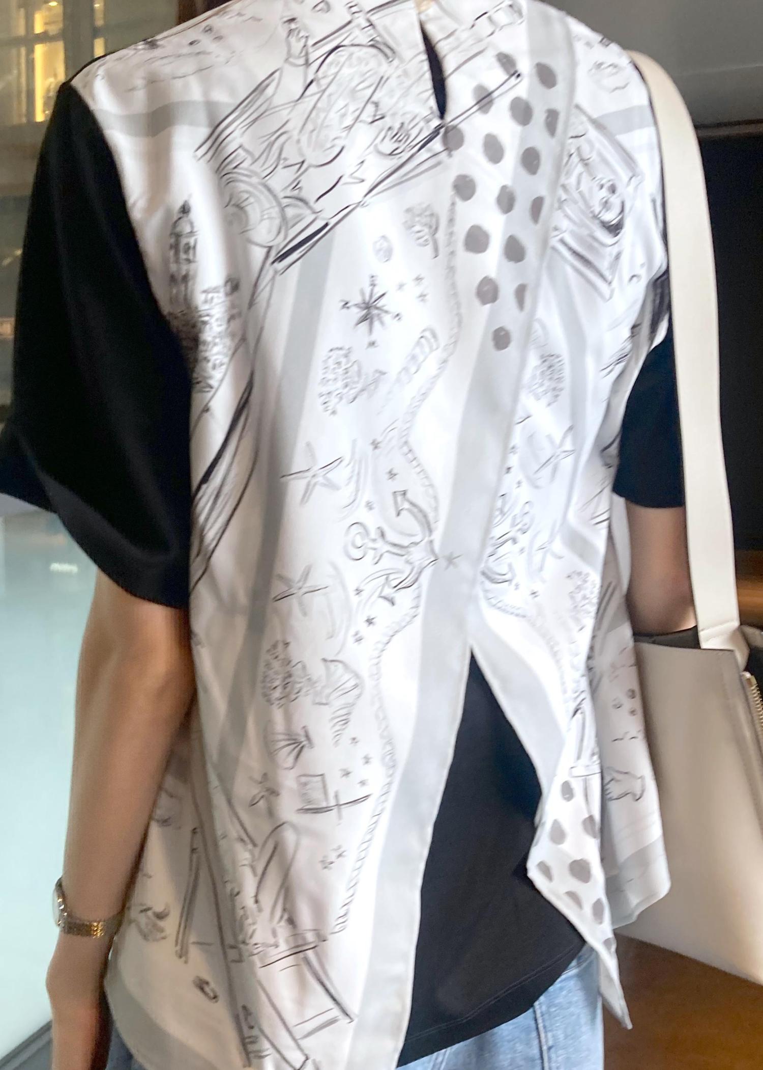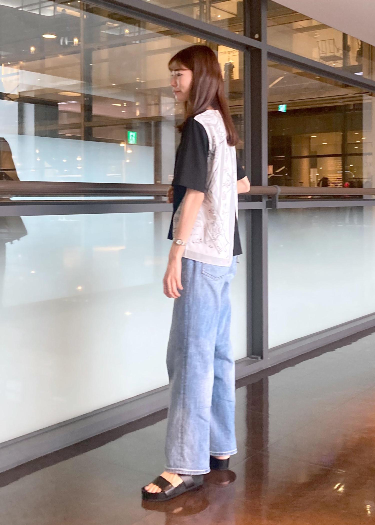 後ろのスカーフ柄プリントがアクセントとなるトップスです。一見シンプルなカットソーにみえますが、切り替えが少し前になっているため柄がみえ、1枚でも着映えしすっきりとしたスタイリングにまとめてくれるのも◎