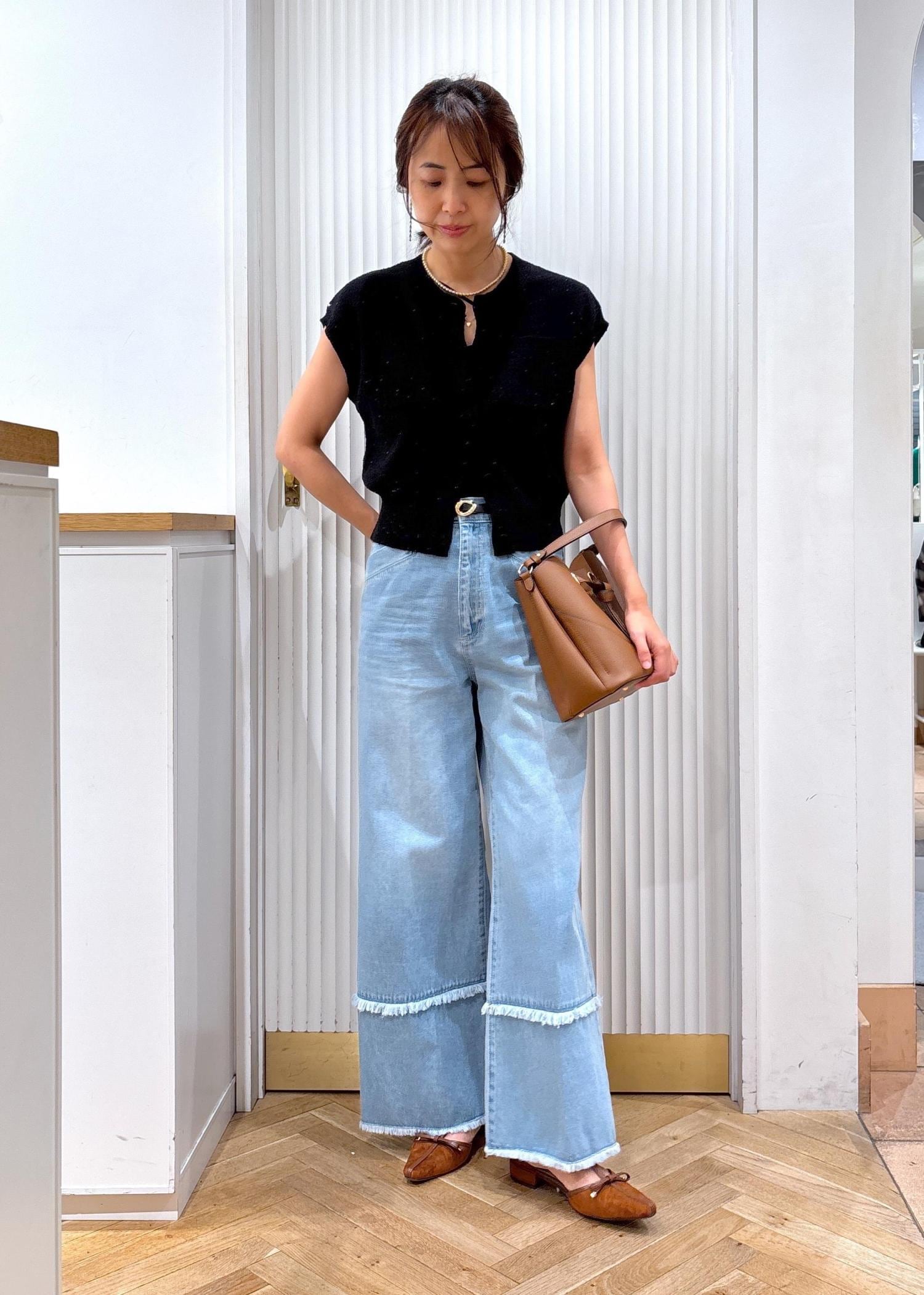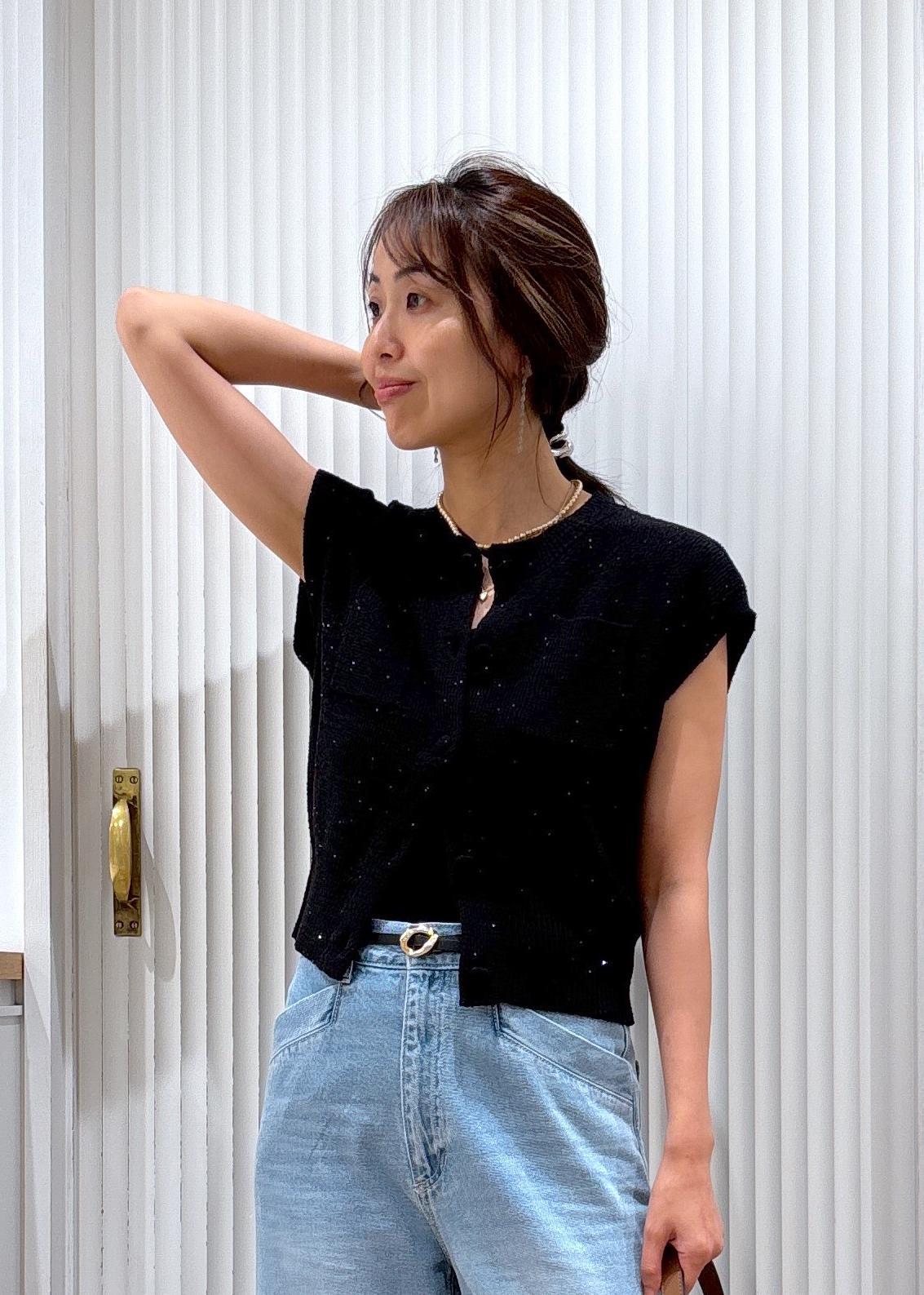 ブラックのカーディガンにデニムを組み合わせた、大人カジュアルスタイリングです。