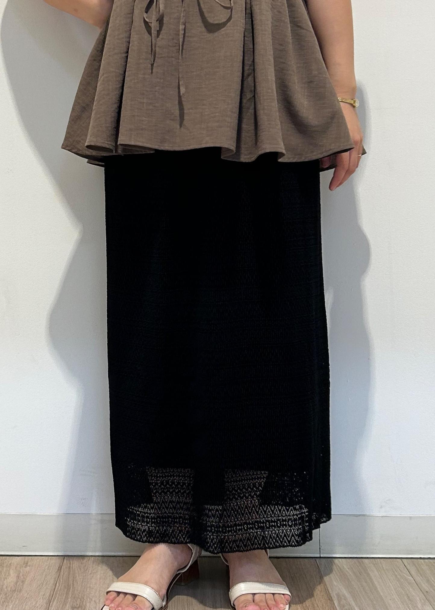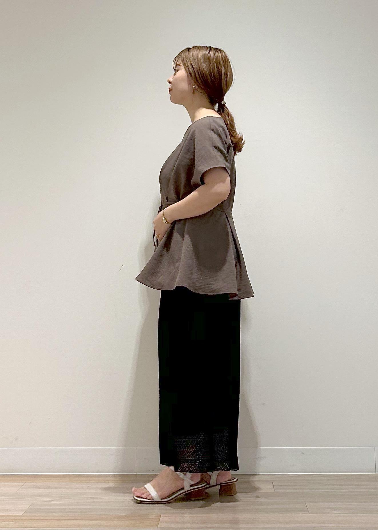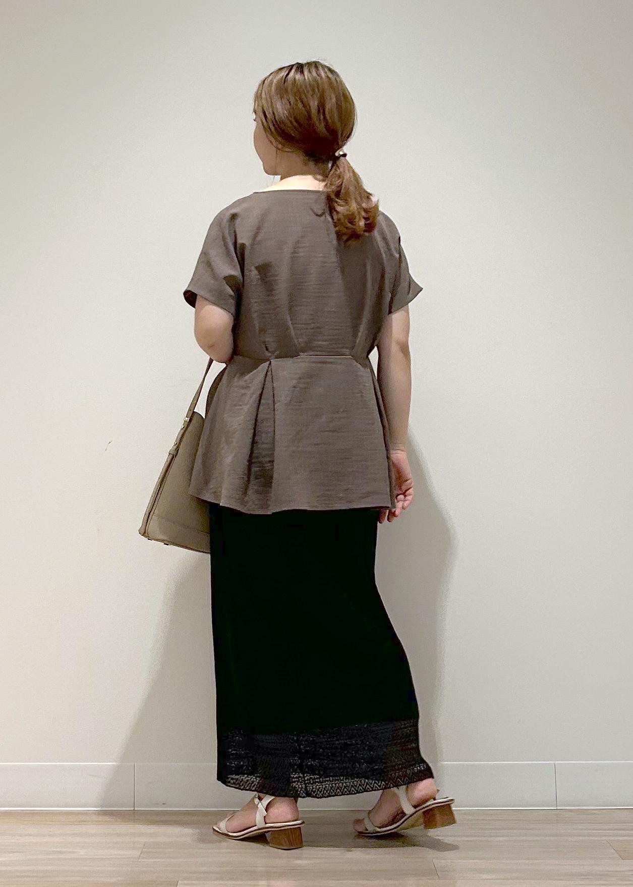 大人気のハートネックブラウスは、アイラインスカートで大人っぽく合わせました。ブラウン×ブラックのお色味で少し秋を意識したコーディネートにしています。